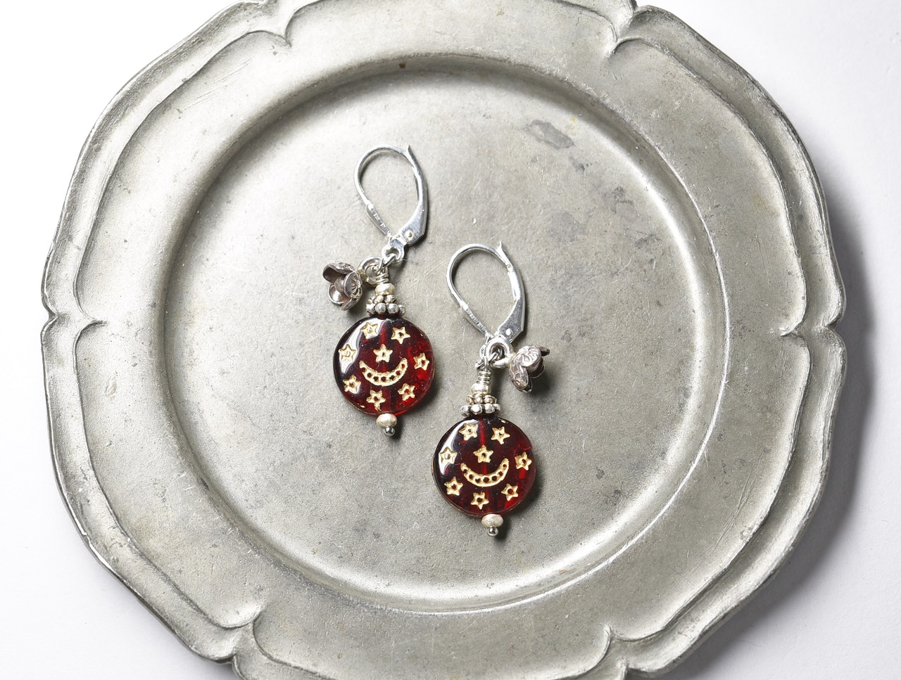 月と星の模様が施された聖者のビーズと、小さなカレンシルバーのお花を繋いだピアスです。