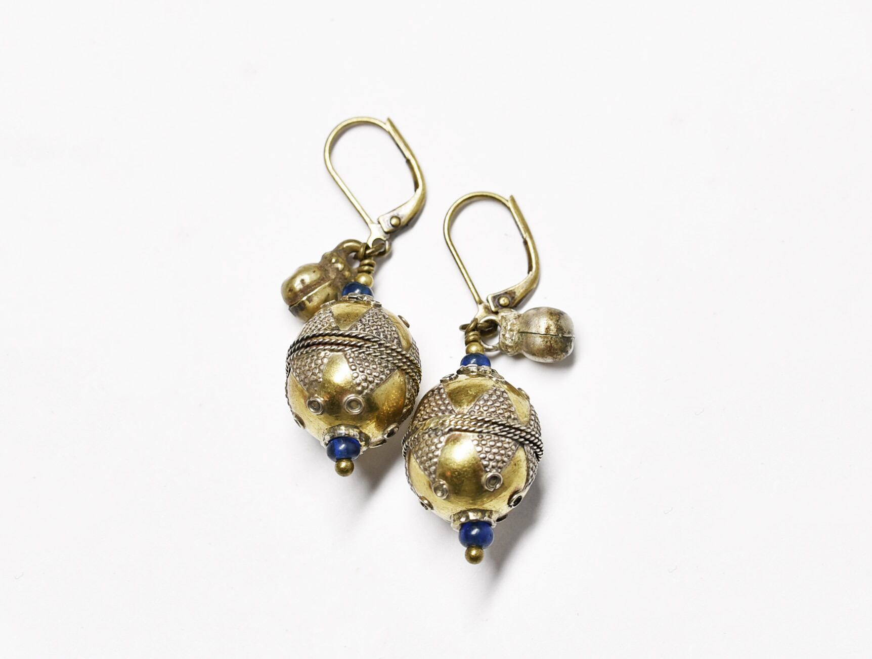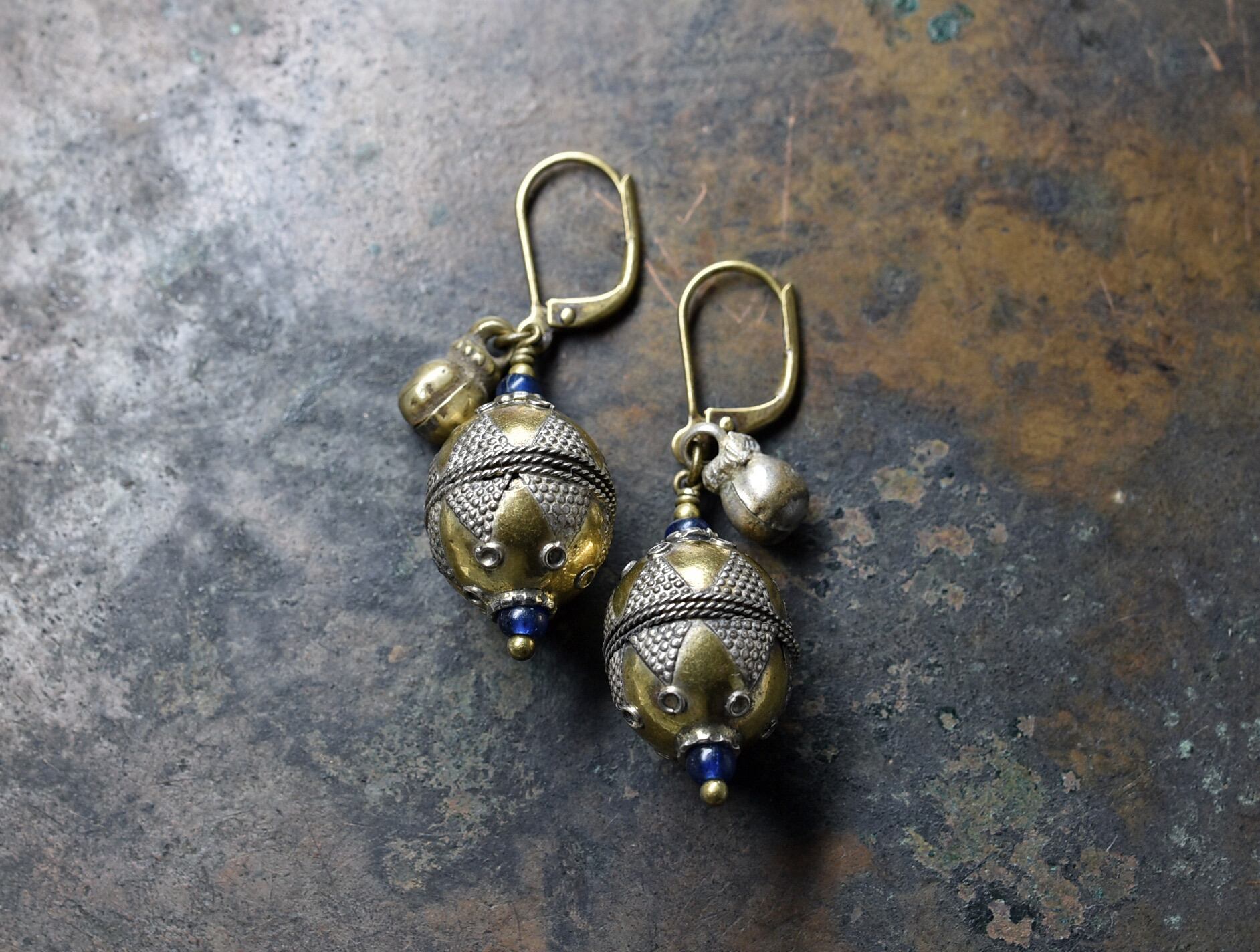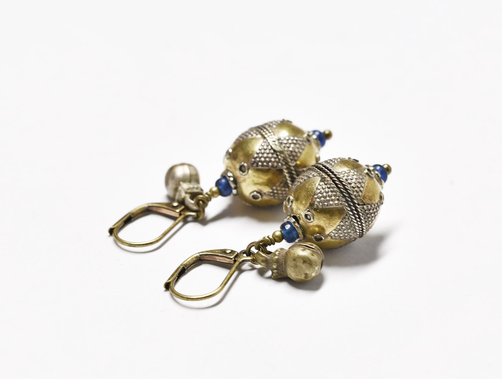 トルクメニスタンから届いたメタルビーズに、ダークブルーのアンティークビーズ、民族の鈴を繋いだピアスです。