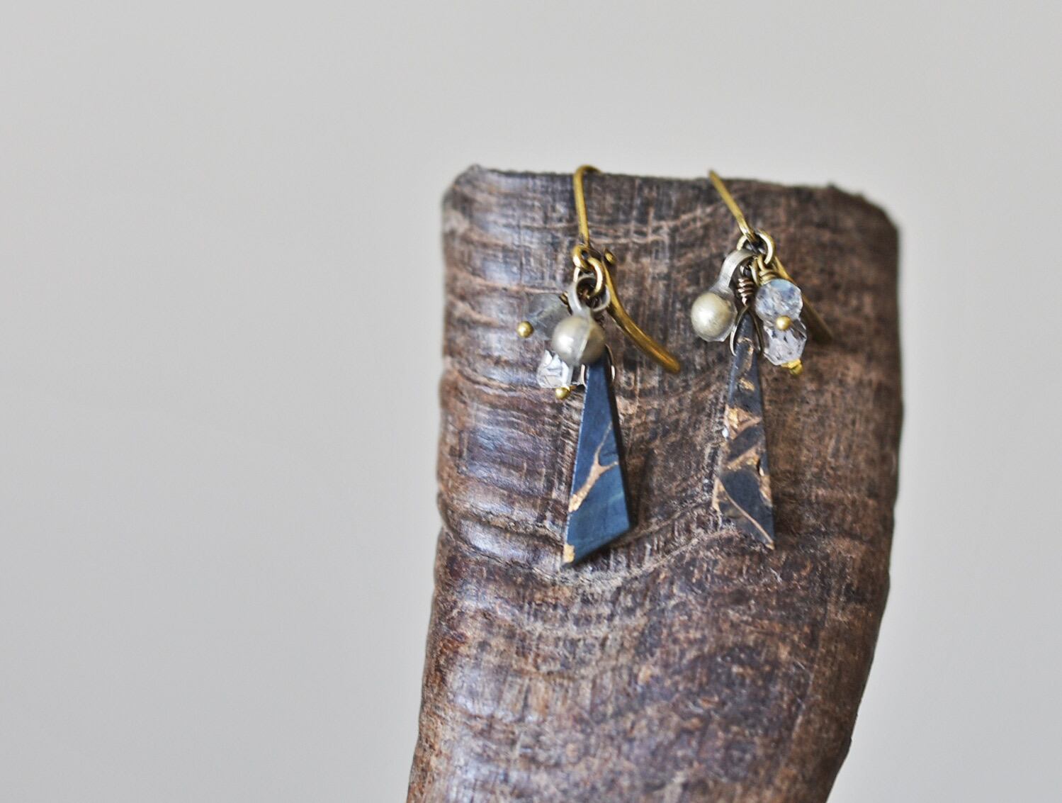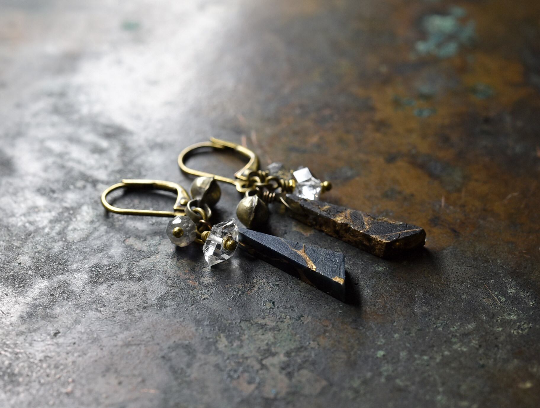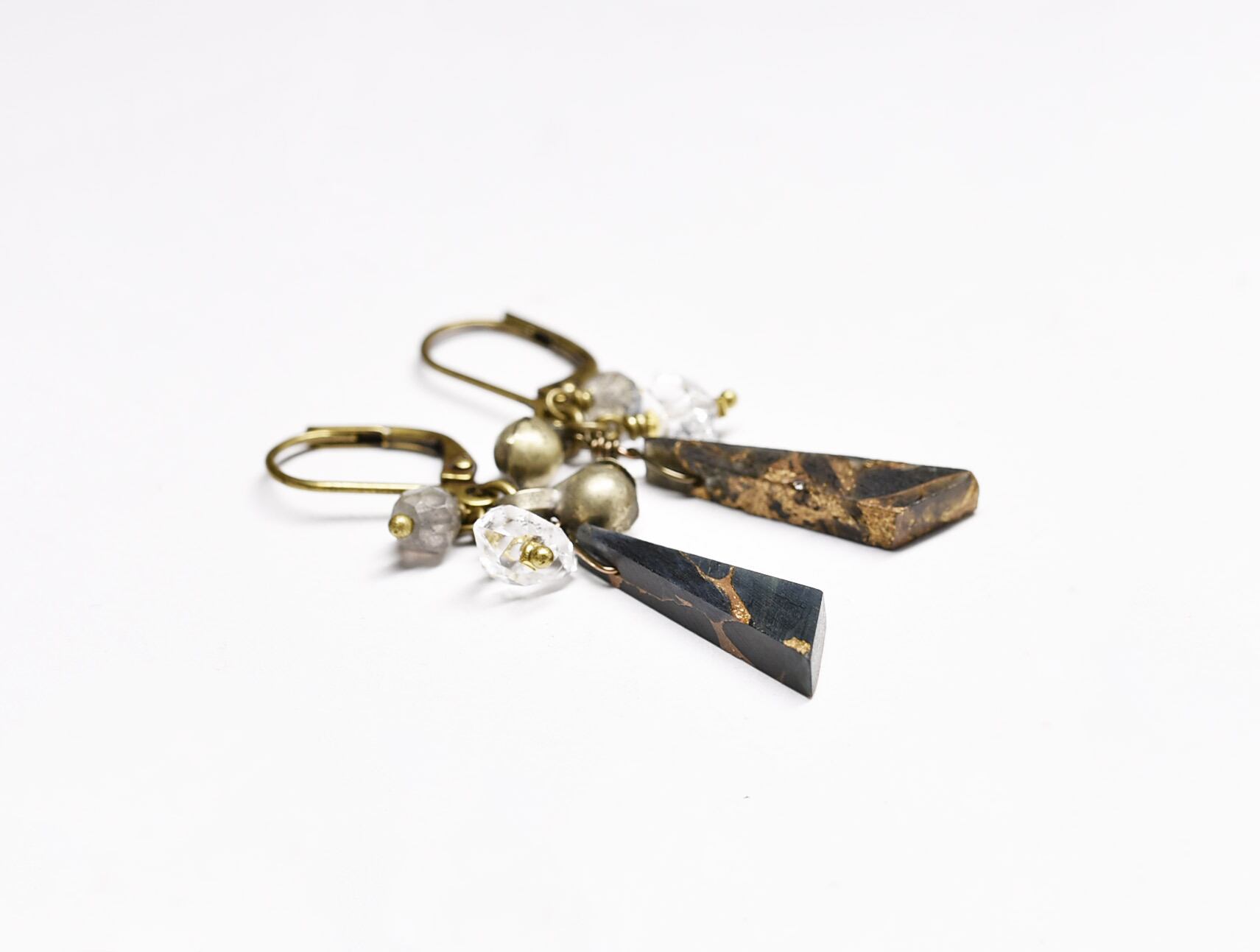 ブラックコッパーオブシディアンとラブラドライト、ハーキマーダイヤモンドと民族鈴を繋いだピアスです。