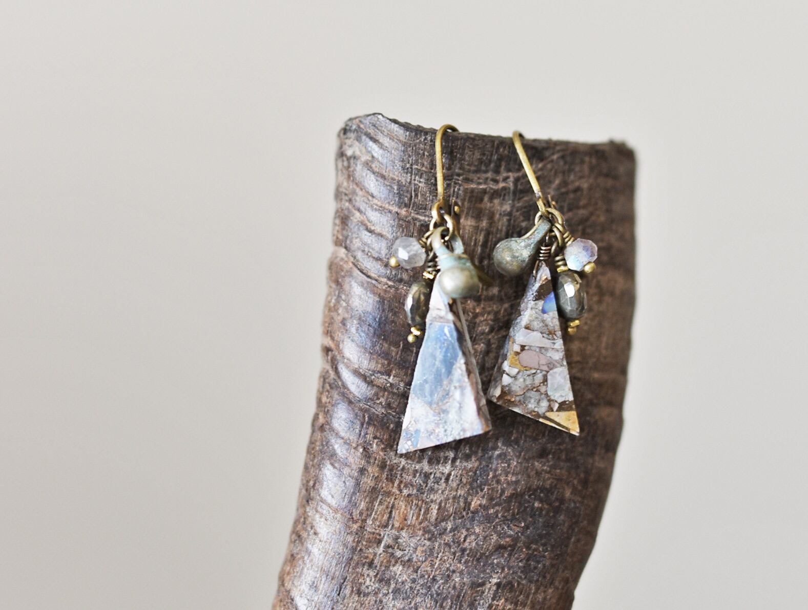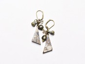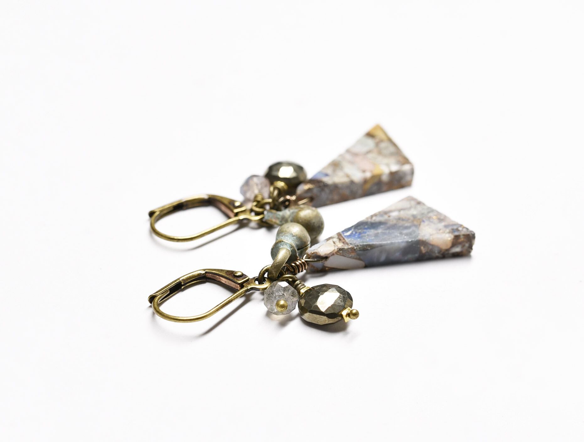 コッパーオパールとラブラドライト、ヘマタイトと民族鈴のピアス