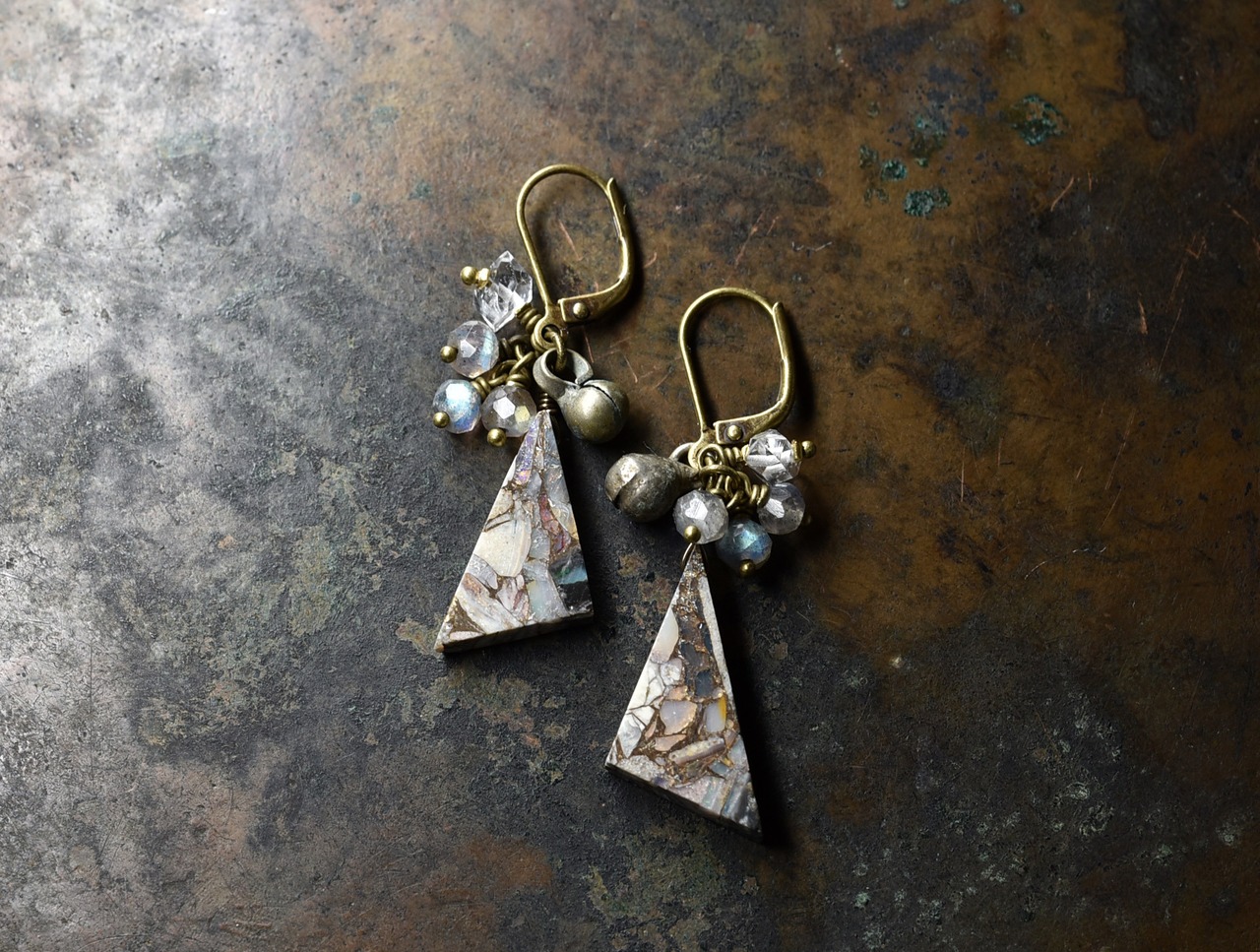 コッパーオパールとラブラドライト、ハーキマーダイヤモンドと民族鈴のピアス