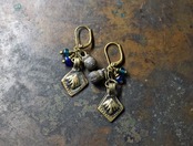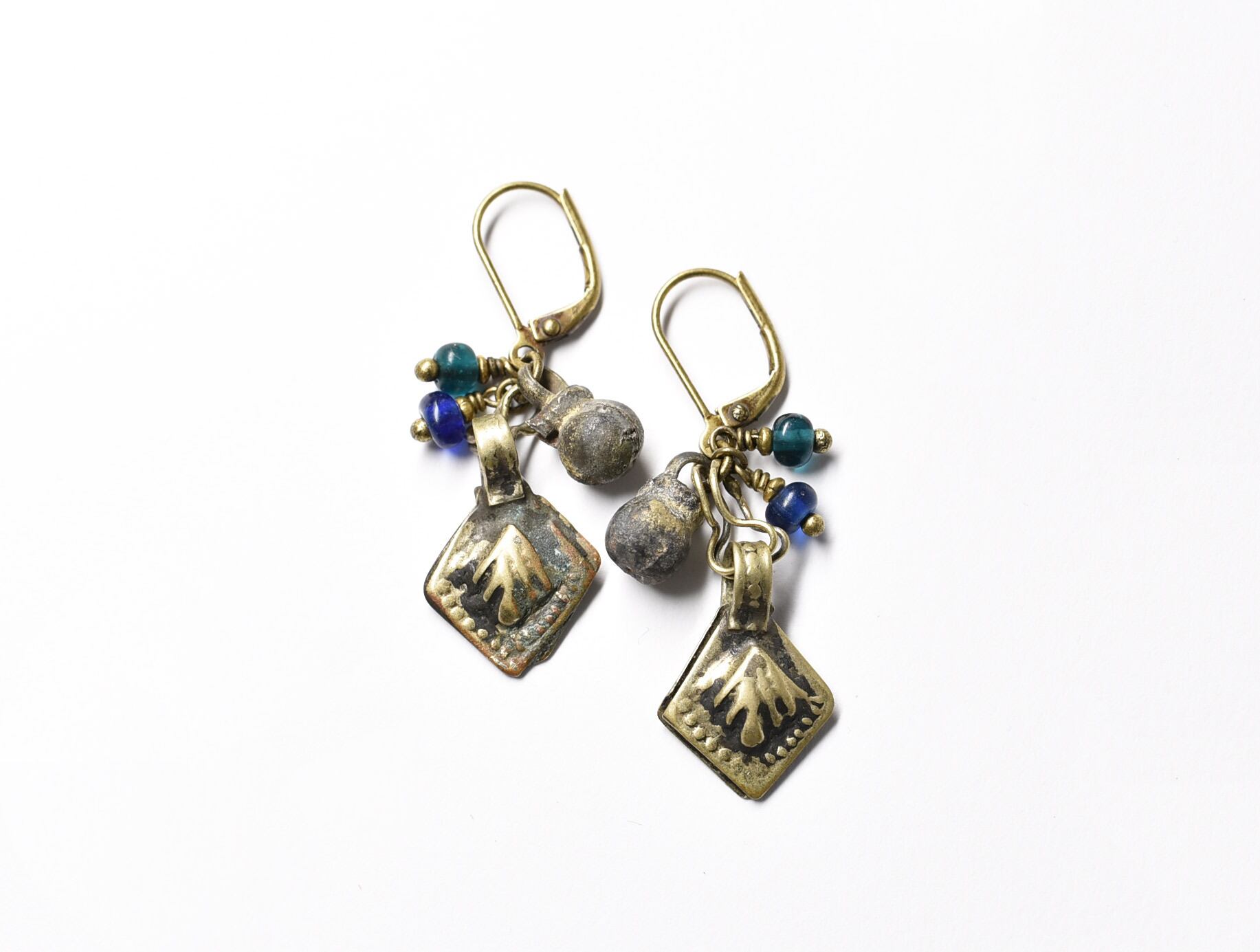 アフガニスタンメタルパーツと2種類のアンティークブルービーズ、民族鈴ピアス