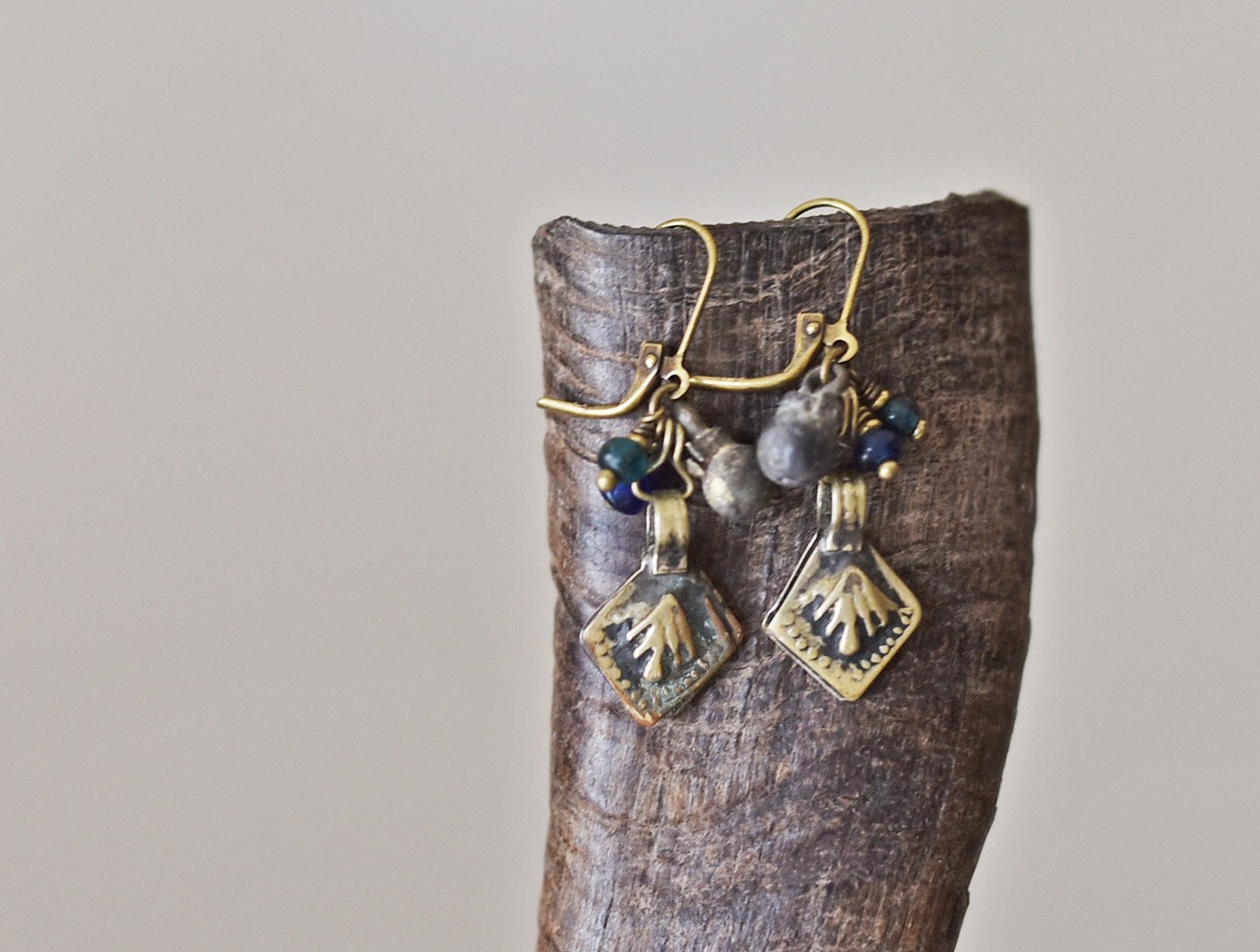 ぷっくりとしたスクエア型のパーツはアフガニスタンから届いたものです。民族衣装や装身具などに使われていたold品です。