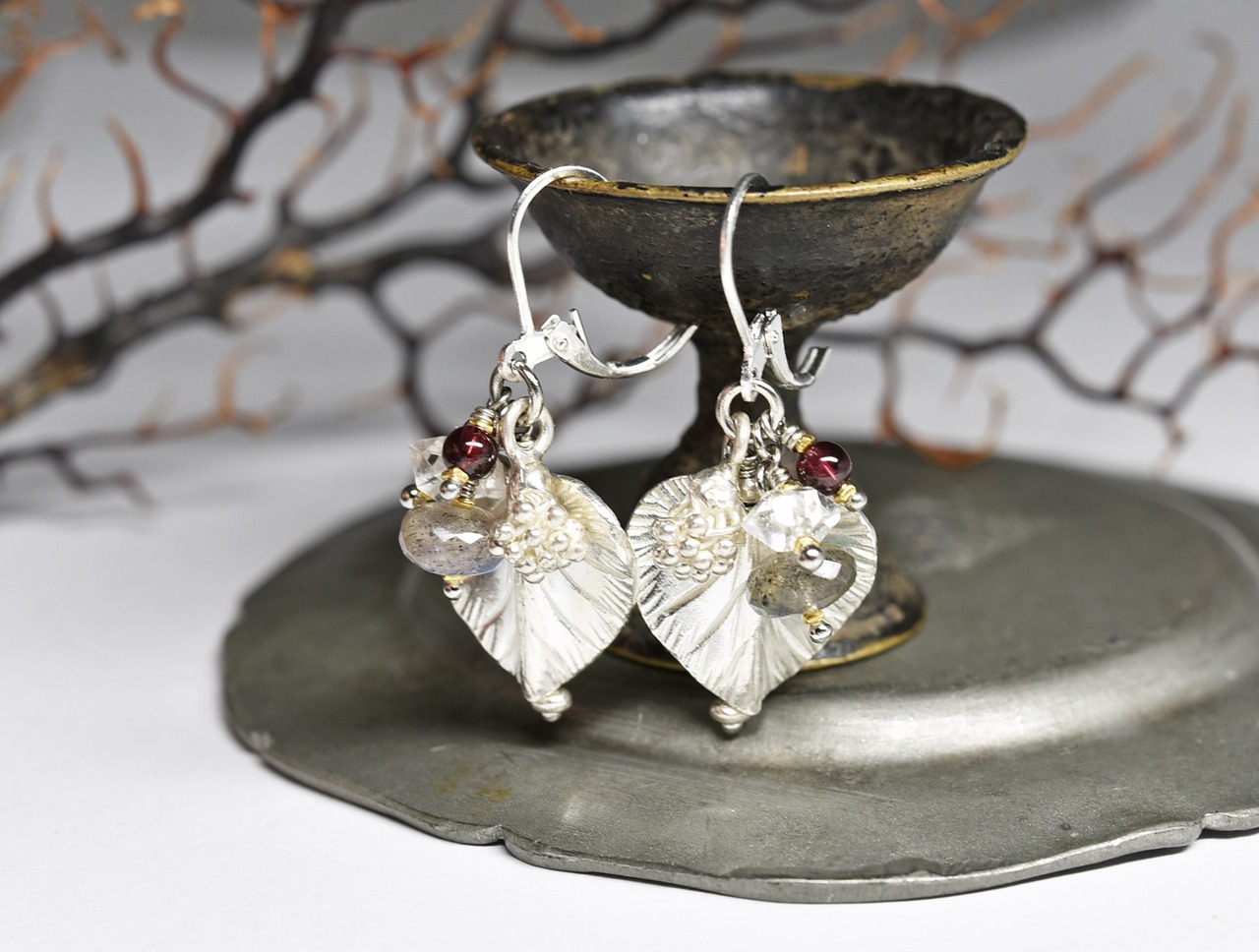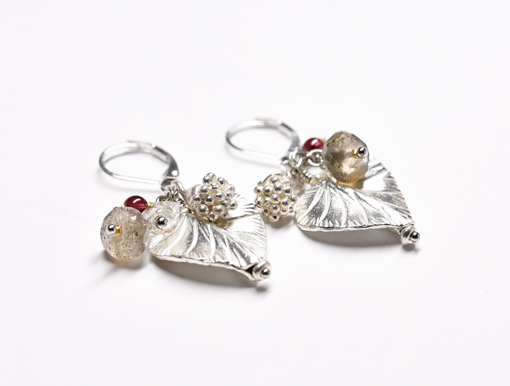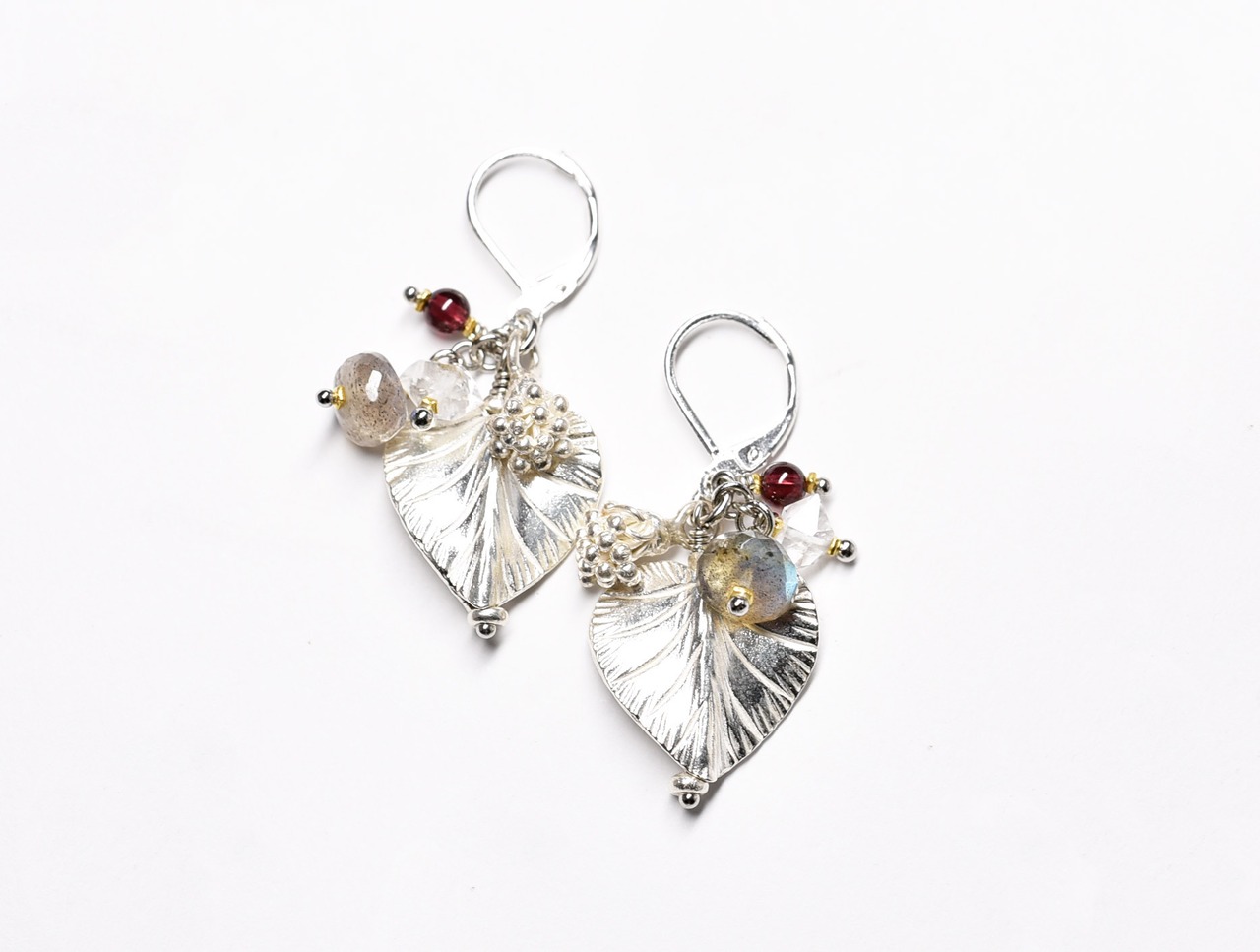 ハート型の葉っぱと蕾カレンシルバー、ラブラドライト、ハーキマーダイヤモンド、ガーネットのピアス