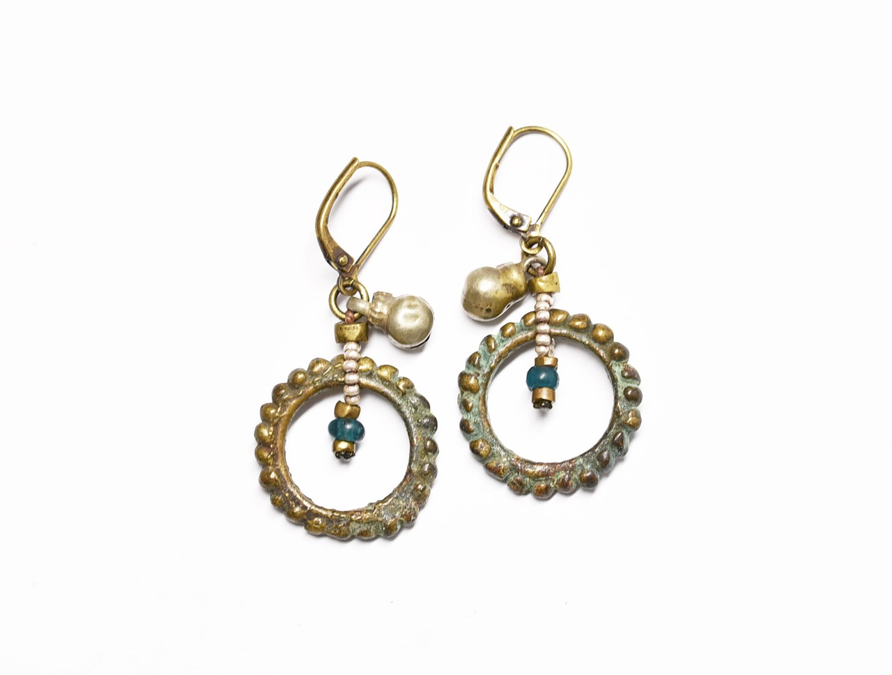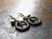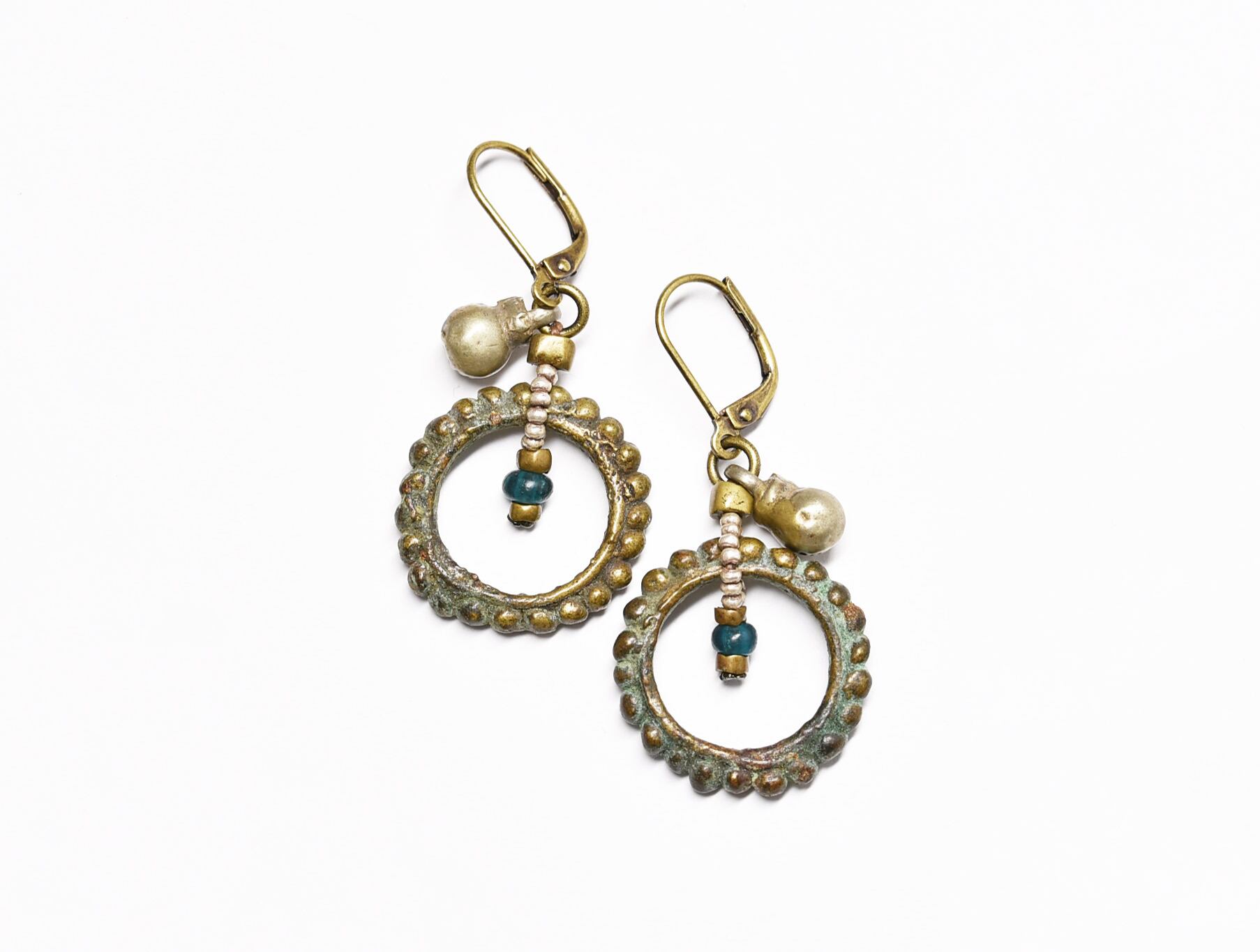 oldインドリングと一粒のインディゴブルーアンティークビーズ、oldオリッサブラス、小さなカレンシルバー、民族鈴を繋いだピアスです。