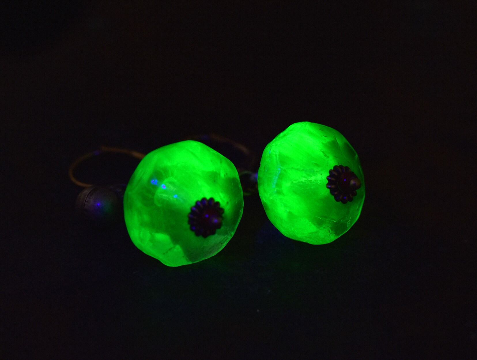 独特なセミクリアグリーンのビーズは、極々微量のウランで発色させています。ブラックライトを当てると光ります!