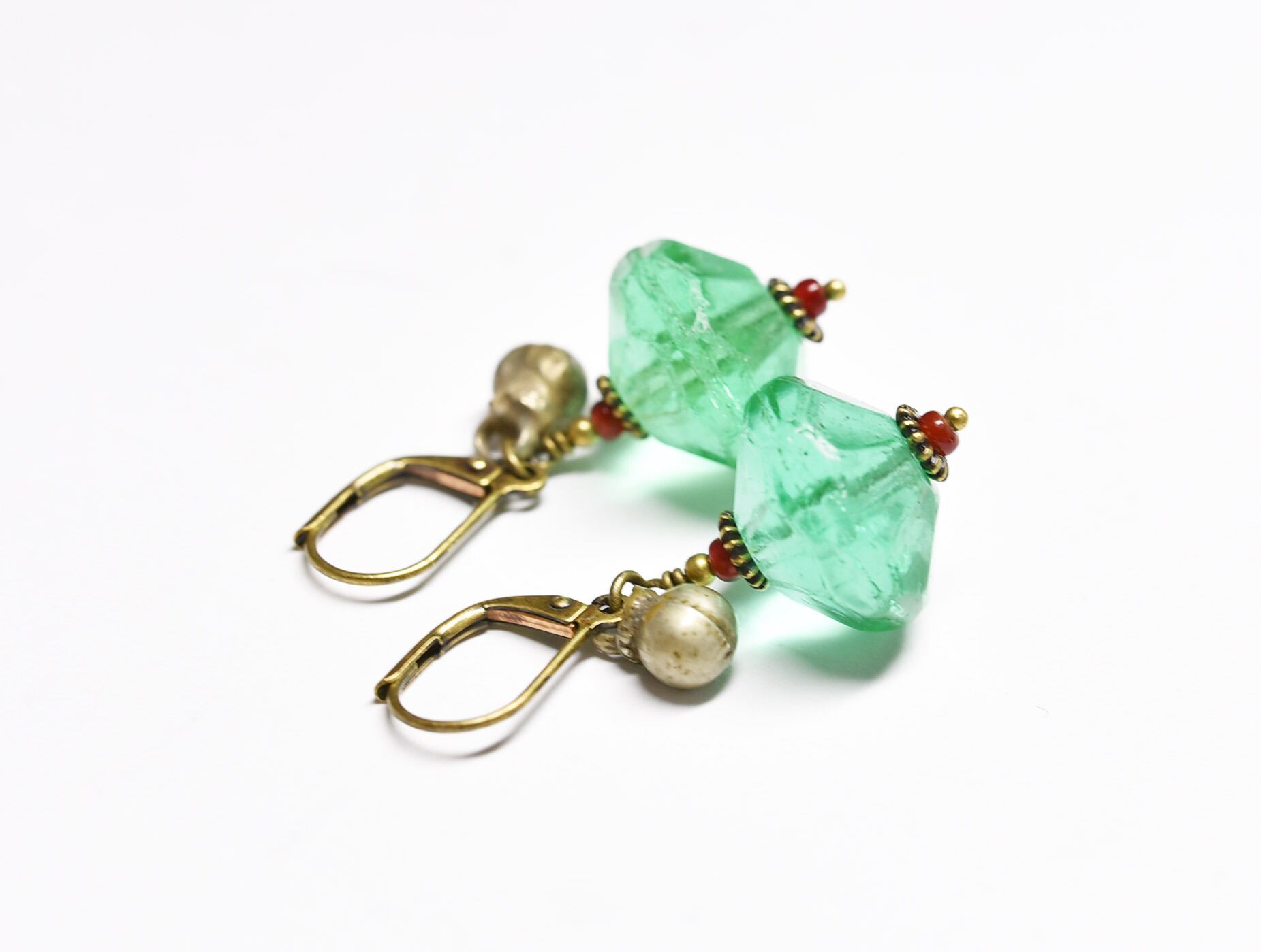 アンティークウランガラスとホワイトハーツ、民族鈴のピアス