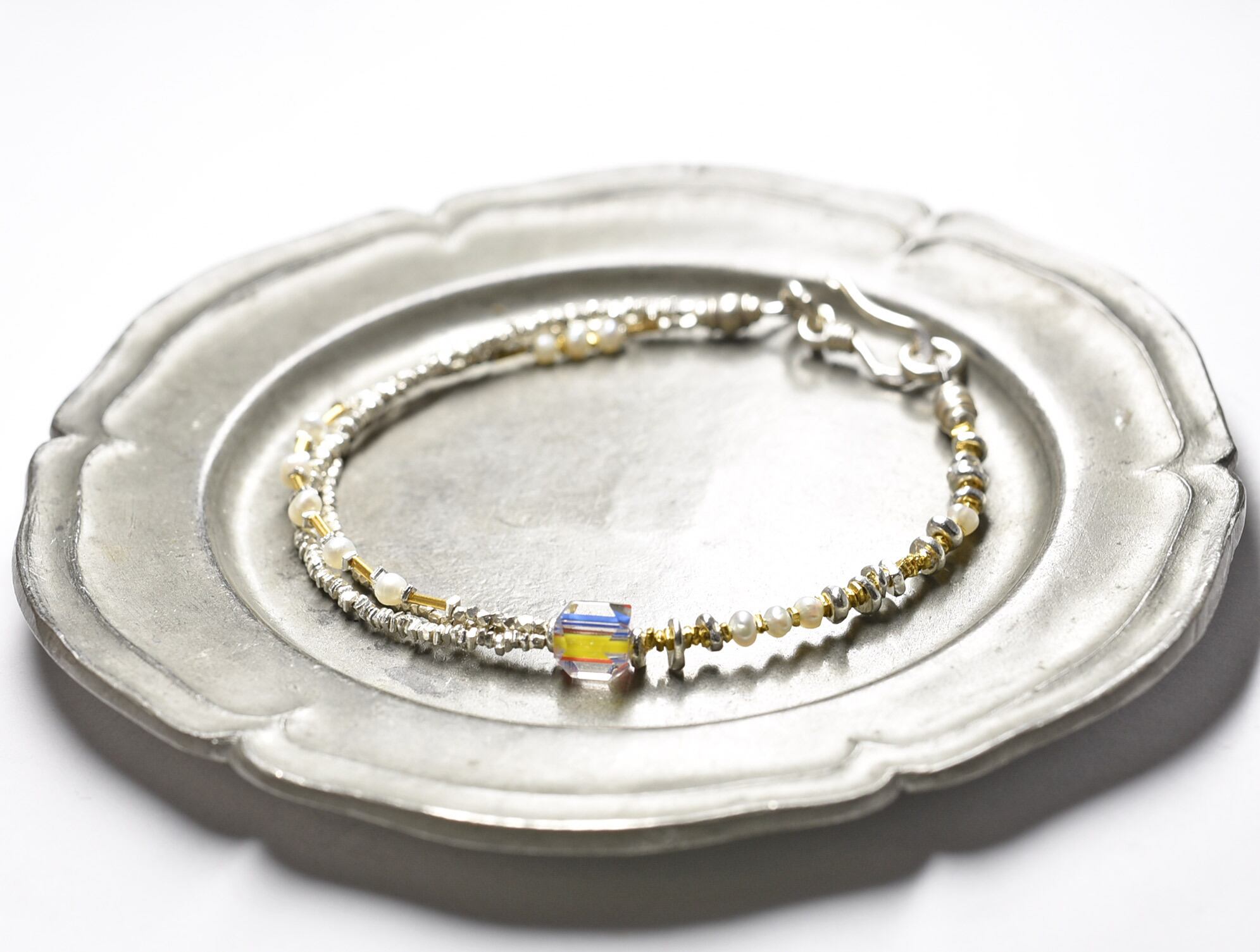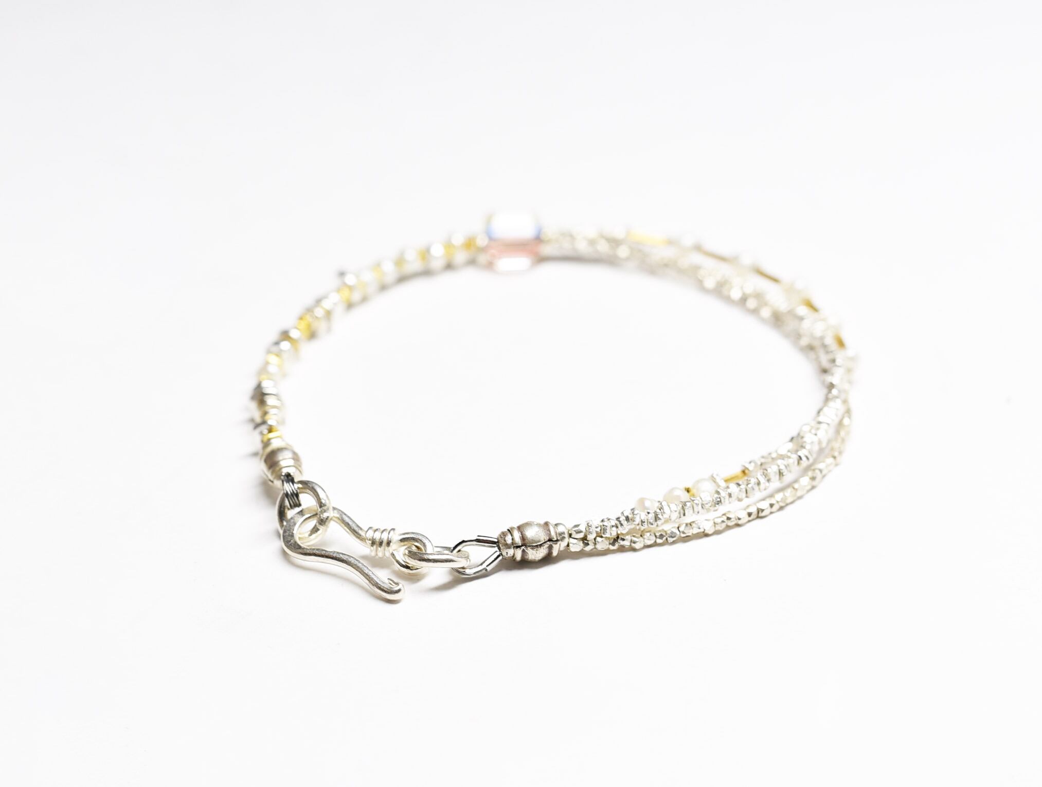 さざれ型のものと小さな多面体型、18金コーティングされたさざれ型と管型のカレンシルバービーズで繋いでいます。