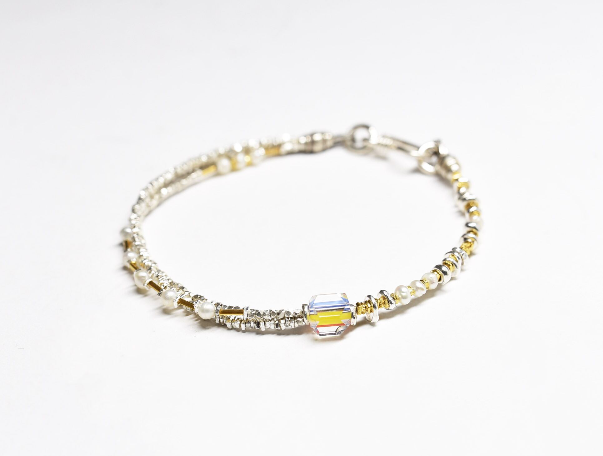 控え目な雰囲気の中に、煌めきと彩が楽しめるブレスです。