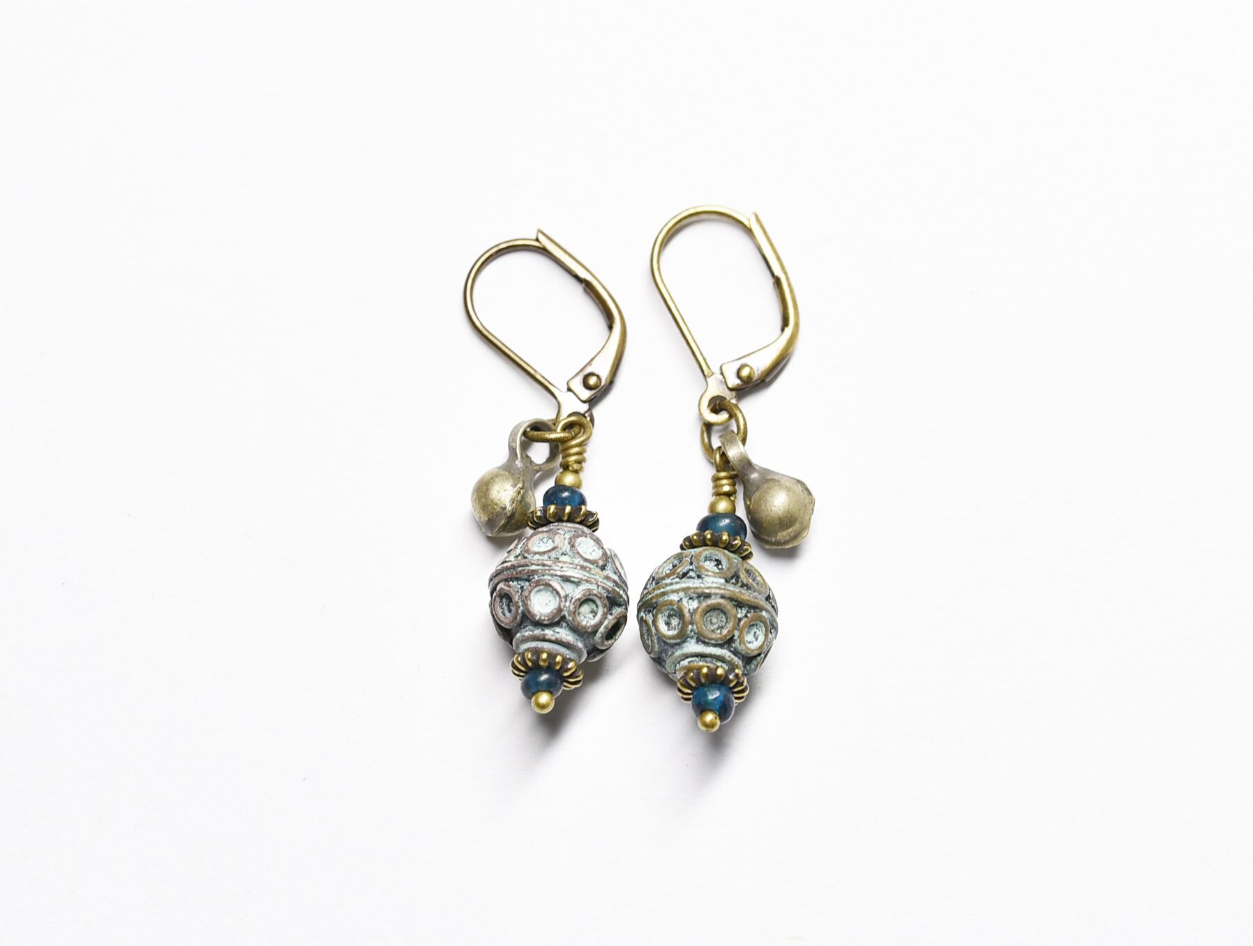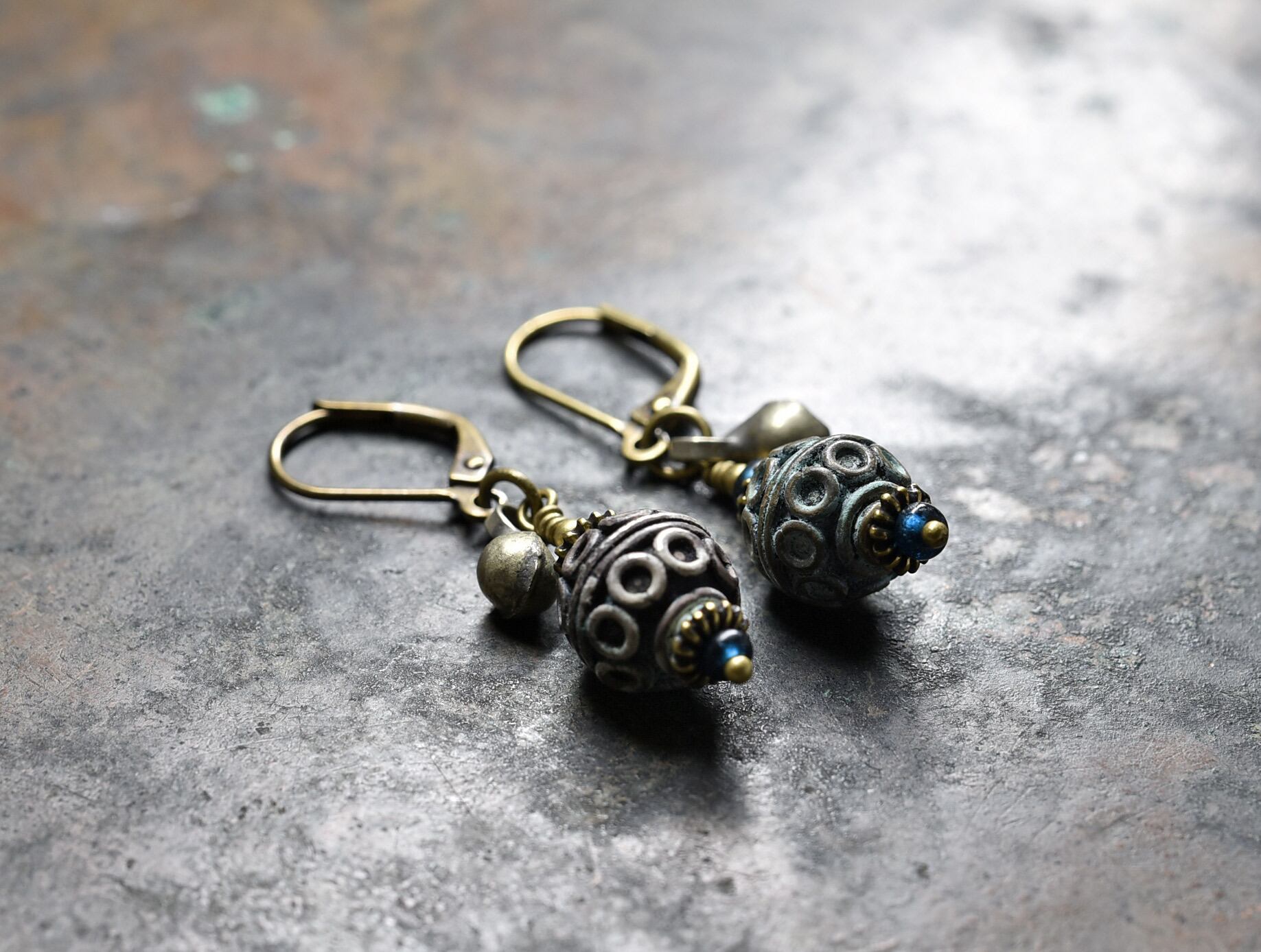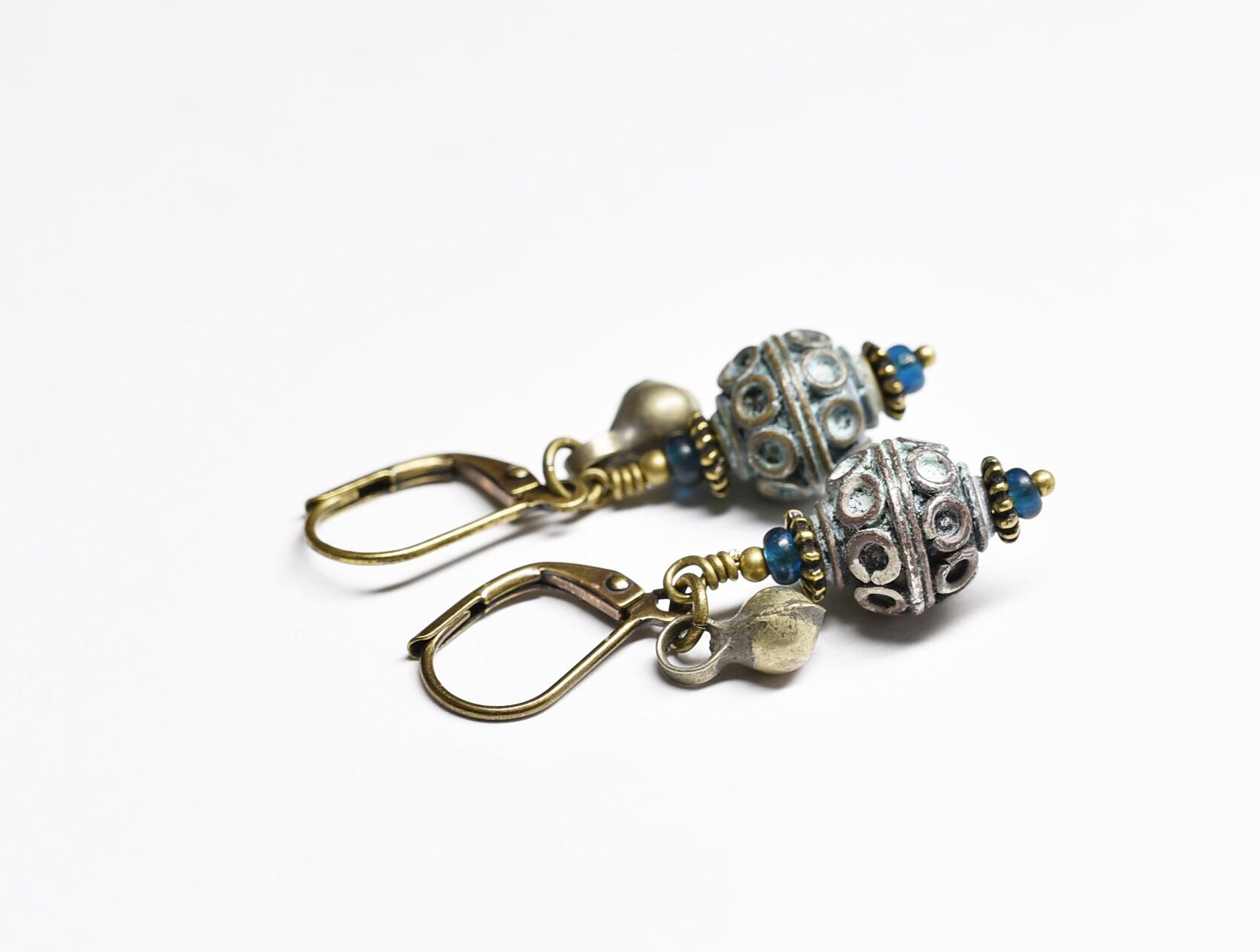 アフガニスタンメタルパーツとインディゴブルービーズ、民族鈴のピアス