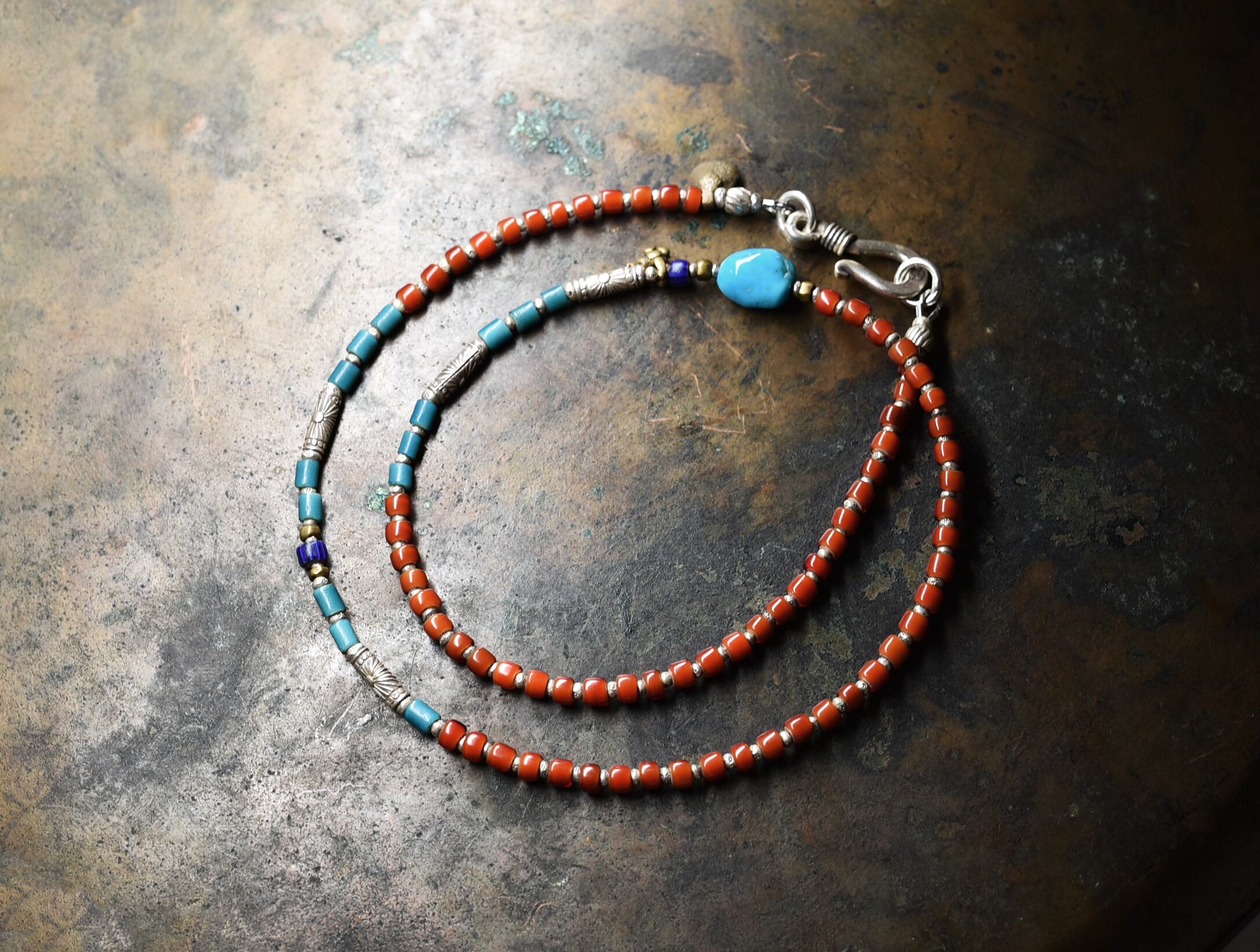 金色のビーズやターコイズの隣の小さなチャームはoldオリッサブラスです。インドのオリッサ州から届いた古くて希少なビーズです。