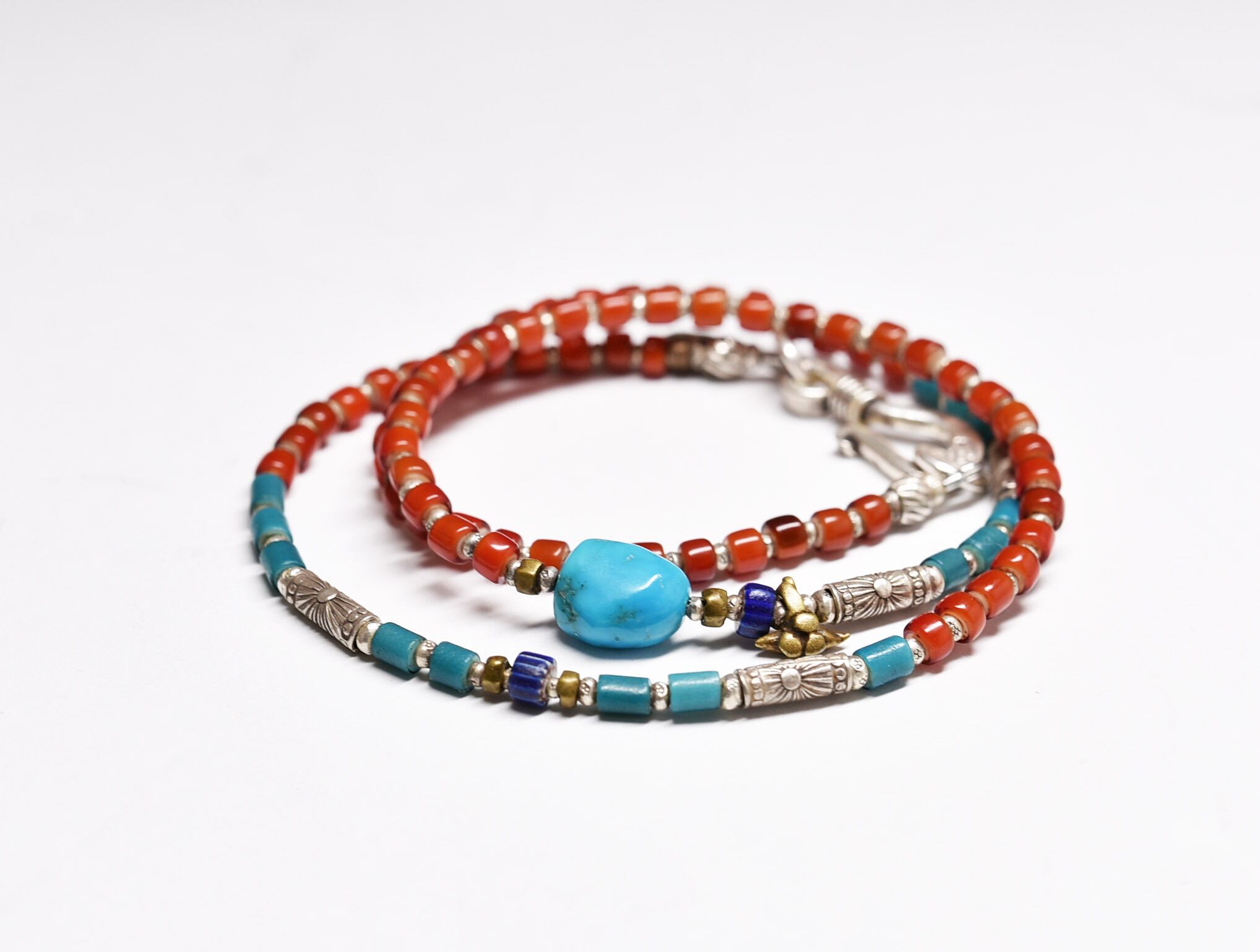 少しくすんだターコイズブルーのビーズや赤色のビーズはホワイトハーツです。