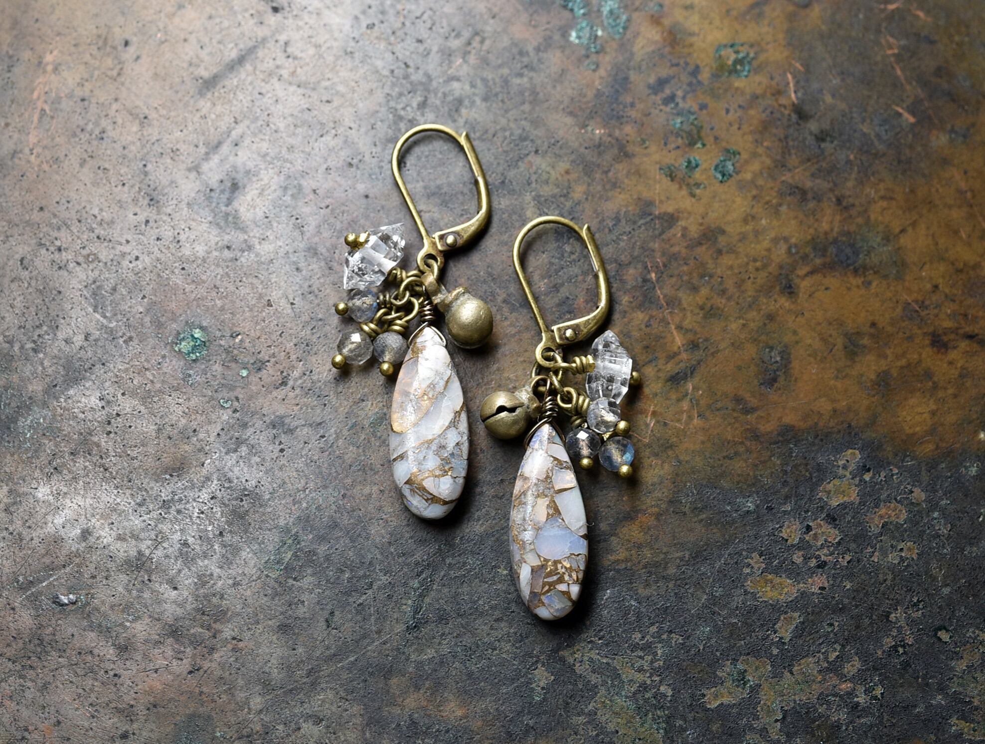 雫型コッパーオパールとラブラドライト、ハーキマーダイヤモンドと民族鈴のピアス