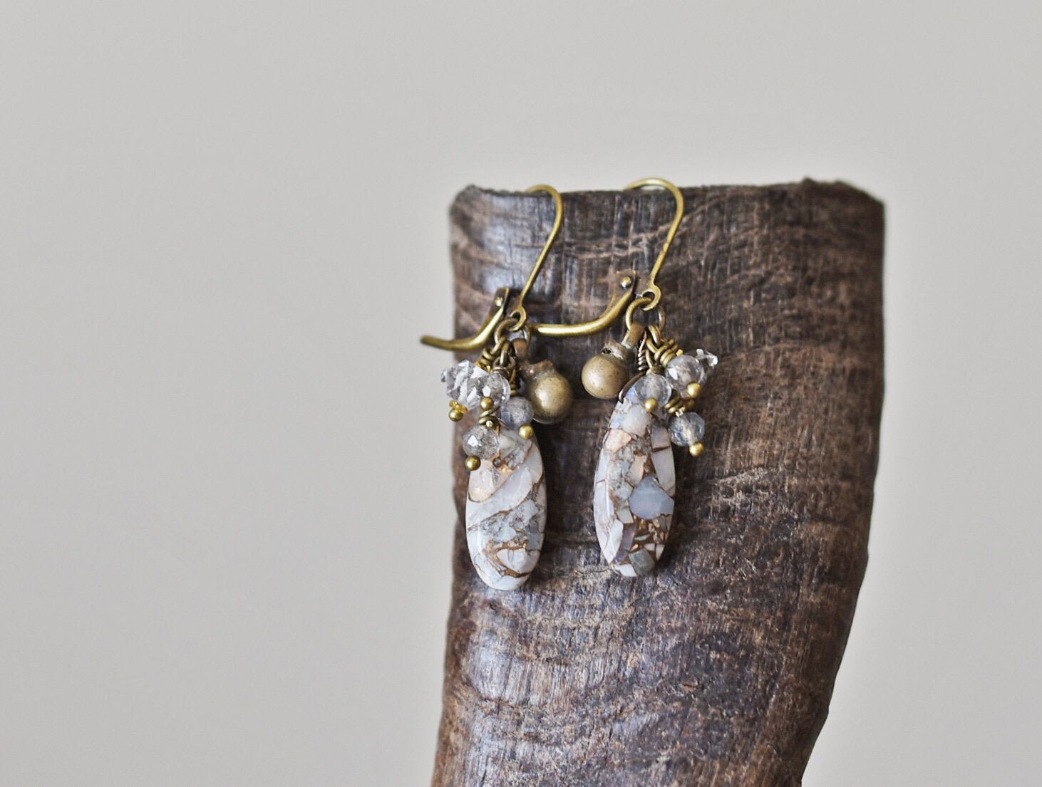 コッパーオパールとラブラドライト、ハーキマーダイヤモンドと民族鈴を繋いだピアスです。