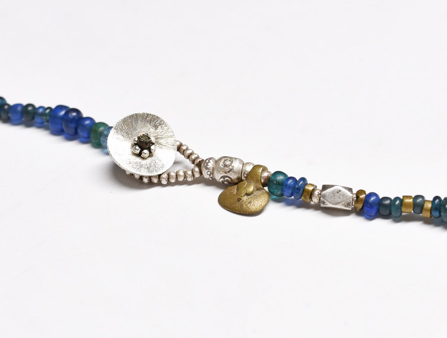 素材:古代水晶、oldチベタンターコイズ、oldチンシルバー、古代カーネリアン、古代瑪瑙、ガラス、カレンシルバー、oldオリッサブラス、ロウビキ紐