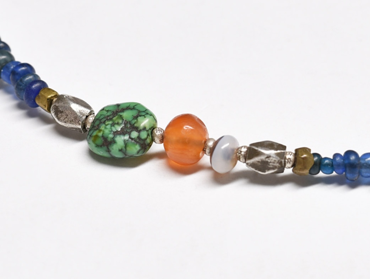 古代水晶とoldチベタンターコイズ、古代カーネリアン&瑪瑙、oldチンシルバー、ブルーミックスアンティークビーズのネックレス