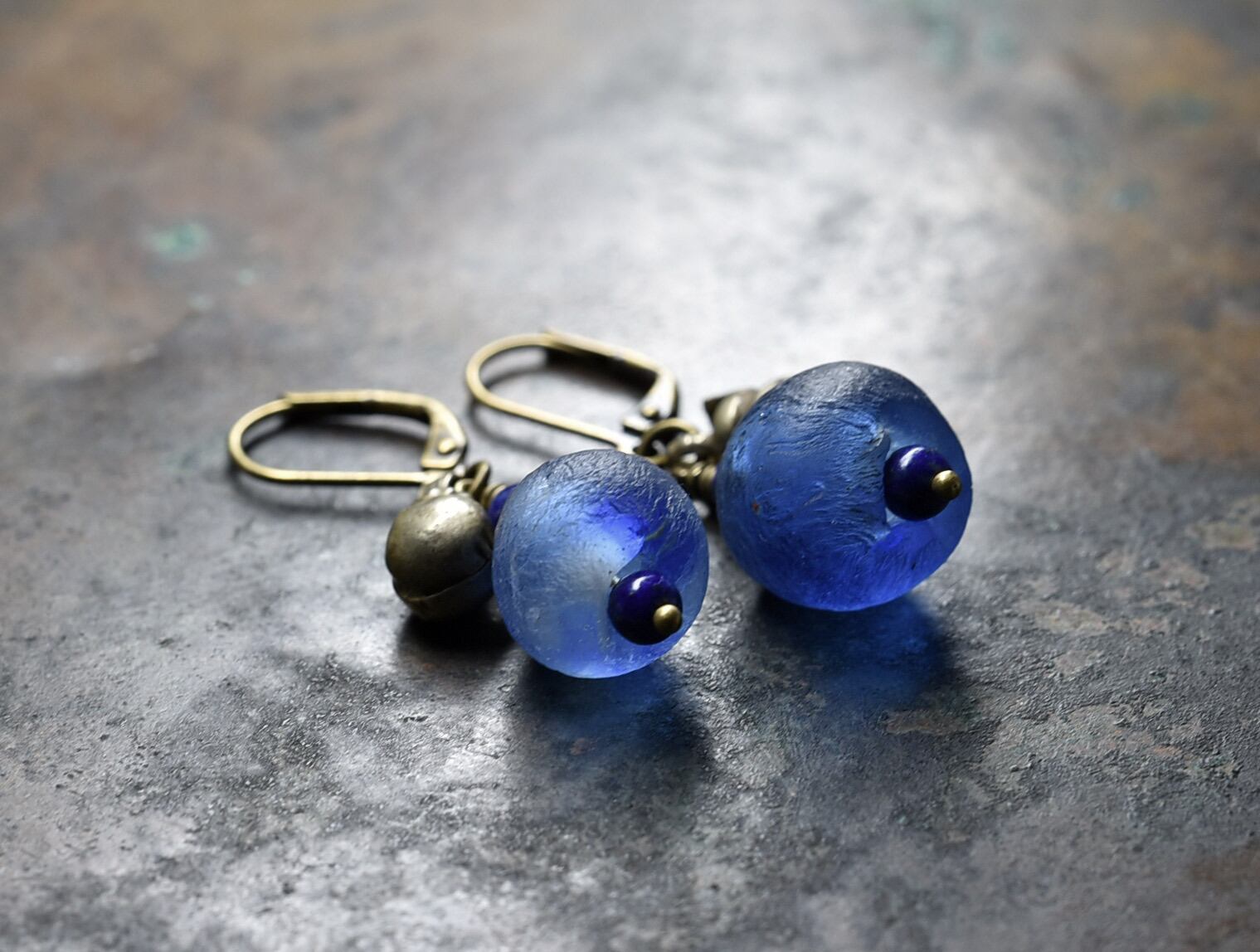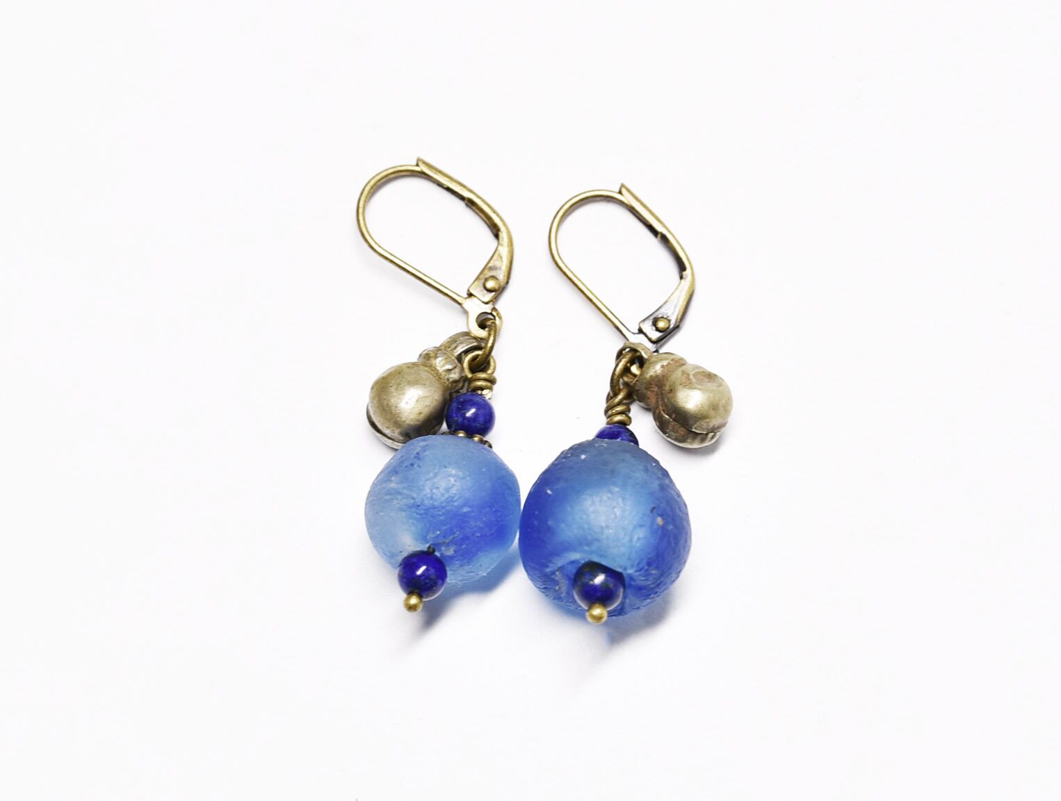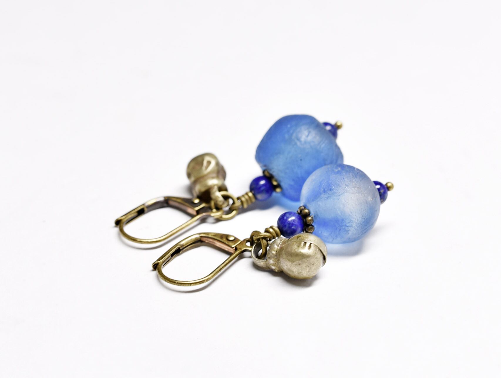 ブルーアフリカンパウダーグラスとラピス、民族鈴のピアス