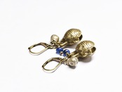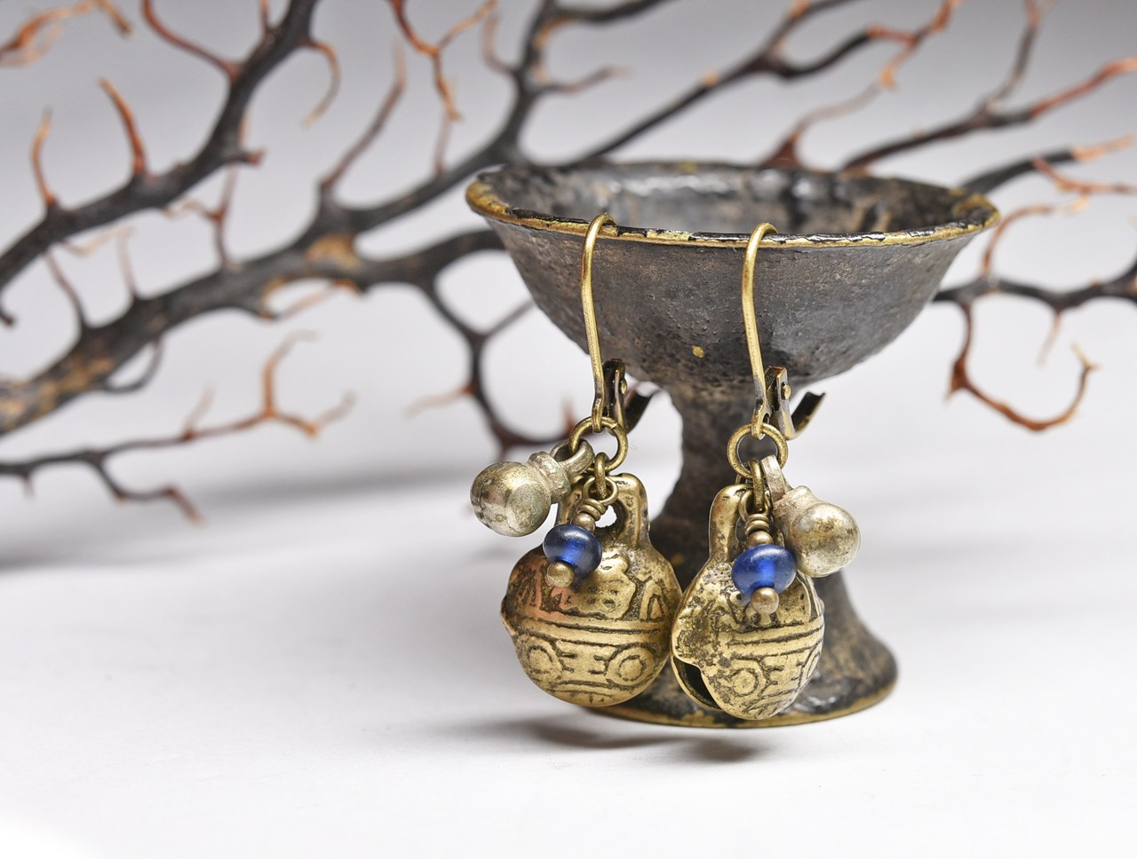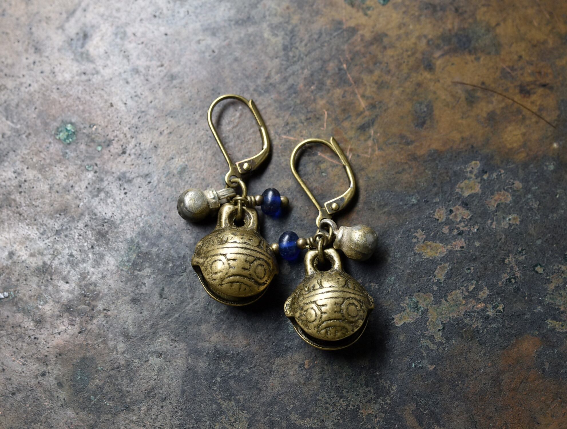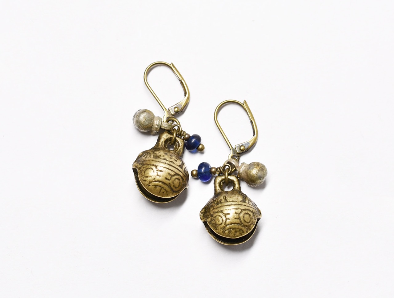 デッドストックベルと民族鈴、ダークブルービーズのピアス