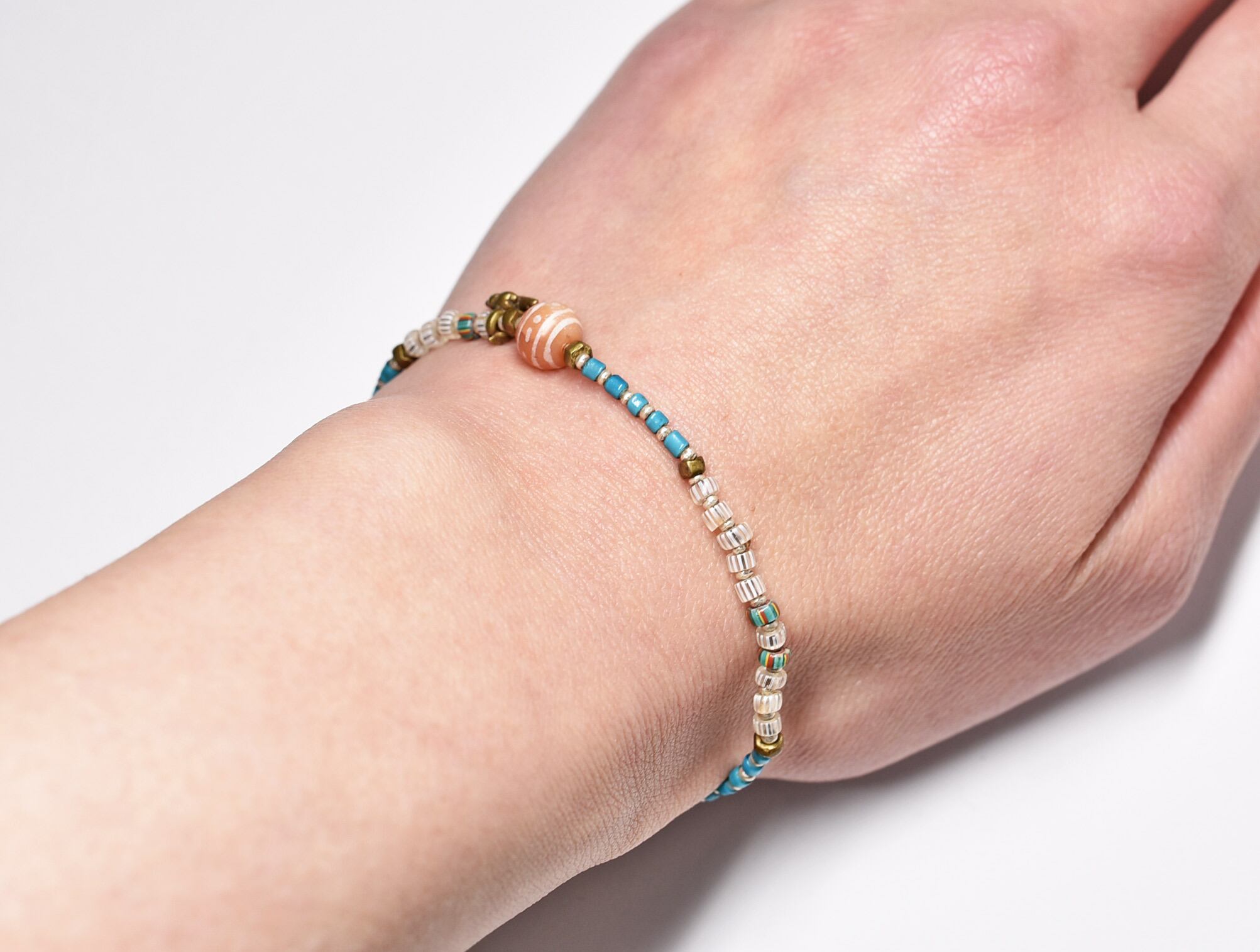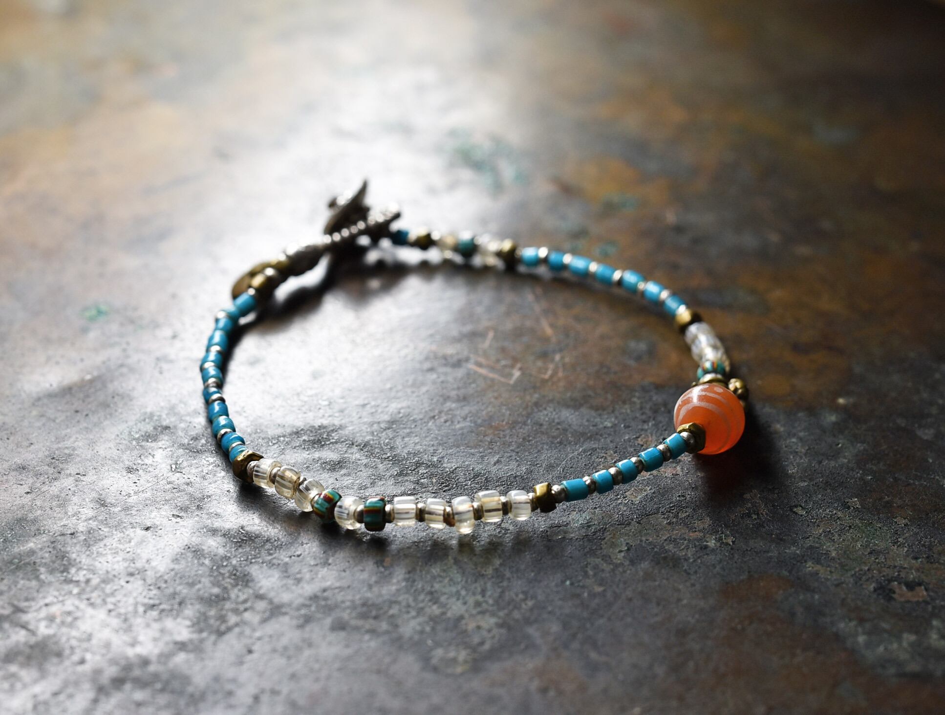 エッチドカーネリアンとターコイズブルーホワイトハーツ、グーズベリー、カレンシルバー、oldオリッサブラスを繋いだブレスです。