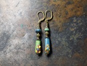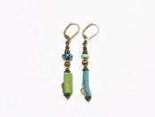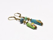 モザイク模様が施されたローマングラスとブラスビーズ、ターコイズを繋いだアンシメトリーなピアスです。