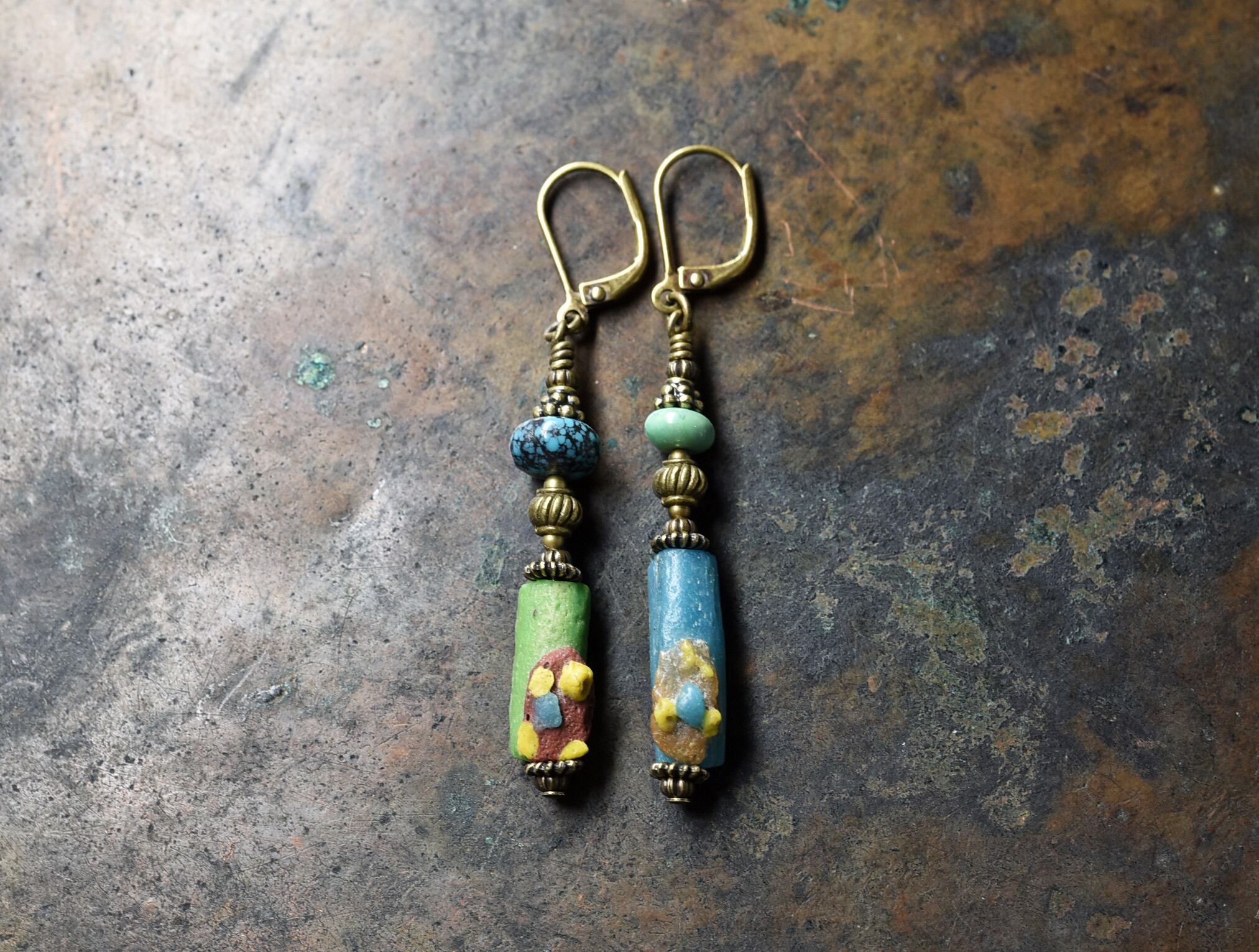 モザイク模様ローマングラスとターコイズ、ブラスビーズのアンシメトリーピアス