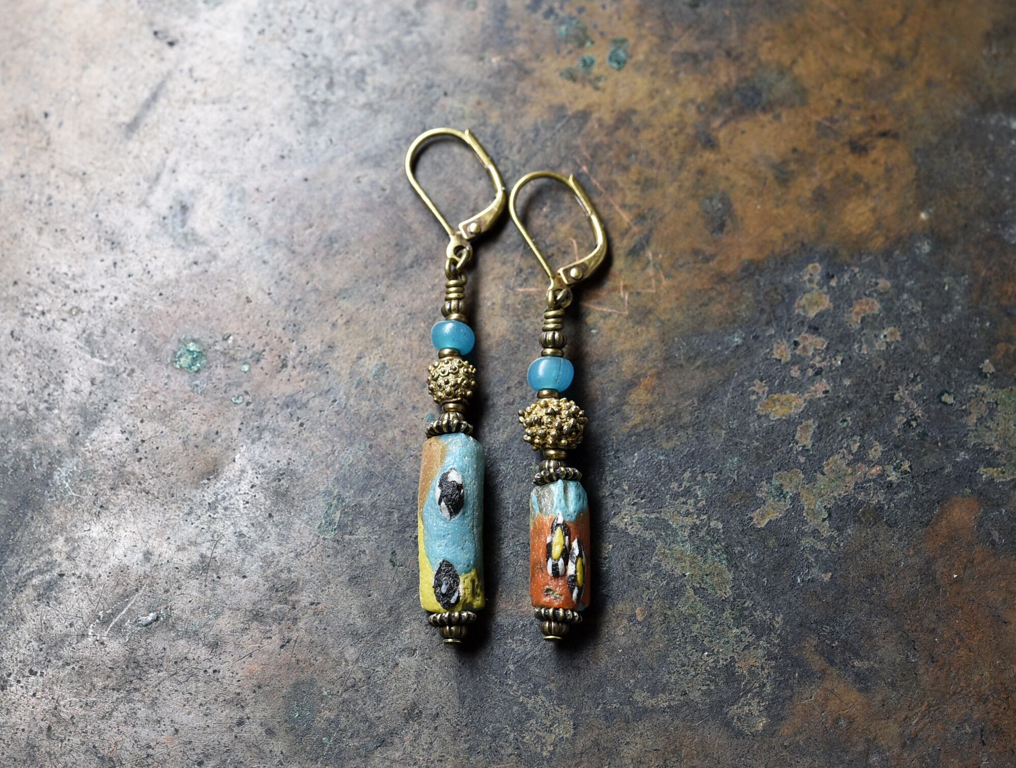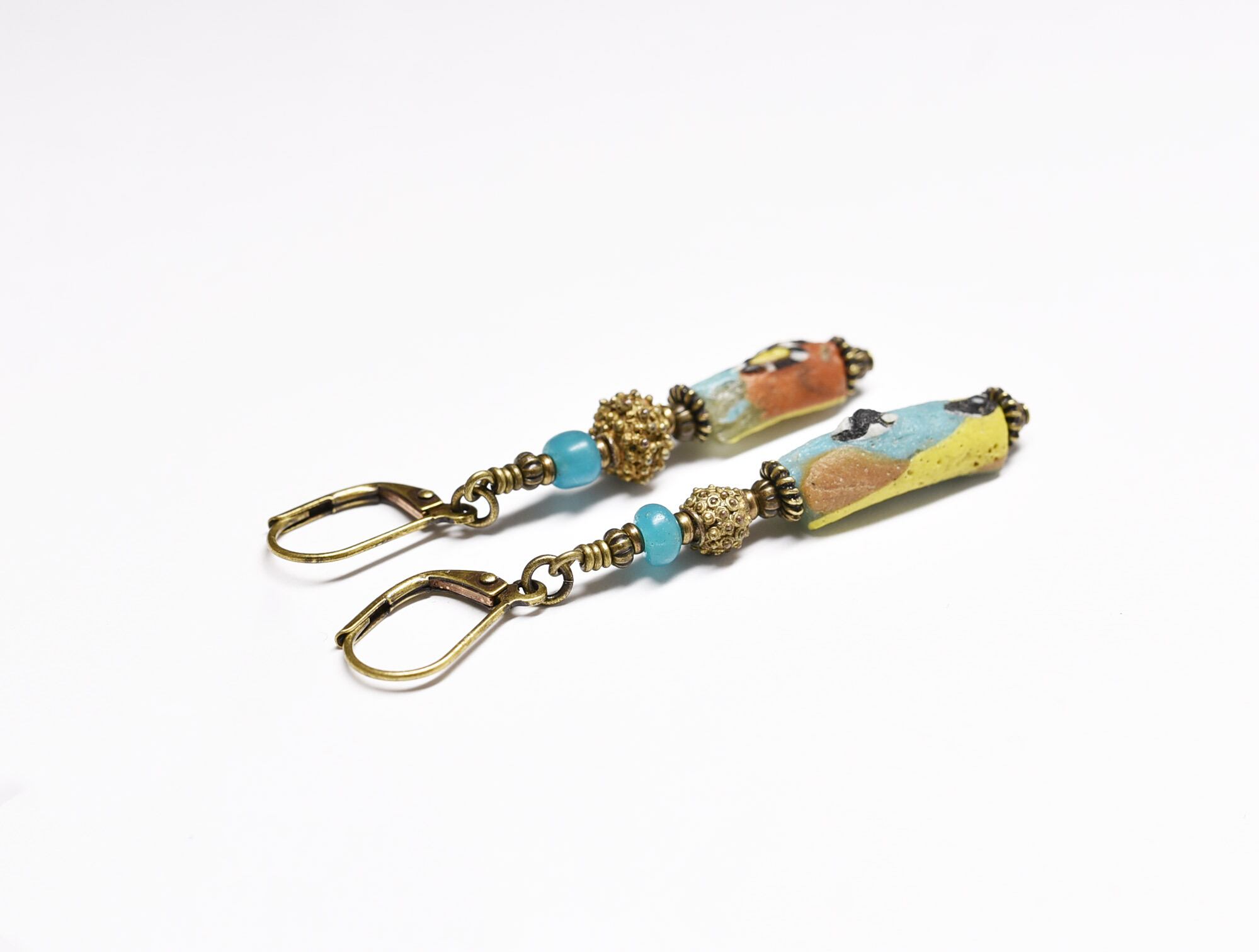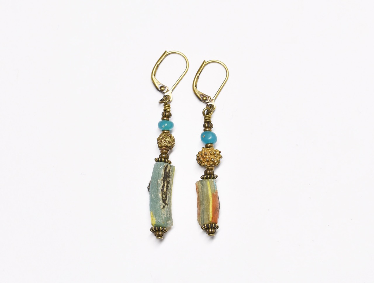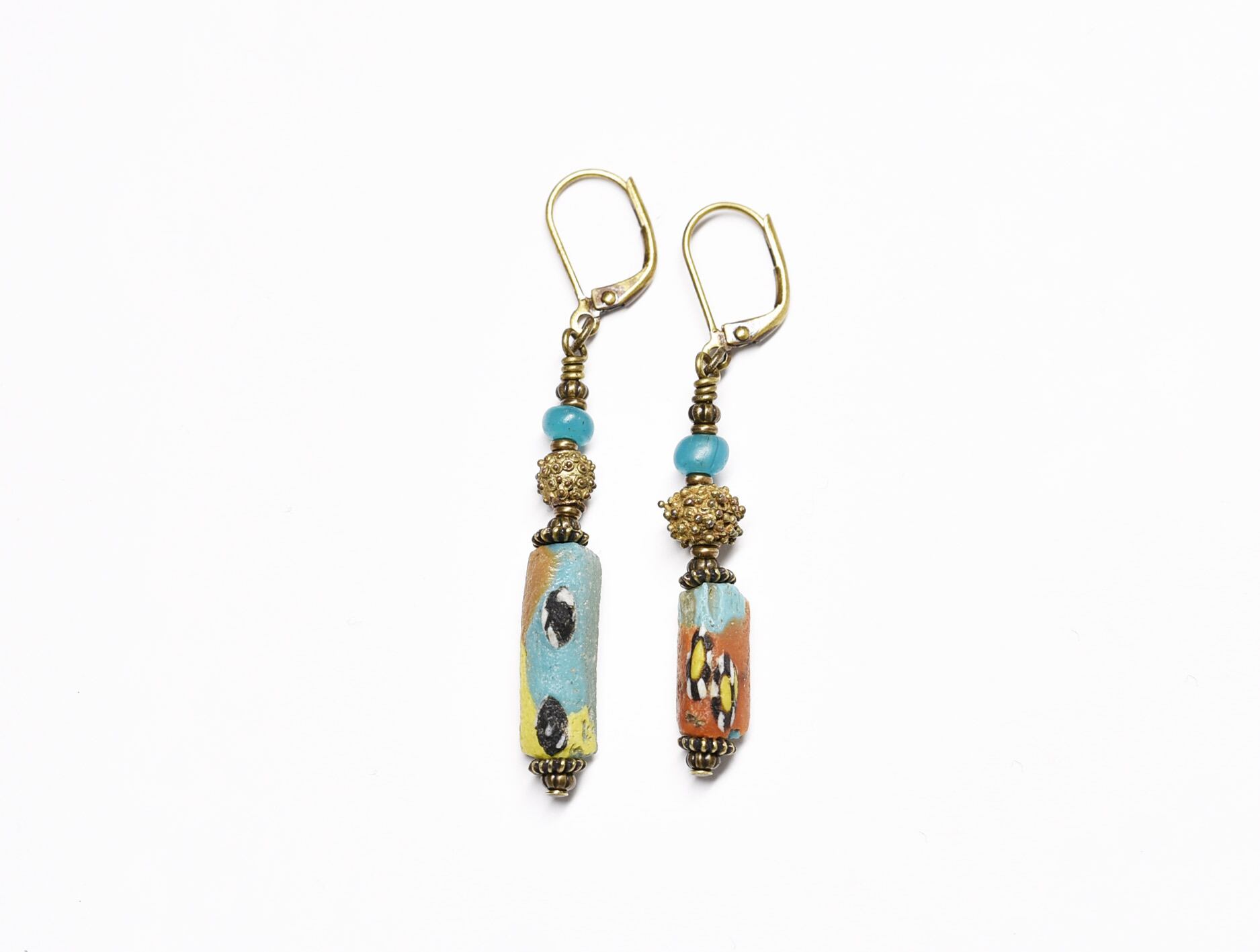 モザイク模様が施されたローマングラスとベニン族のツブツブビーズ、エメラルドブルービーズを繋いだアンシメトリーなピアスです。