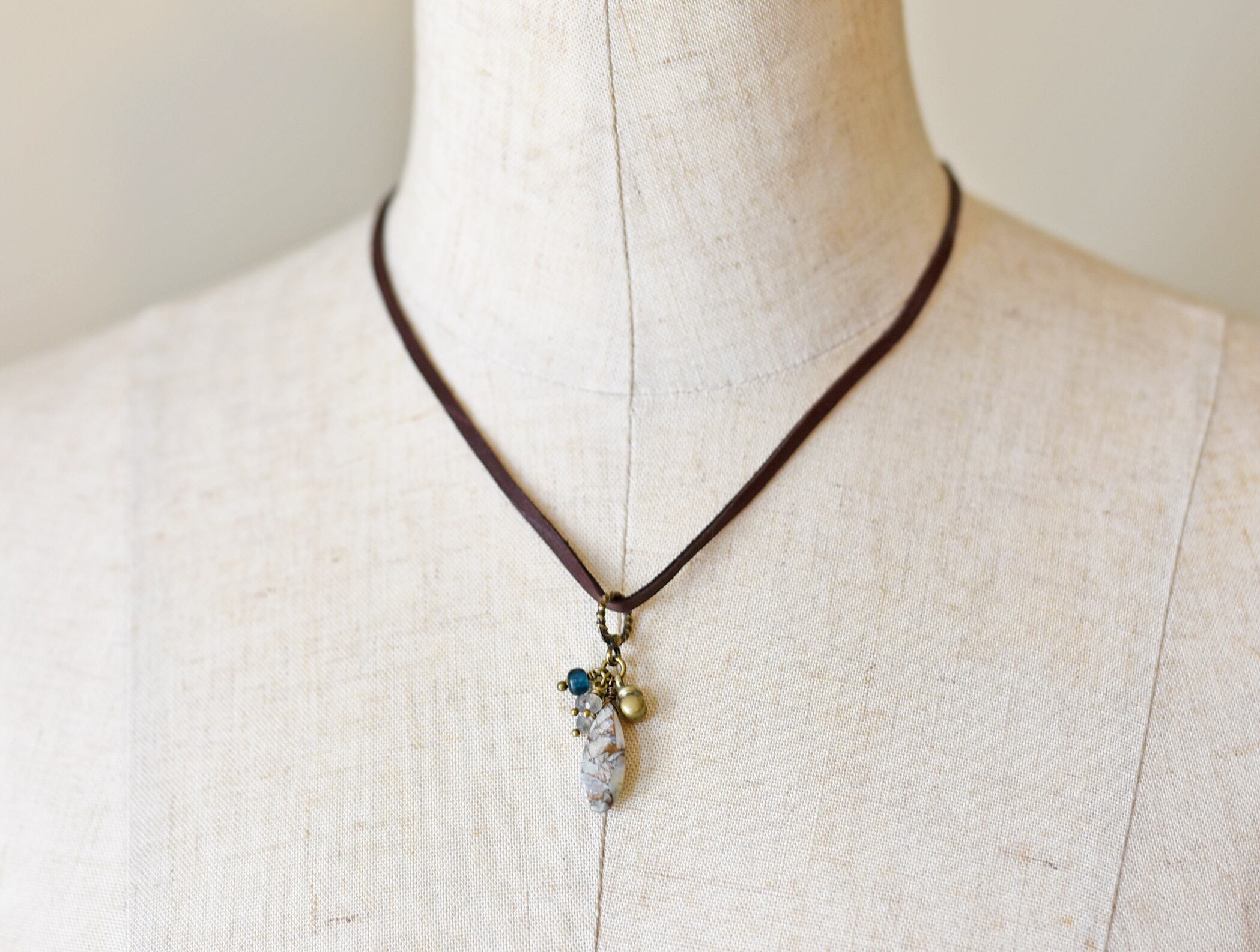 雫型コッパーオパールとラブラドライト、インディゴブルービーズと民族鈴のペンダントトップ