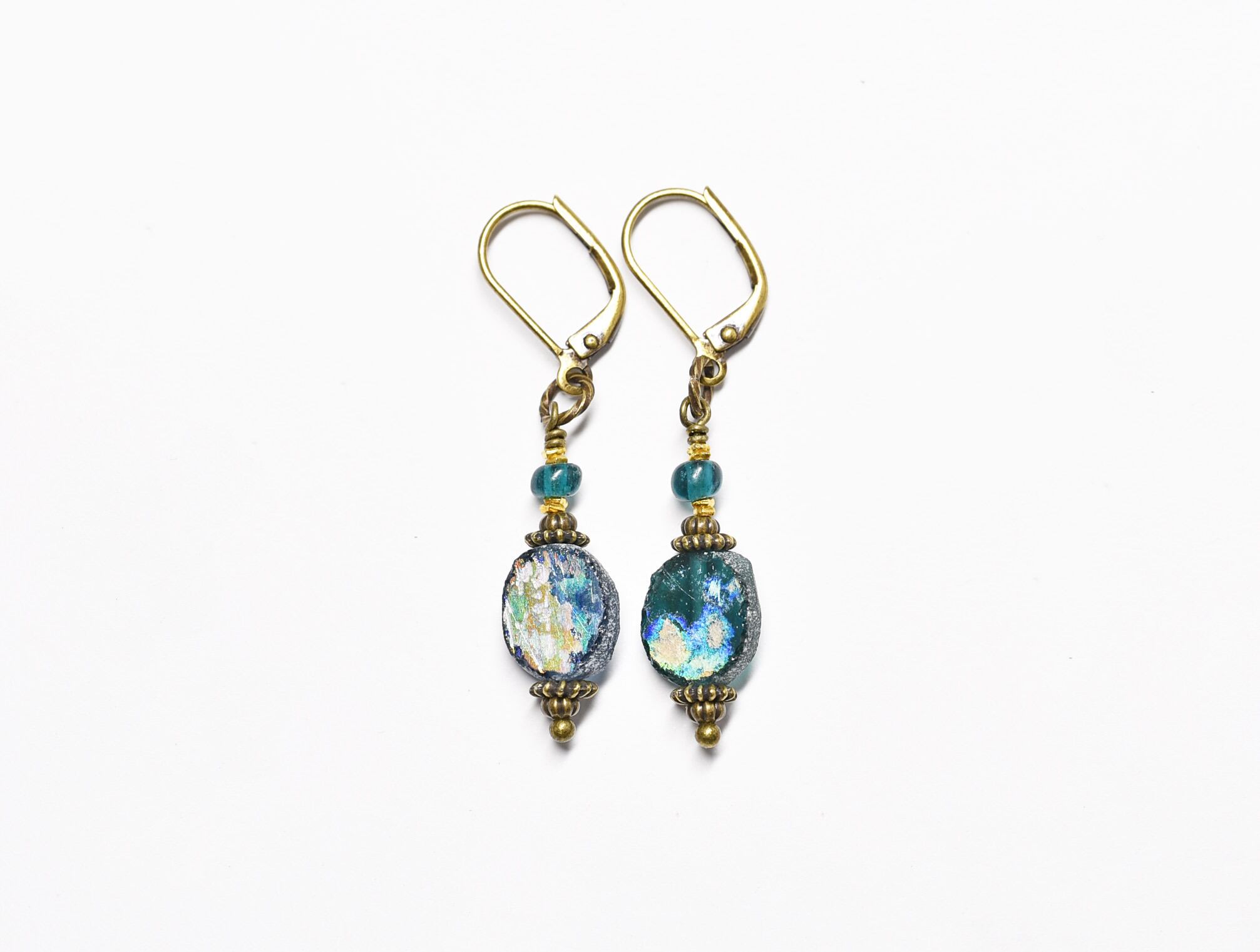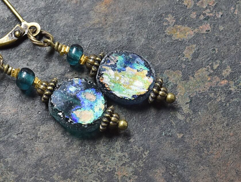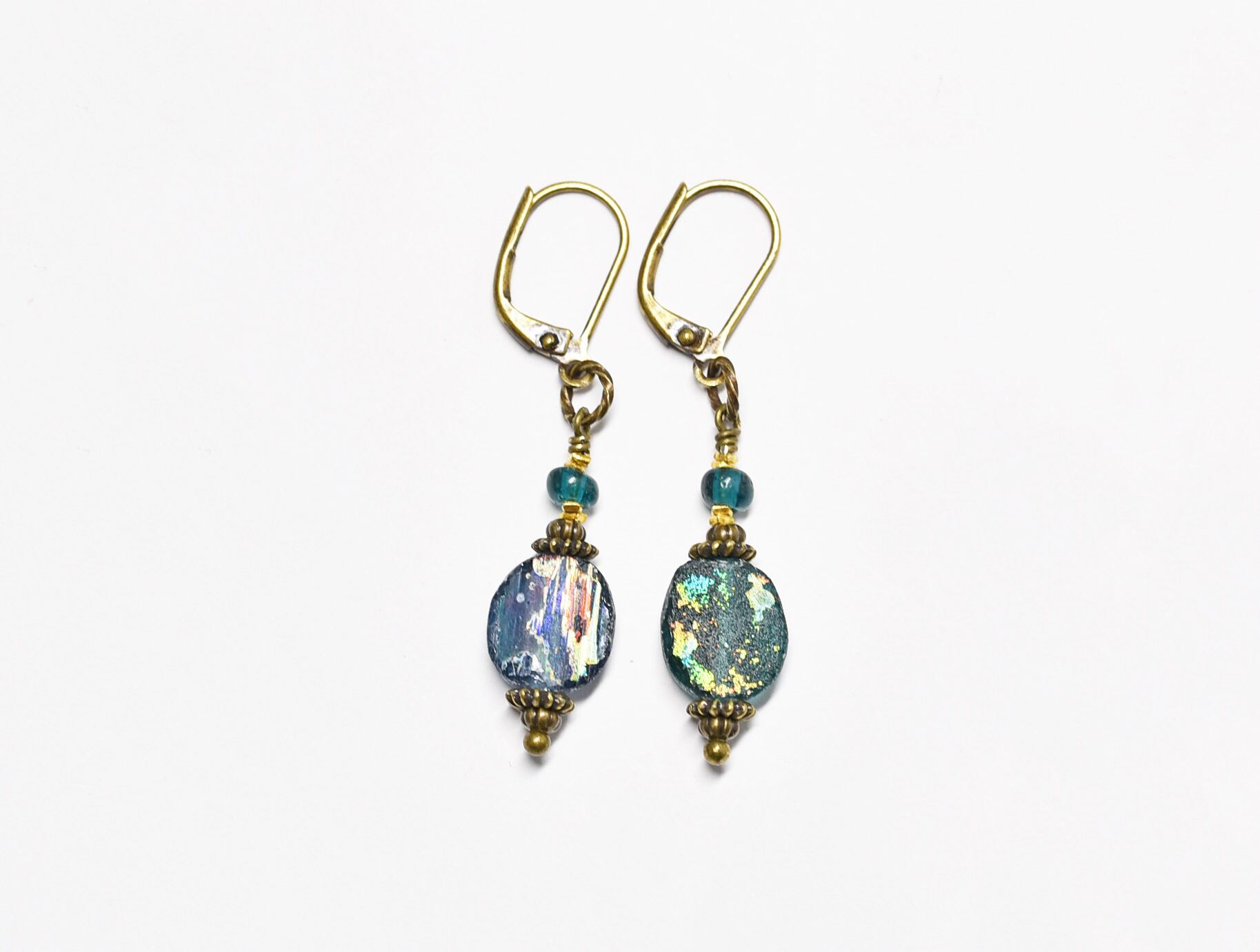 銀化ブルーローマングラスとインディゴブルービーズのピアス