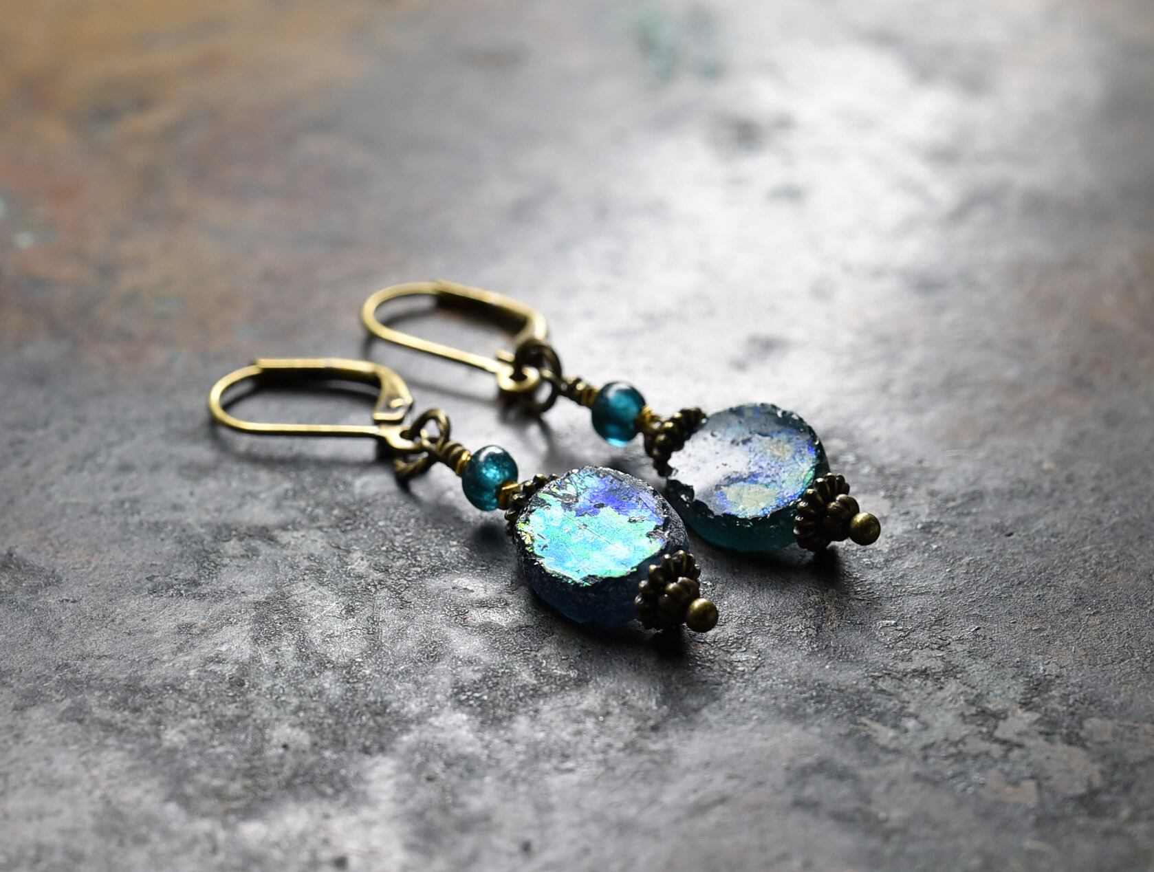 銀化したローマングラスと、インディゴブルーのアンティークビーズを繋いだピアスです。