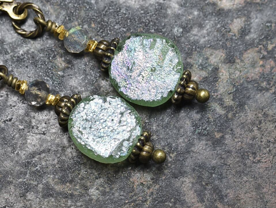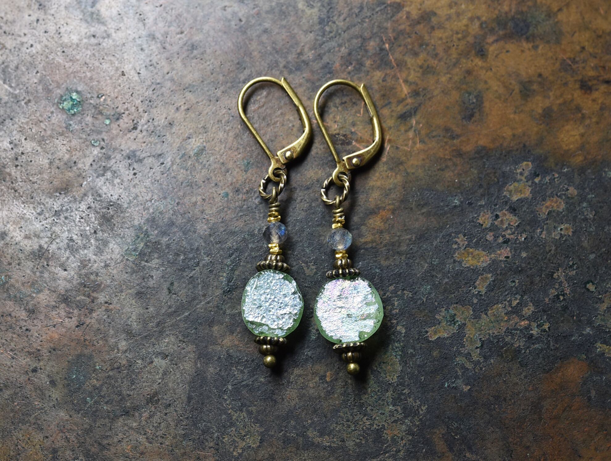 銀化したローマングラスと、ラブラドライトを繋いだピアスです。