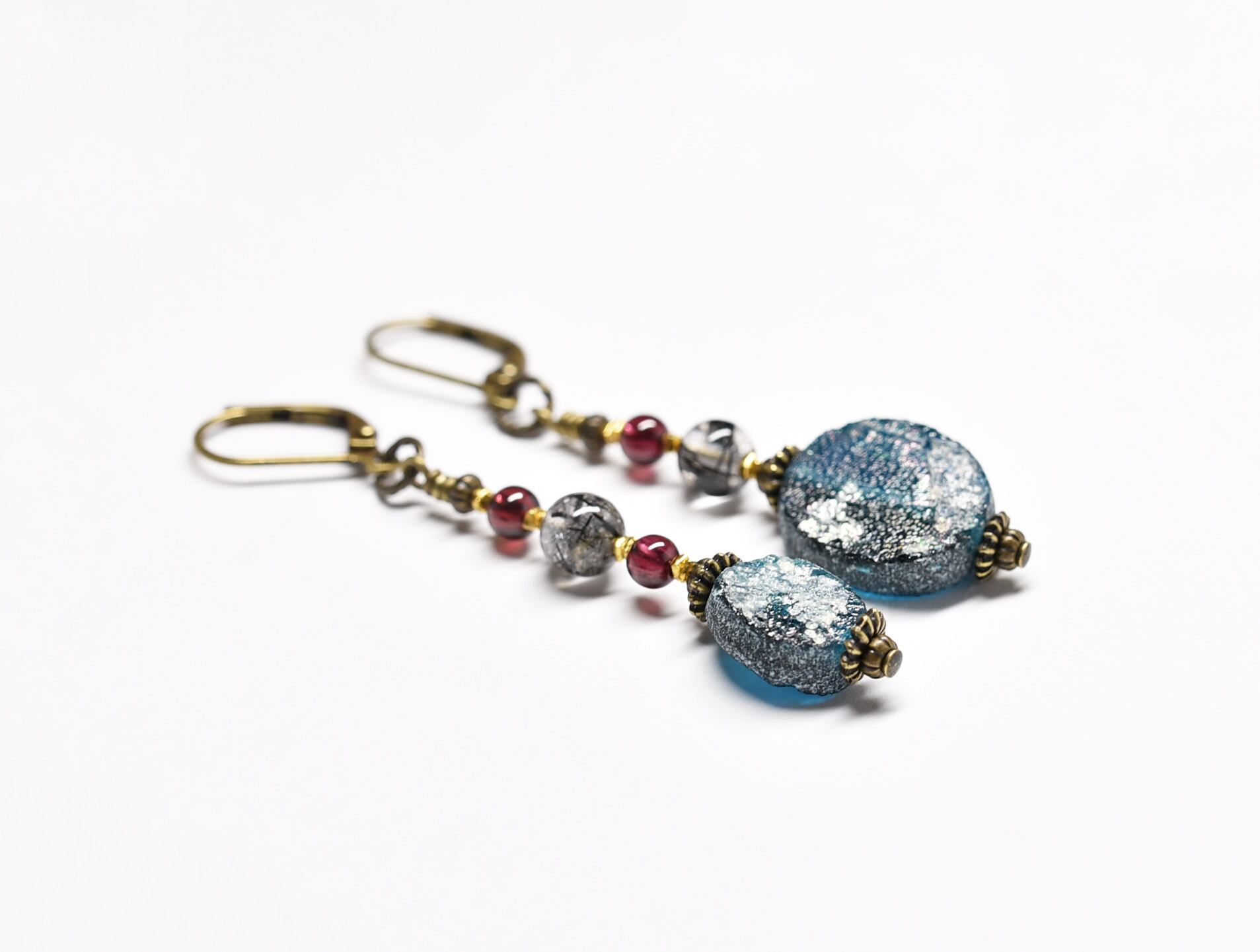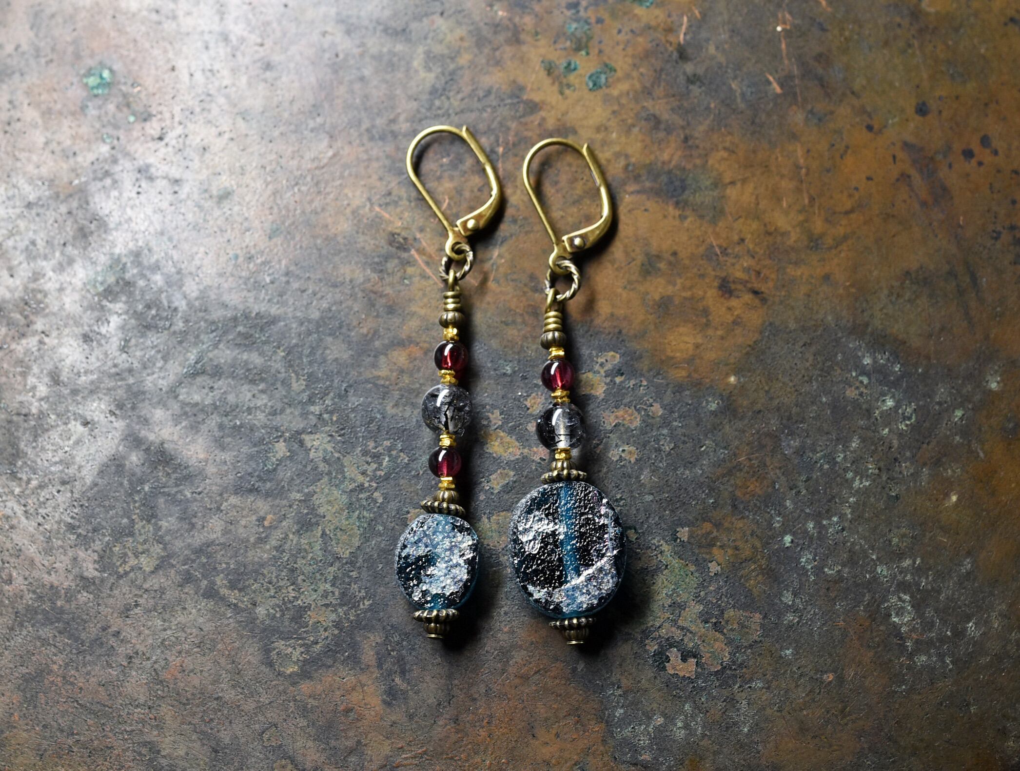 ブルーローマングラスとブラックルチル、ガーネットのアンシメトリーピアス