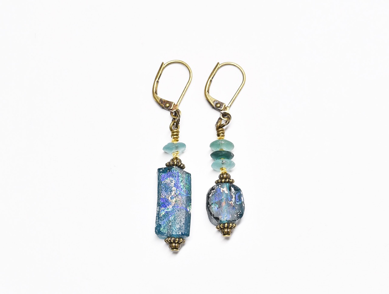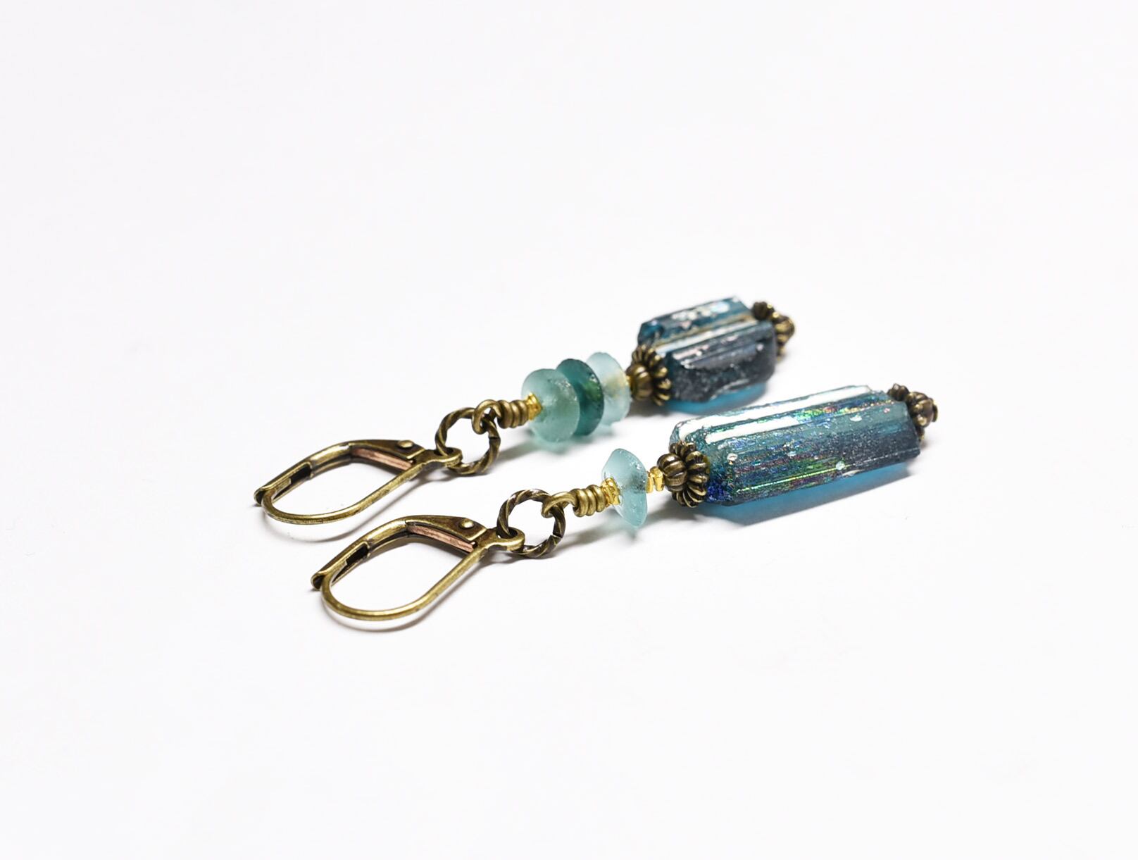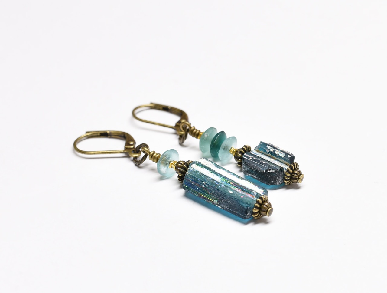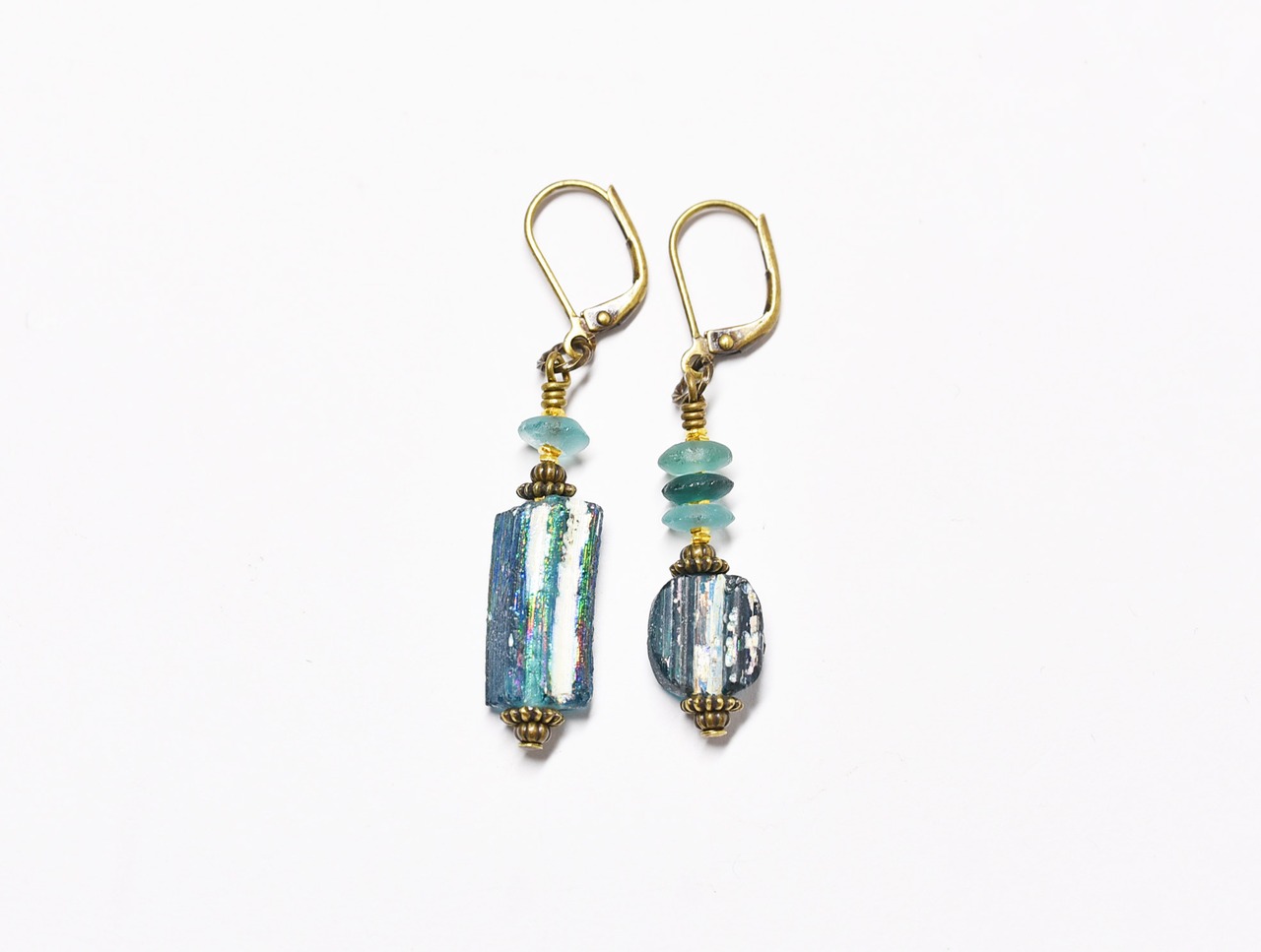 2種類のローマングラスを繋いだアンシメトリーなピアスです。