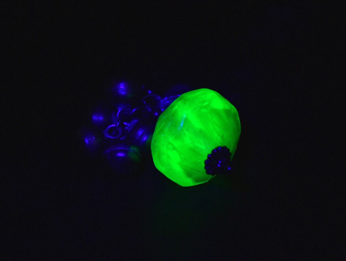 独特なセミクリアグリーンのビーズは、極々微量のウランで発色させています。ブラックライトを当てると光ります!