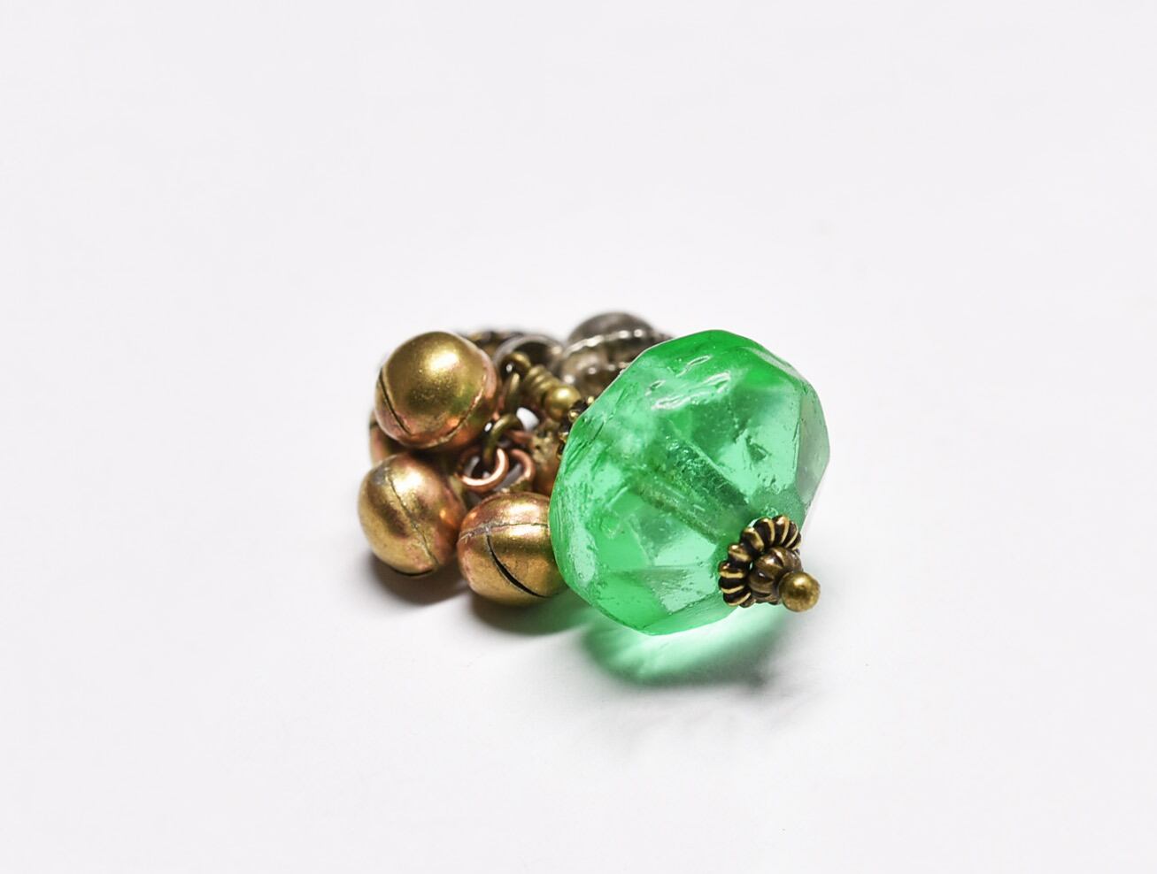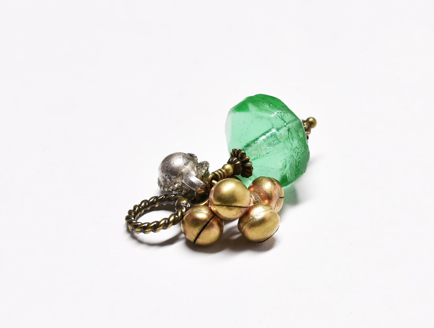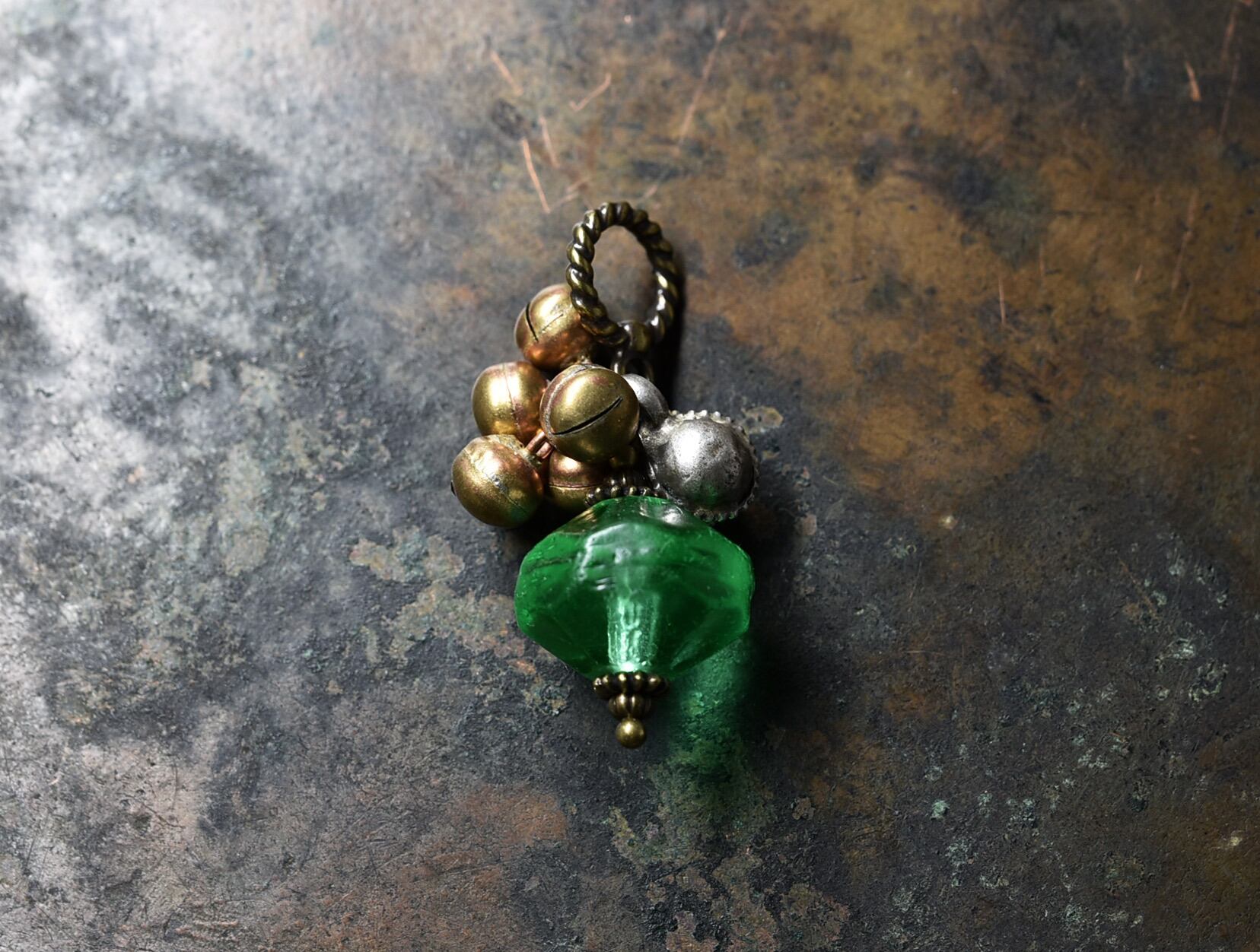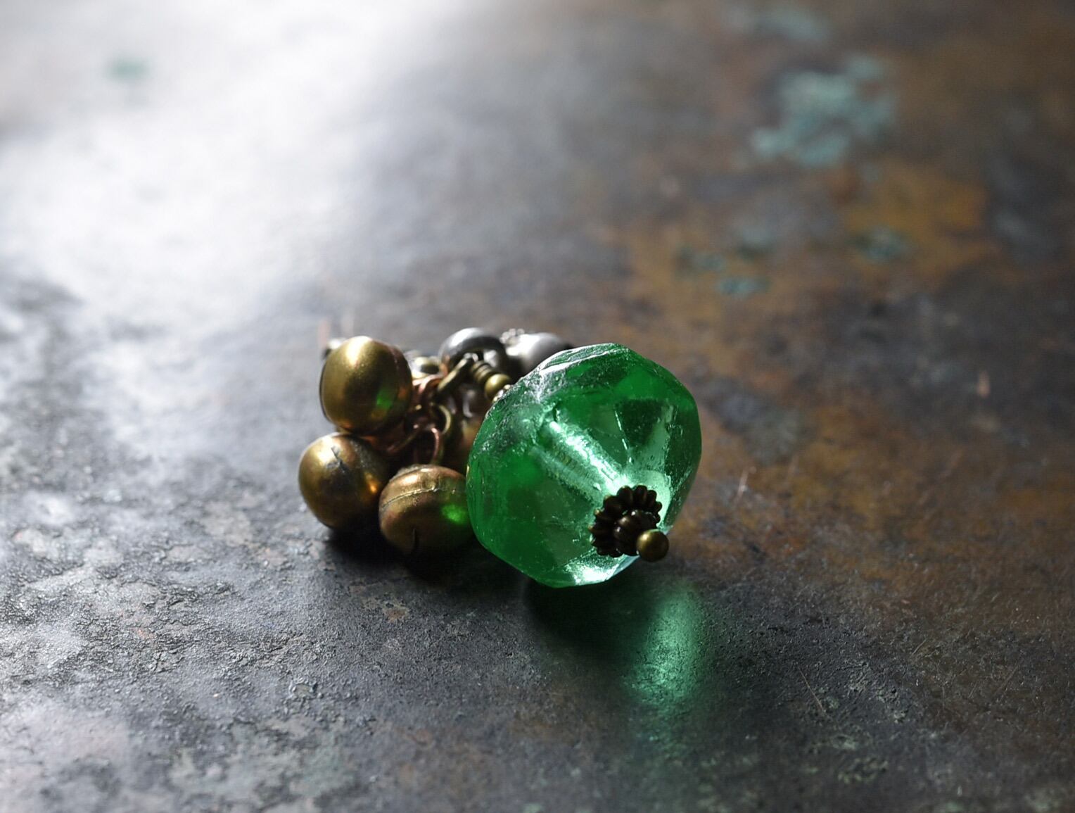 アンティークのウランガラスとたわわな鈴、oldシルバーのベルを繋いだピアスです。