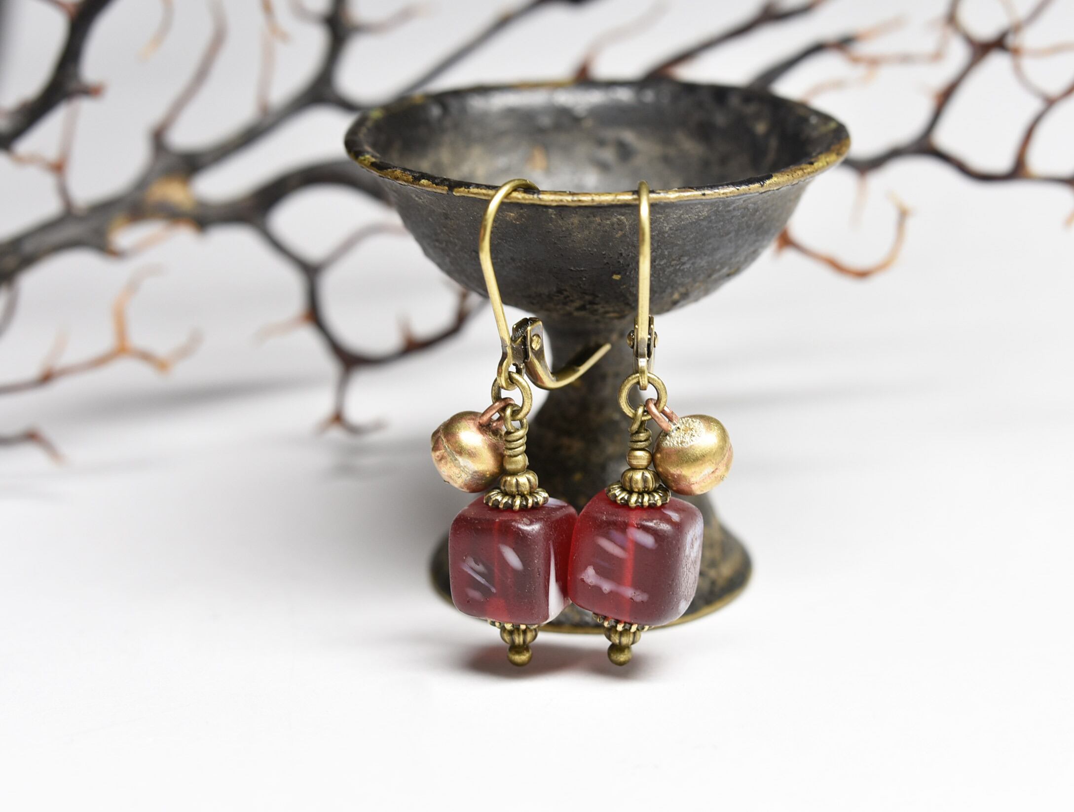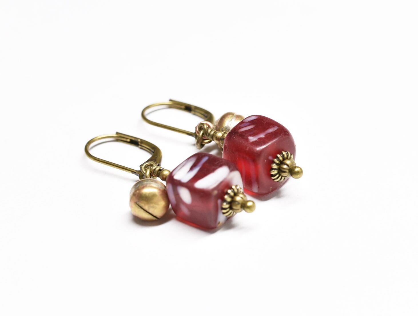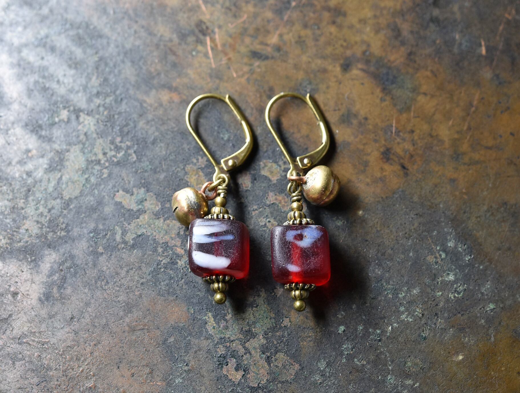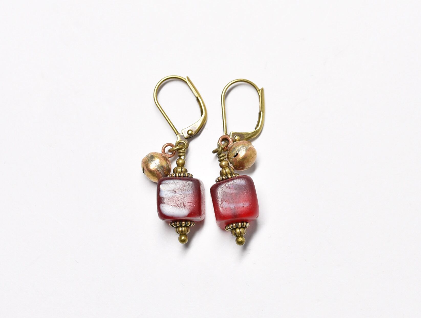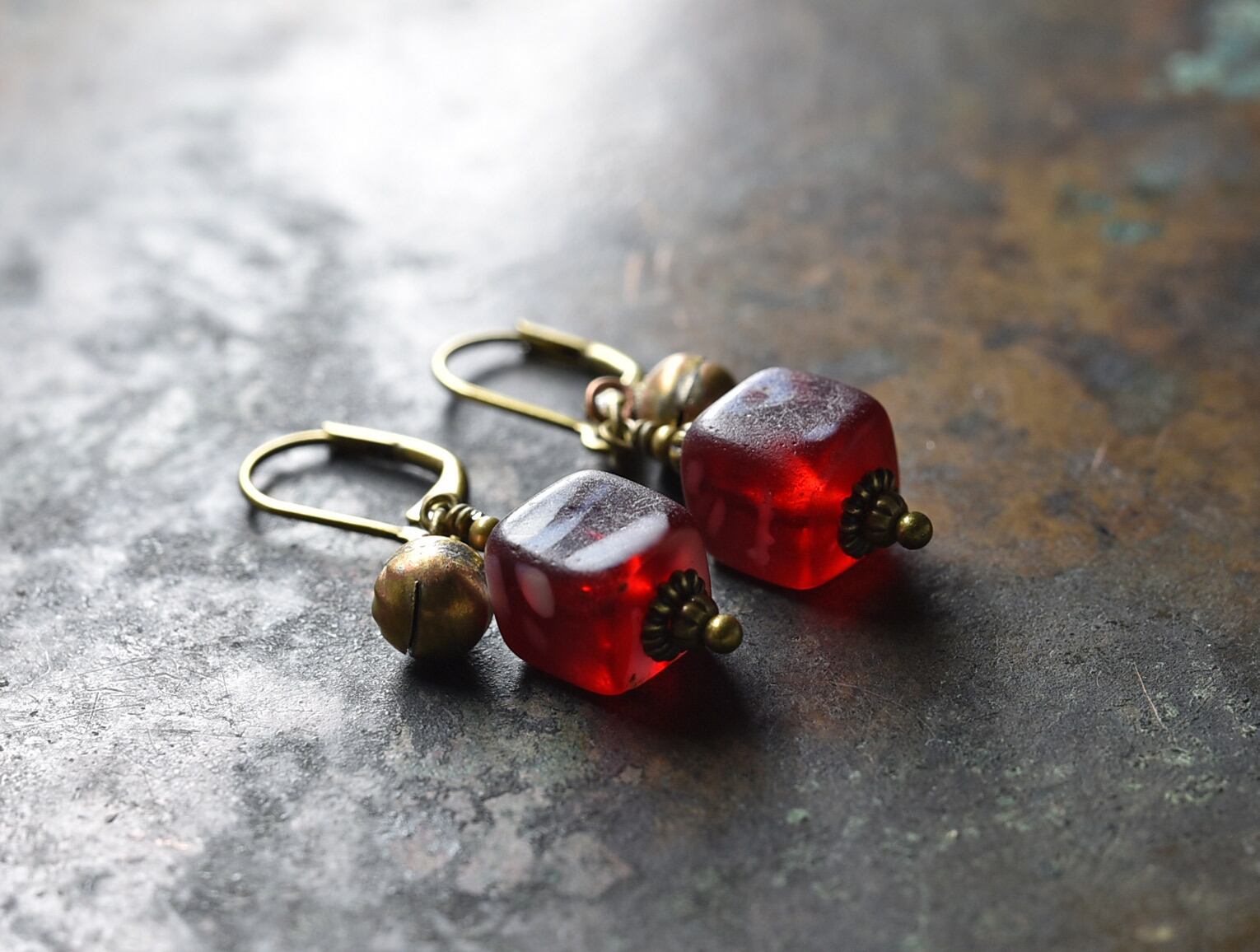 アンティークスクエア型ボヘミアビーズと小さな鈴のピアス