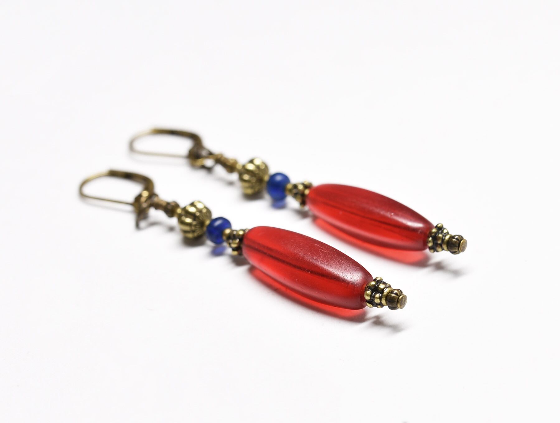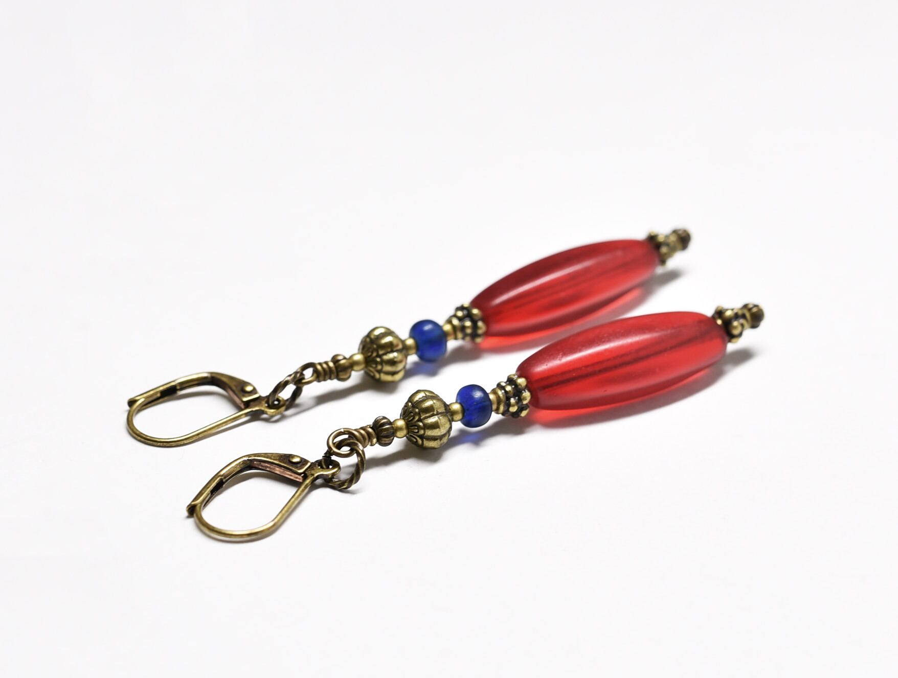 真っ赤なアンティークボヘミアビーズとダークブルービーズ、手毬ブラスのピアス