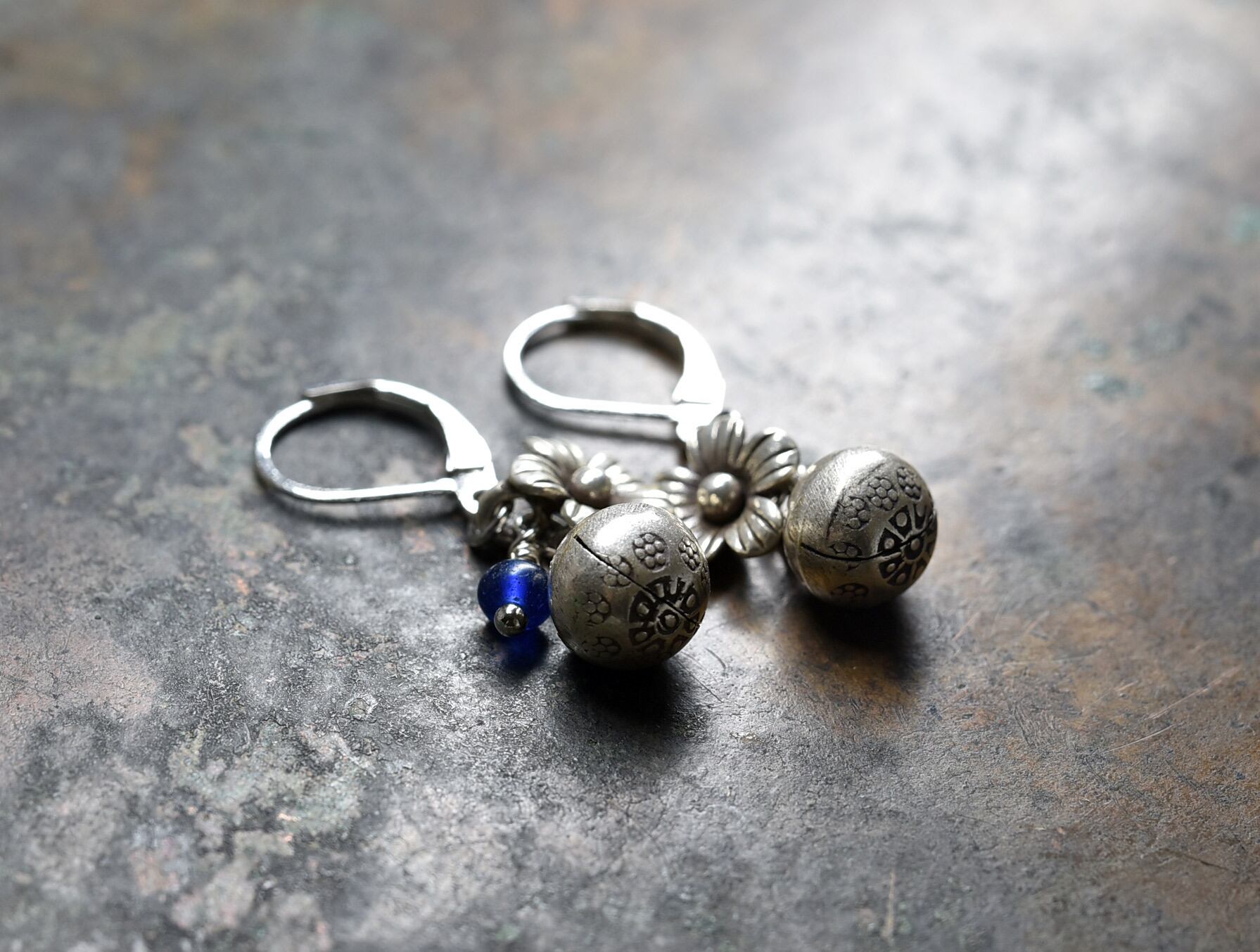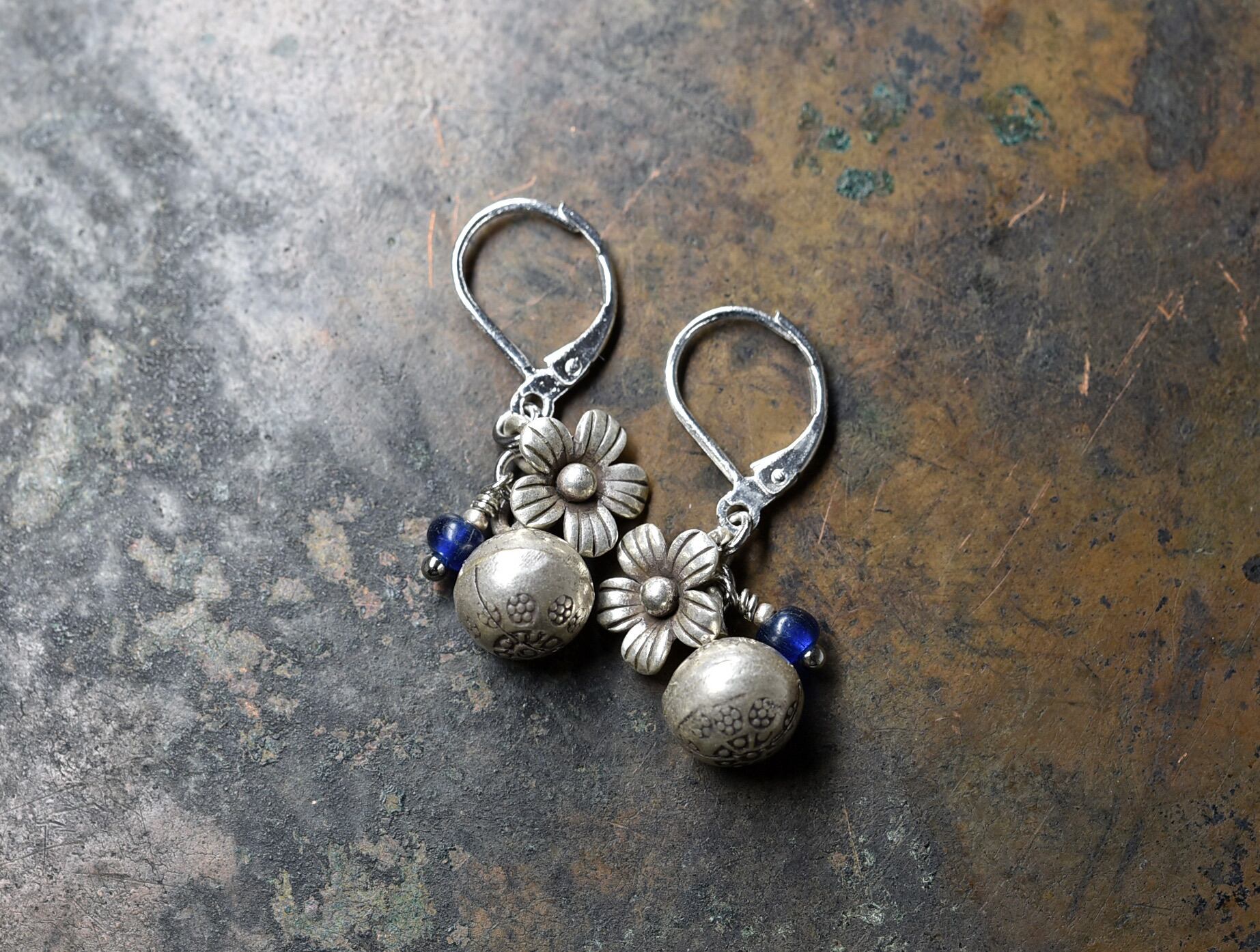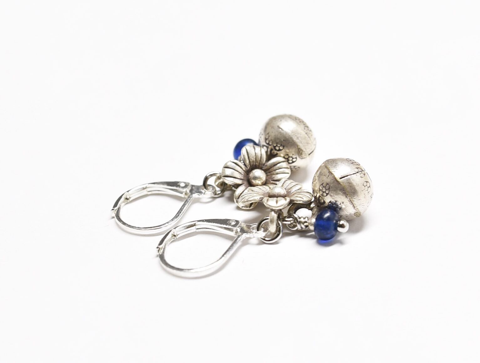 鈴とお花カレンシルバーとダークブルービーズのピアス