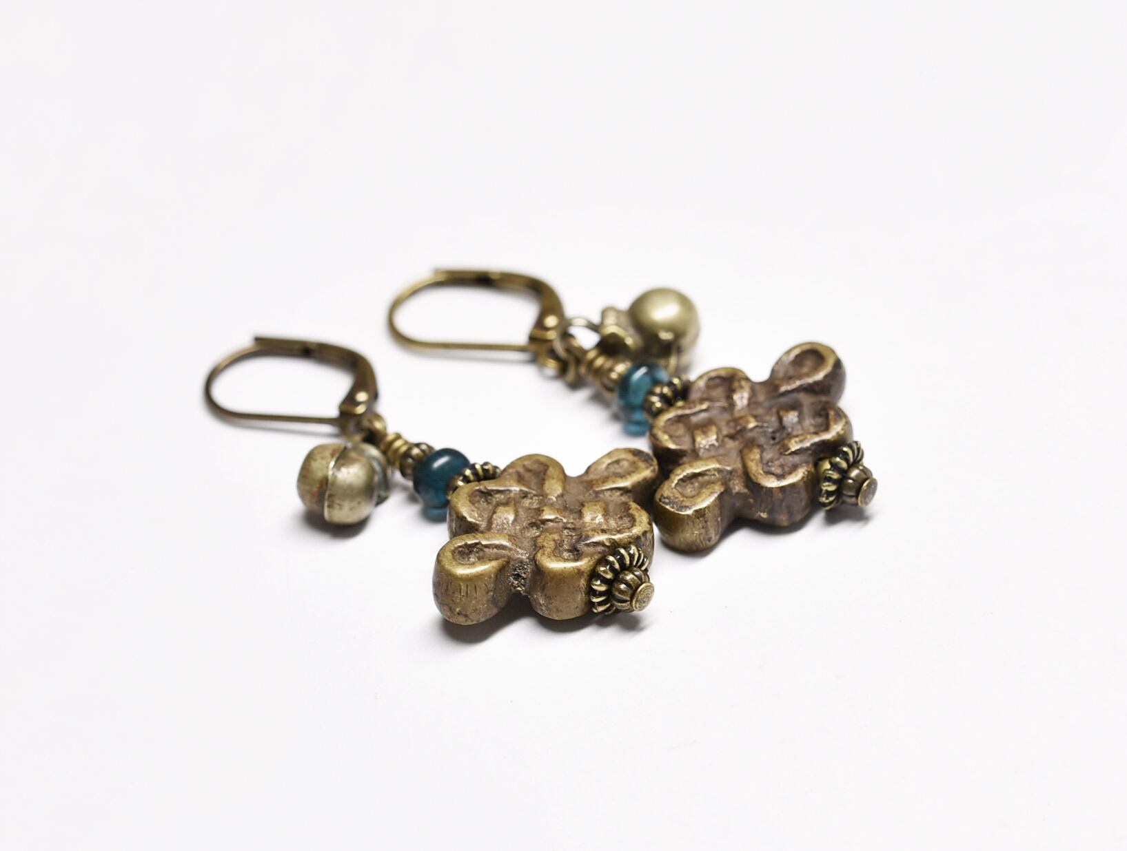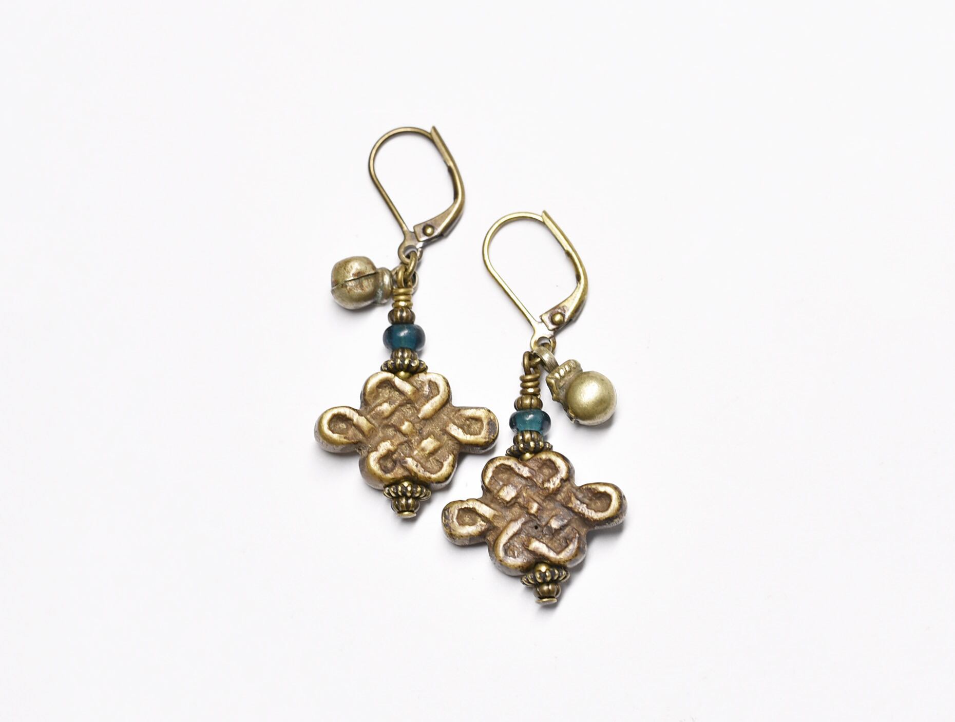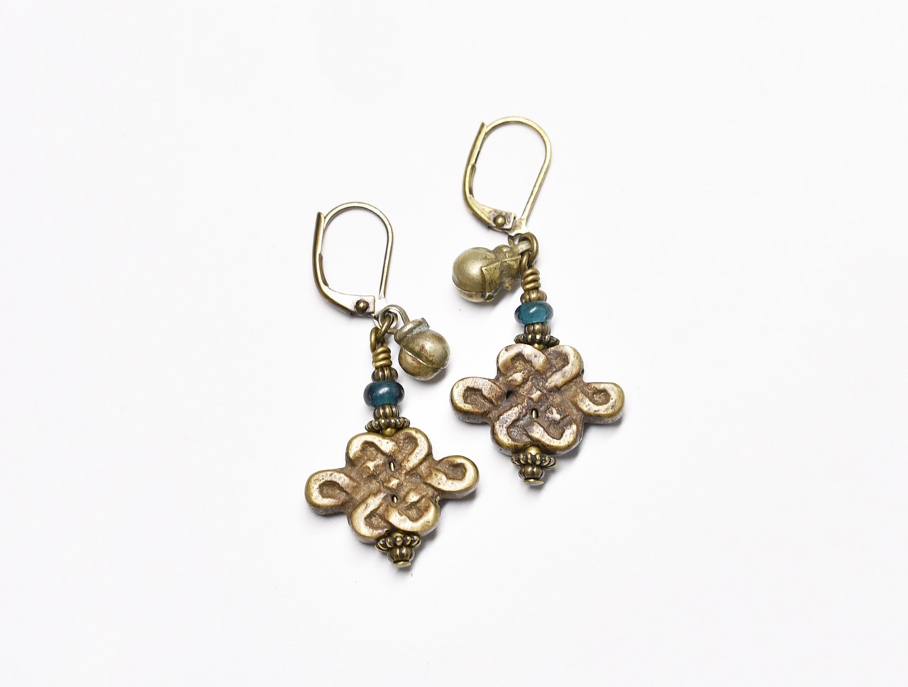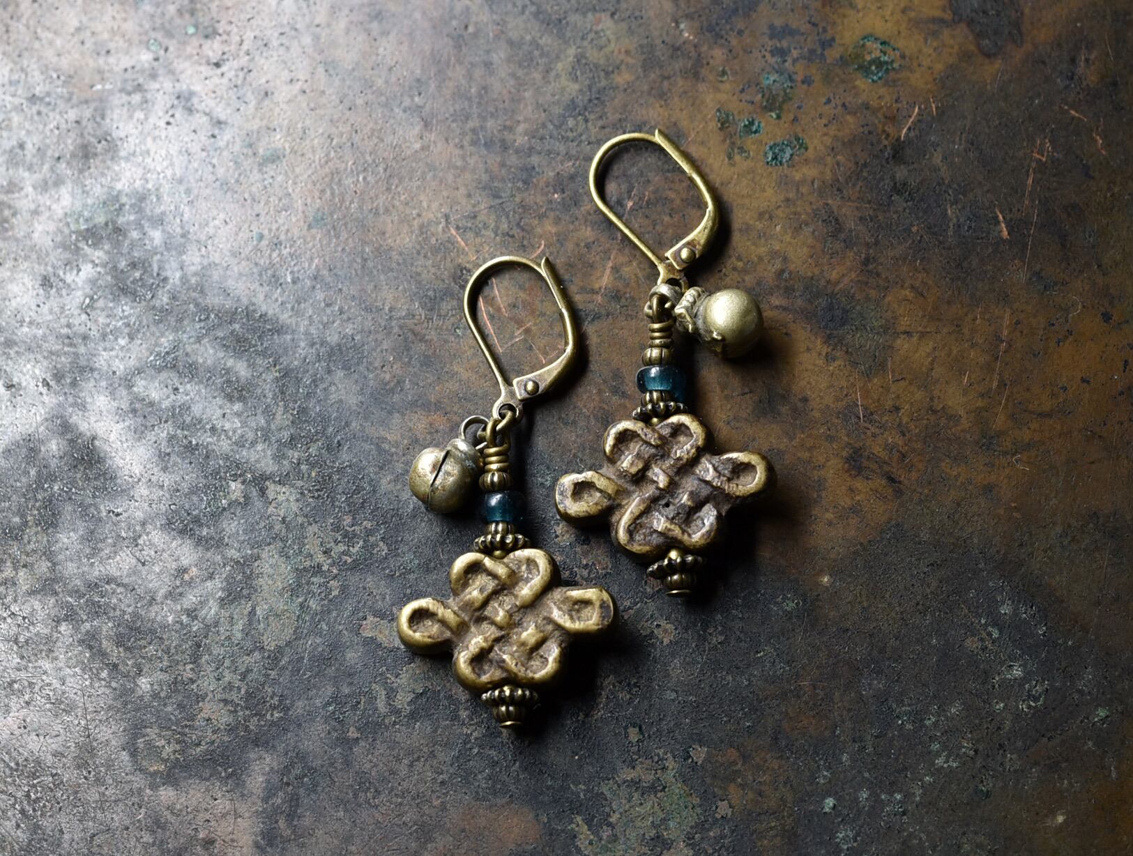 エンドレスノットと、インディゴブルーのアンティークビーズ、民族の鈴を繋いだピアスです。