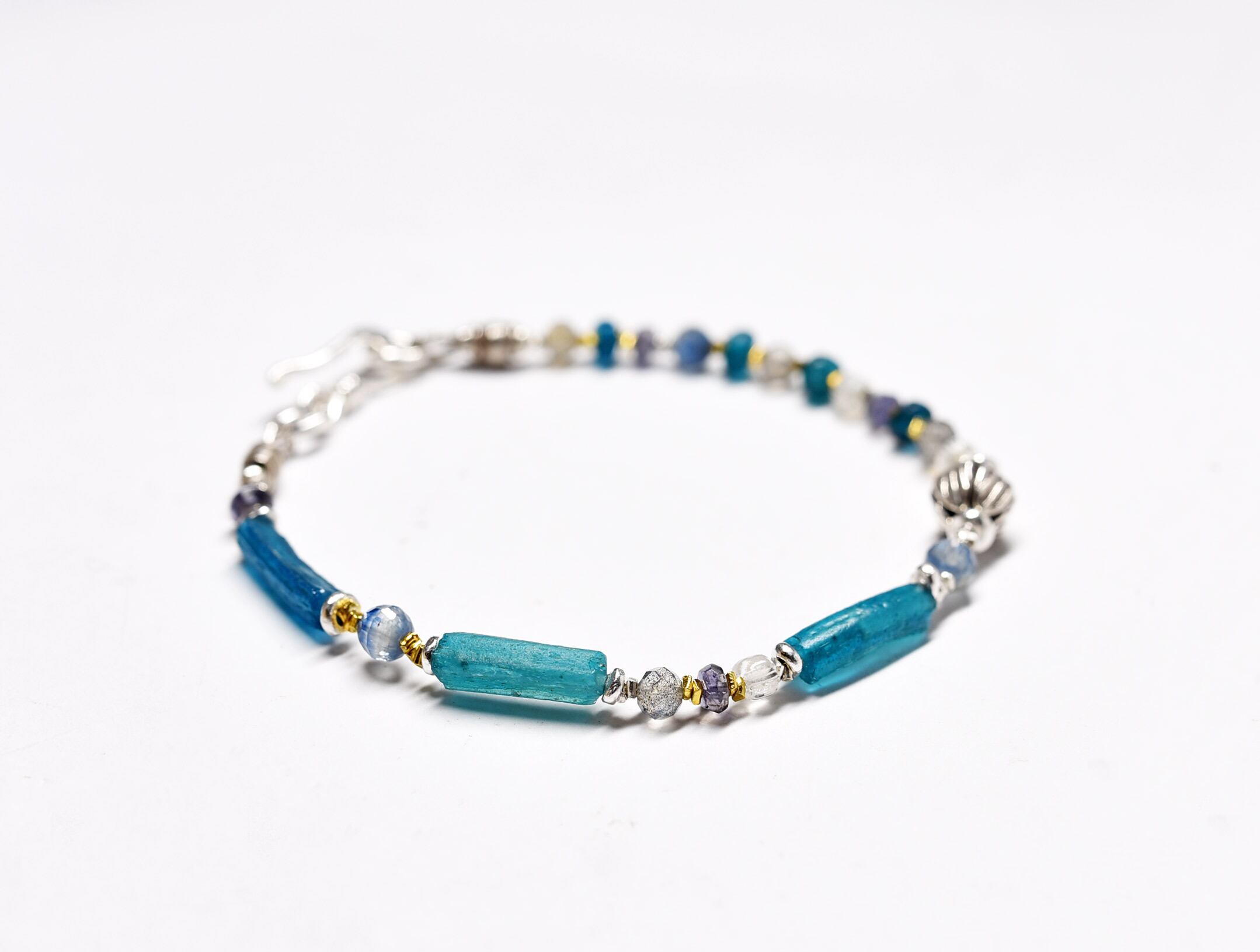 多面体カットが施されたカイヤナイト、ラブラドライト、アイオライトを散りばめました。