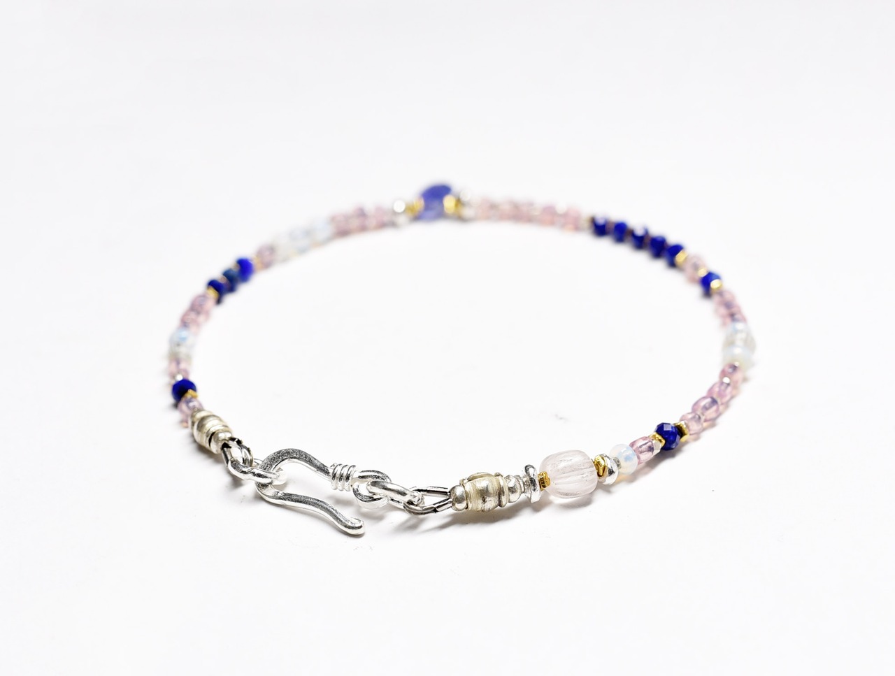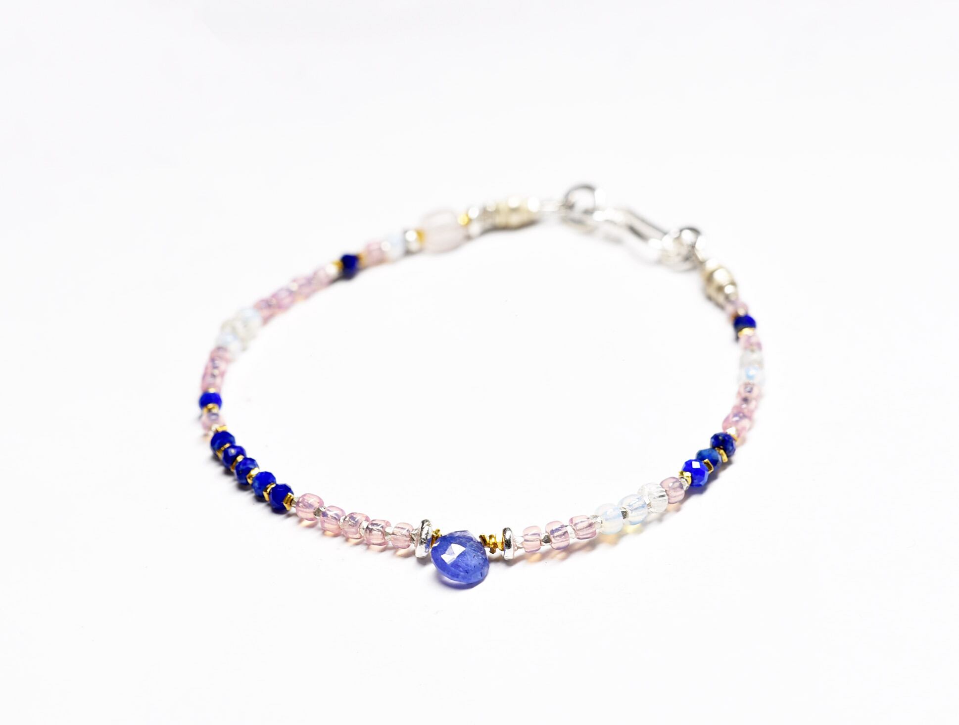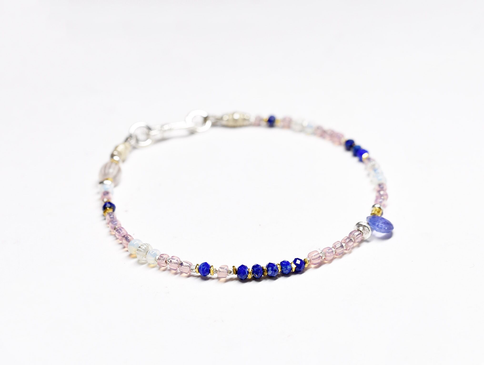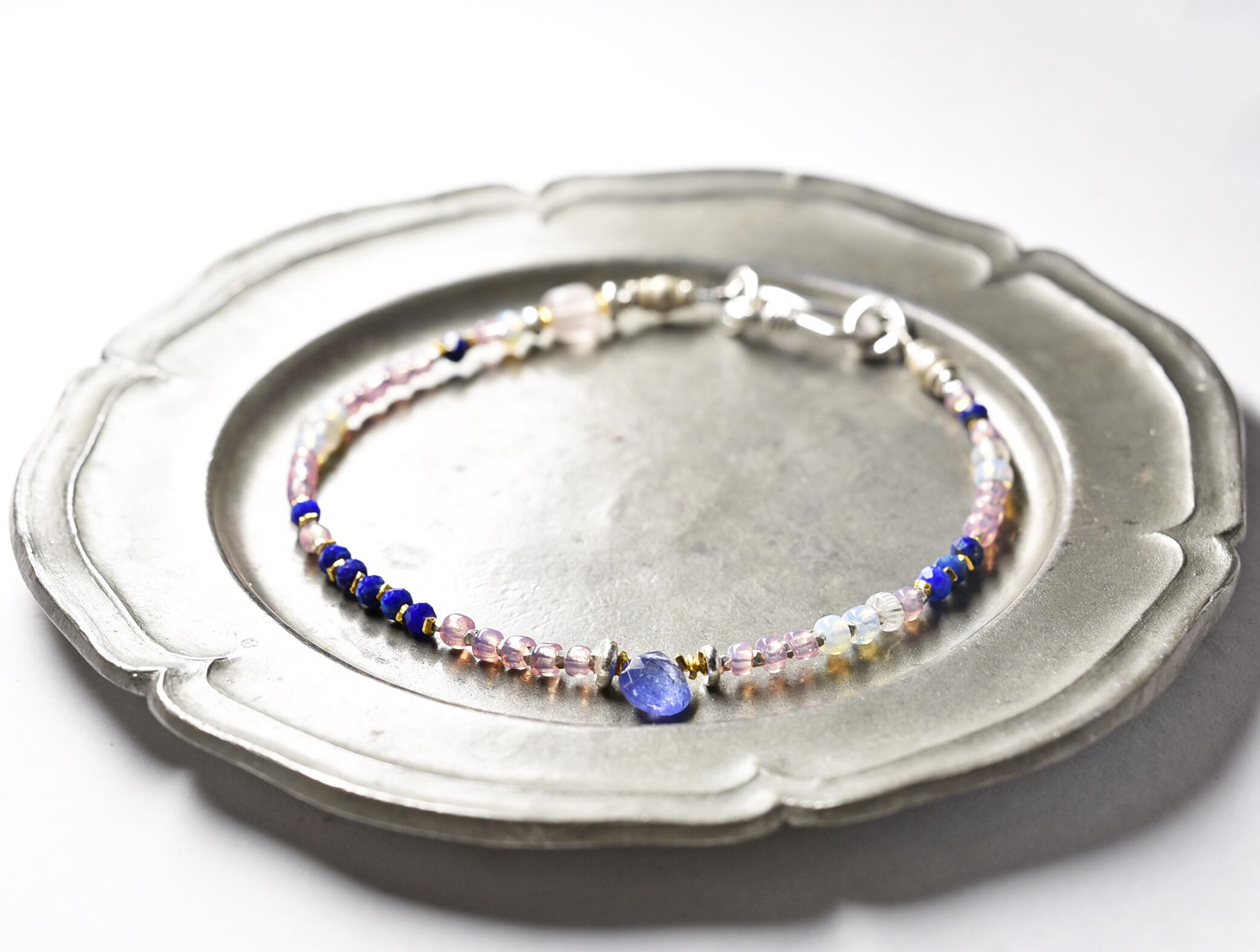 小さなアンティークビーズとタンザナイト、ラピスラズリの春色ブレス