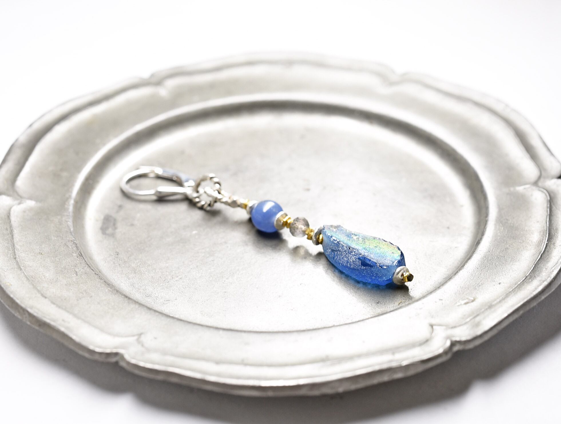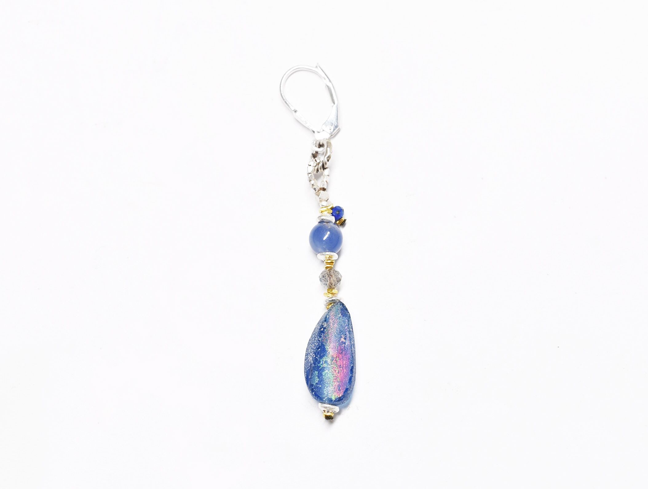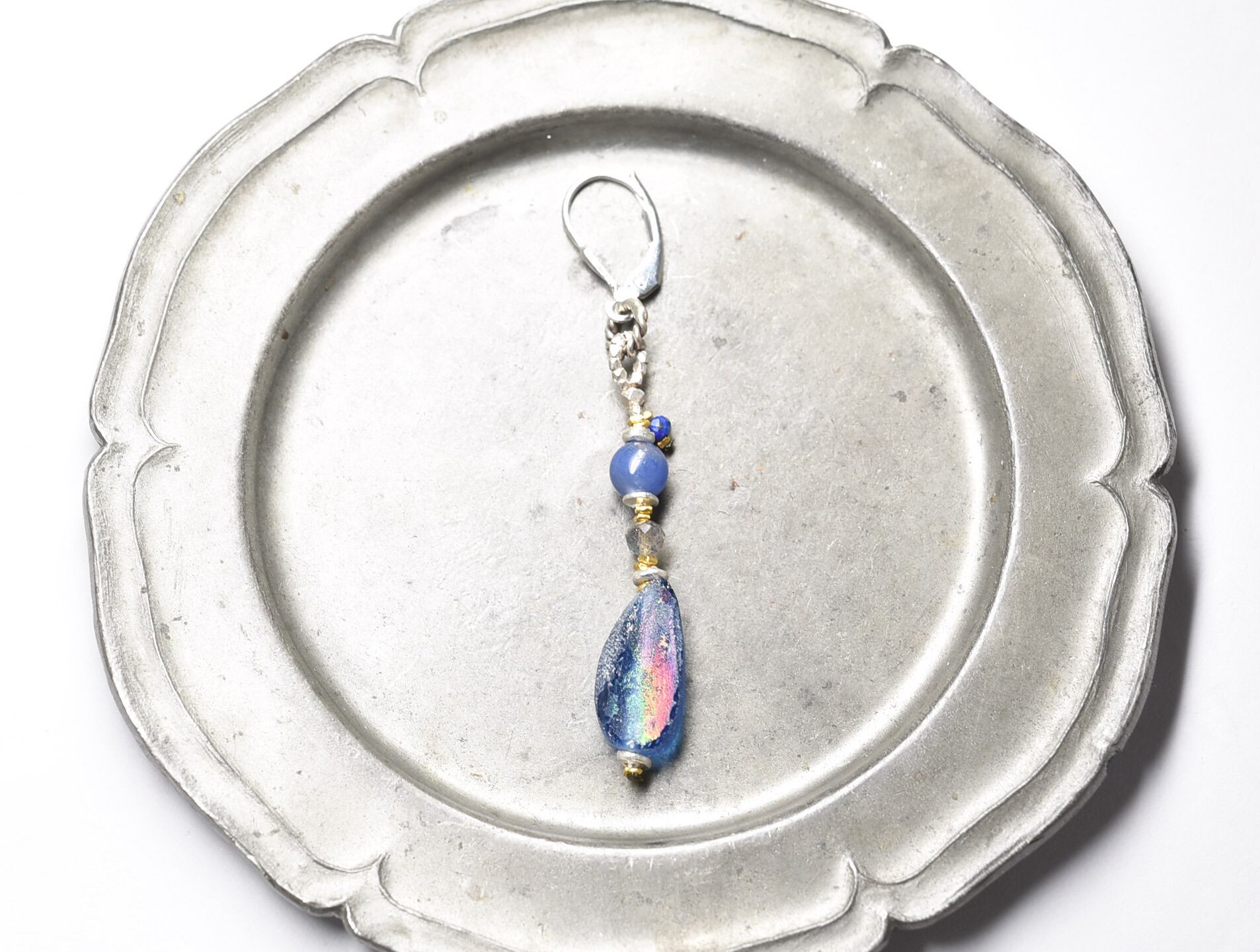 雫型銀化ローマングラスとデュモルチェライトインクォーツ、ラブラドライト、カレンシルバーを繋いだの片耳ピアスです。