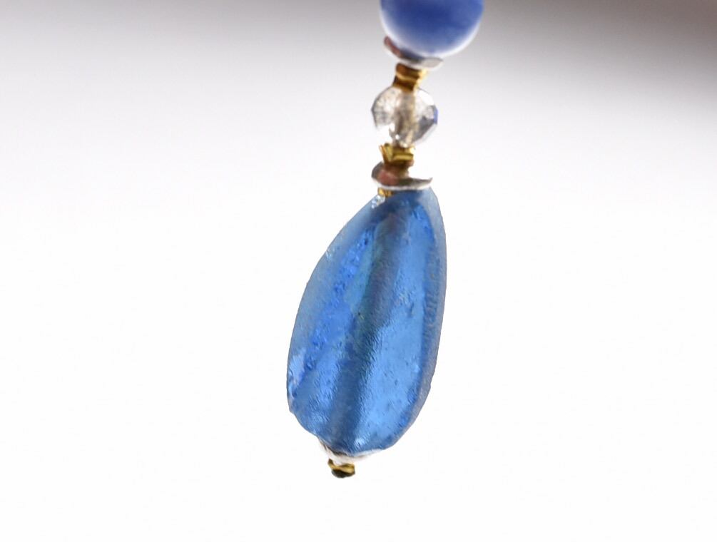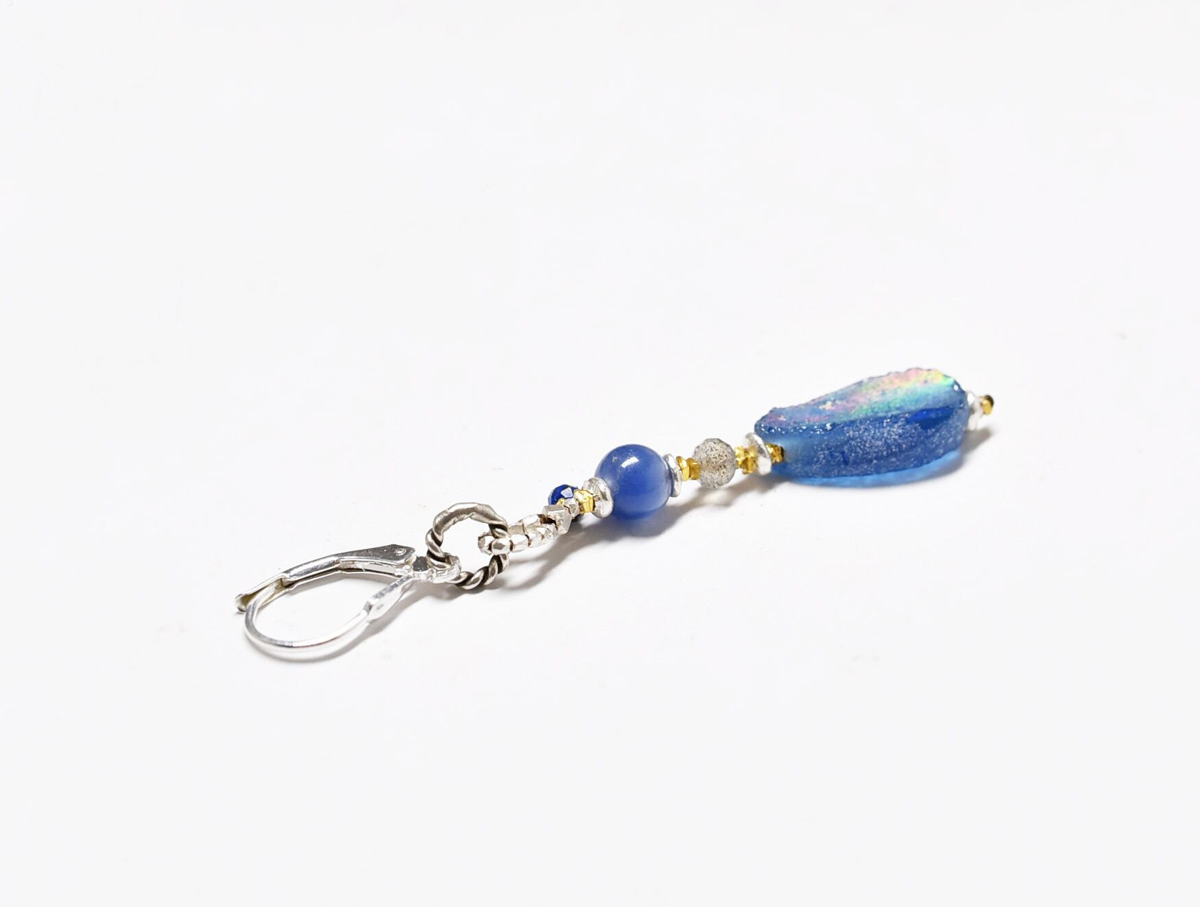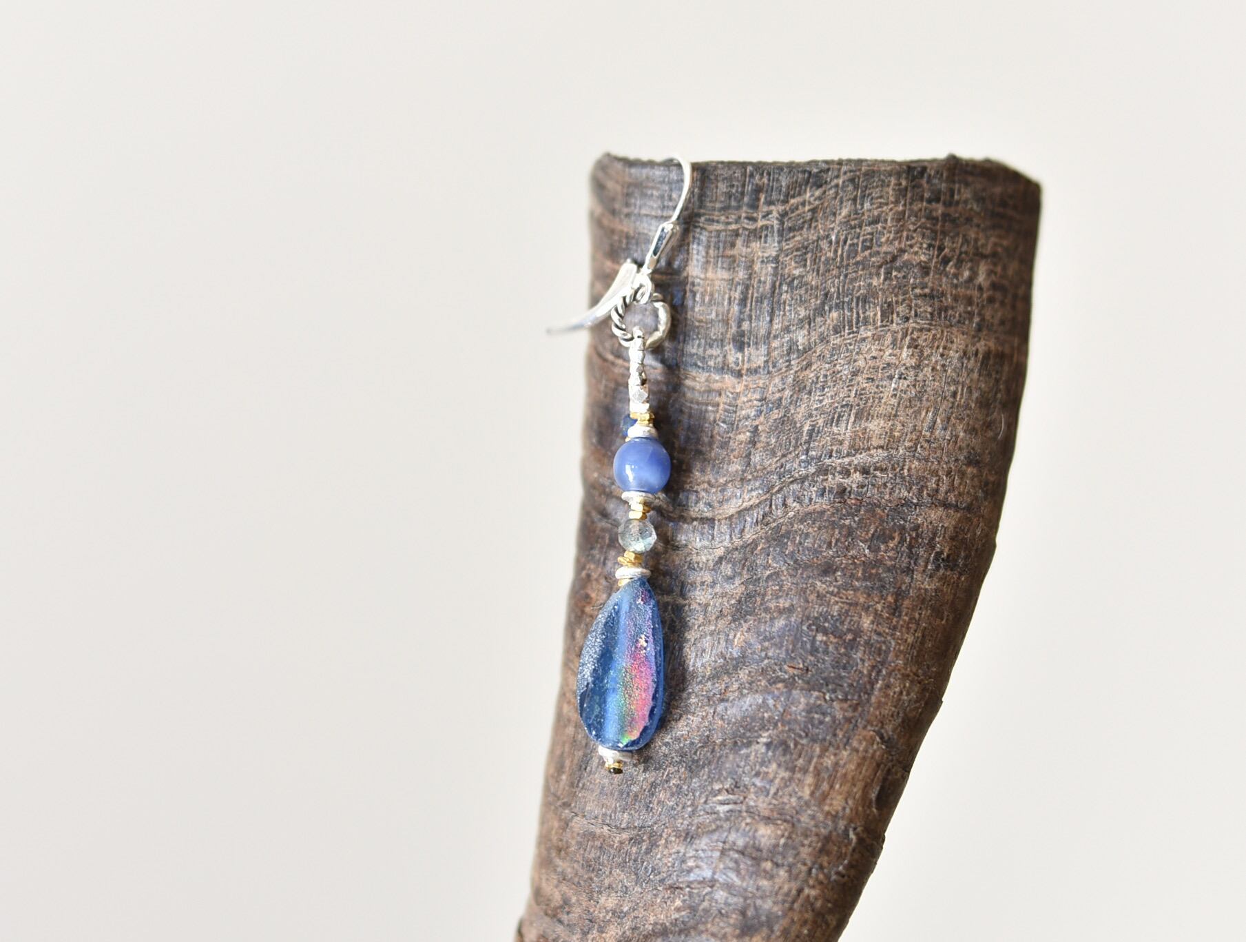 雫型銀化ローマングラスとデュモルチェライトインクォーツ、ラブラドライト、カレンシルバーを繋いだの片耳ピアスです。
