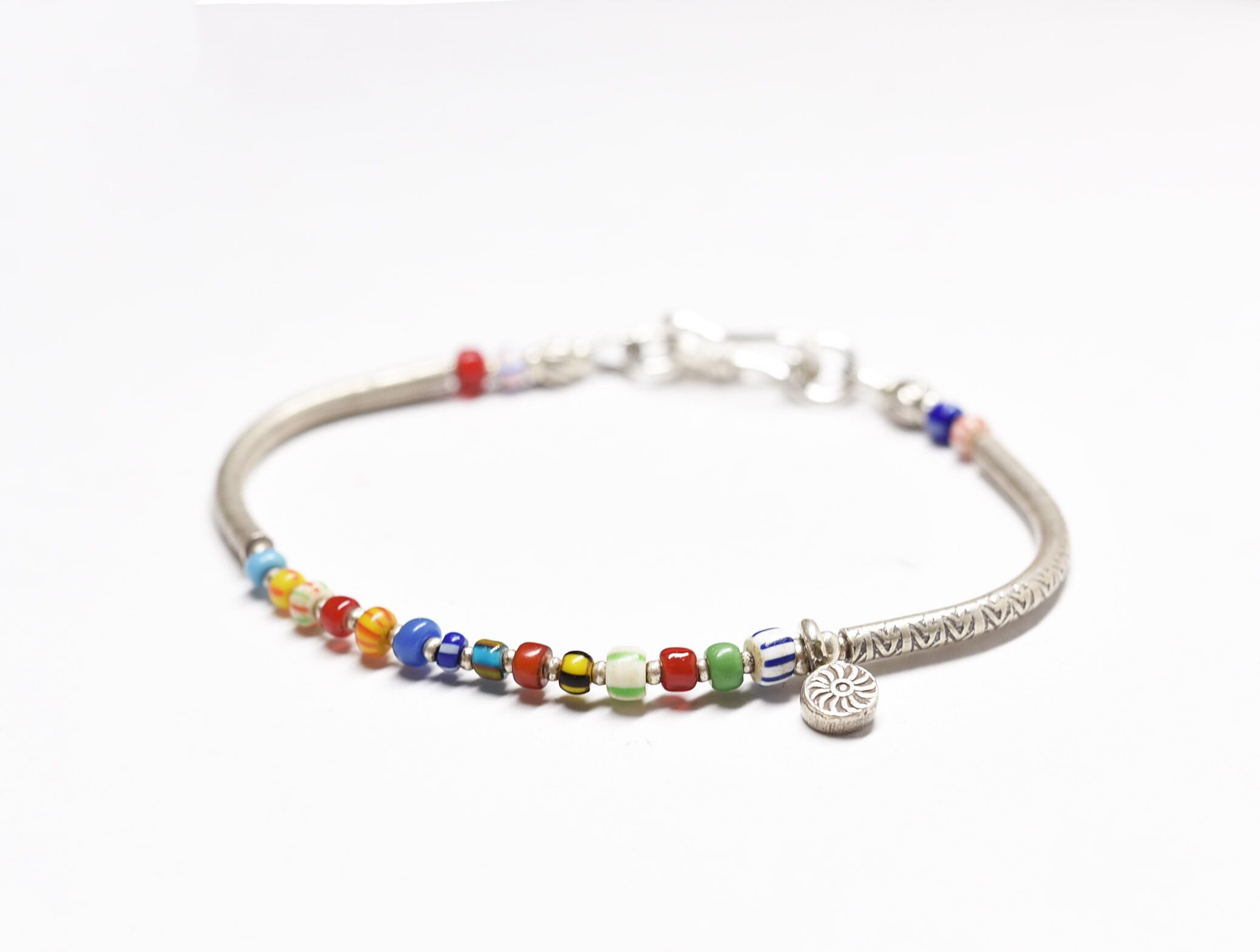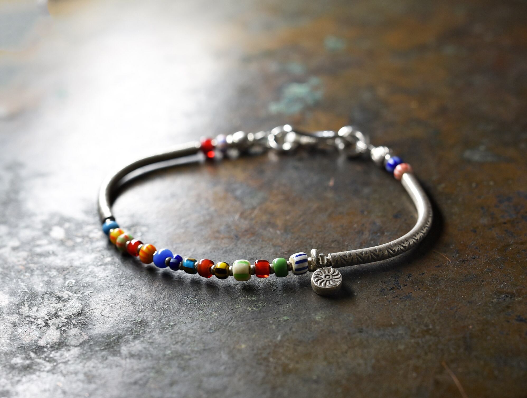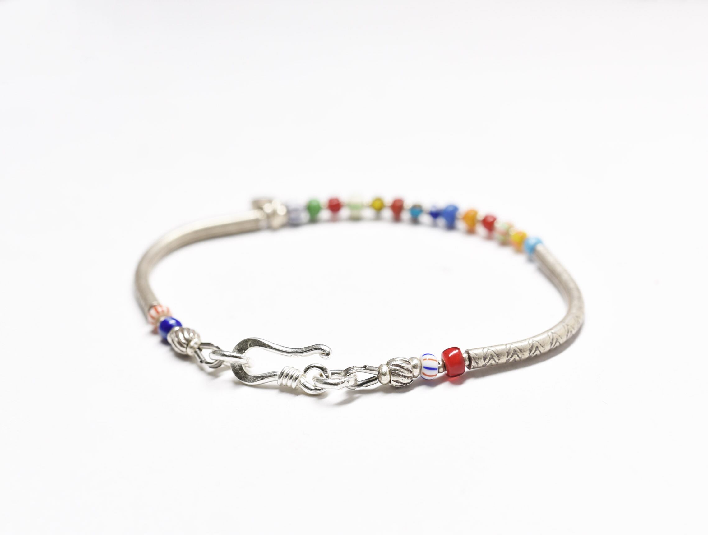 湾曲したカレンシルバーとクリスマスビーズと呼ばれるアンティークビーズを繋いだ華奢なブレスです。