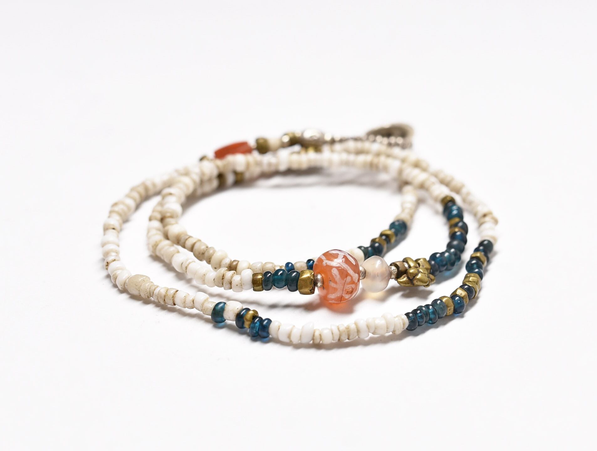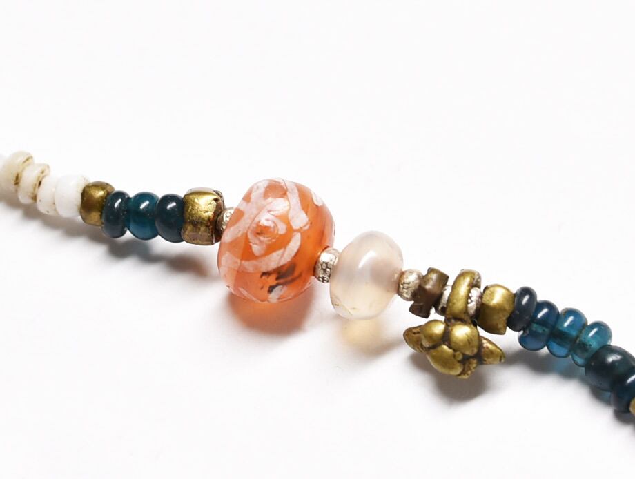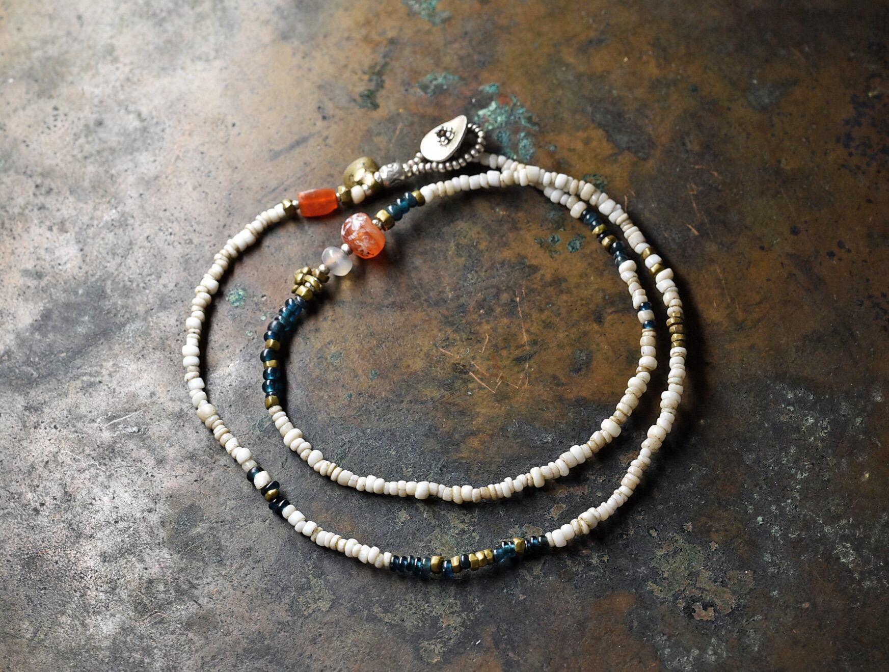 エッチドカーネリアンと古代カーネリアン、古代瑪瑙をホワイトとインディゴブルーのアンティークビーズ、oldオリッサブラスなどを繋げた華奢なネックレスです。