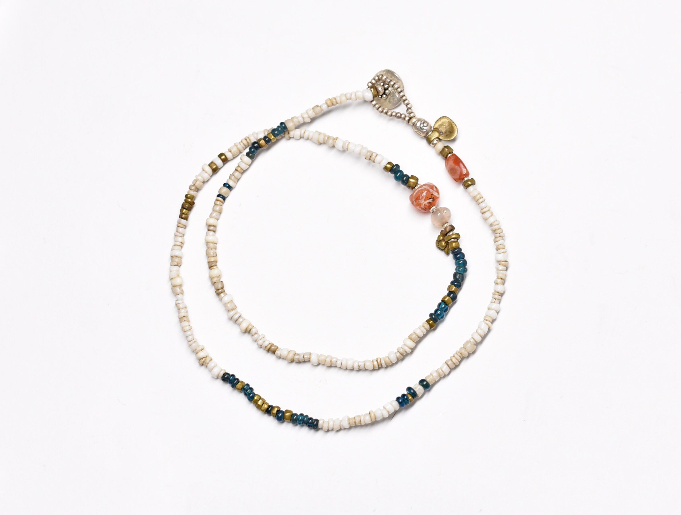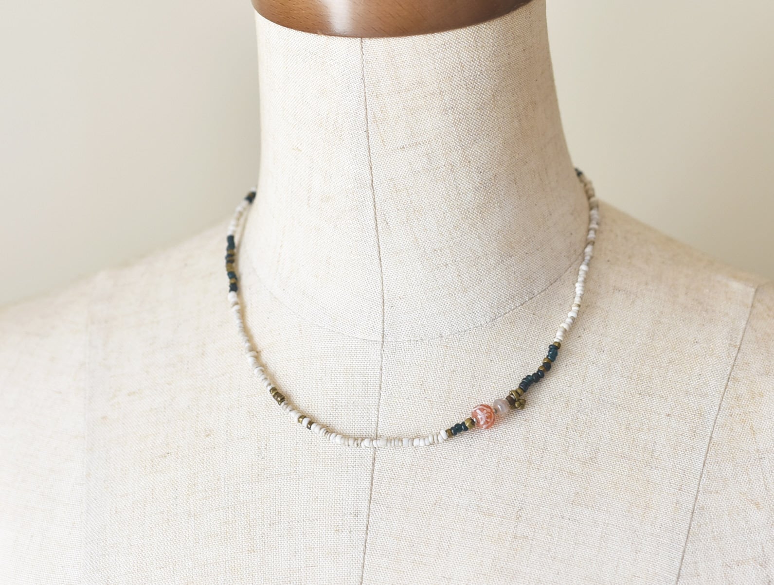 エッチドカーネリアンと古代瑪瑙、ホワイト&インディゴブルービーズ、oldオリッサブラスの華奢なネックレス
