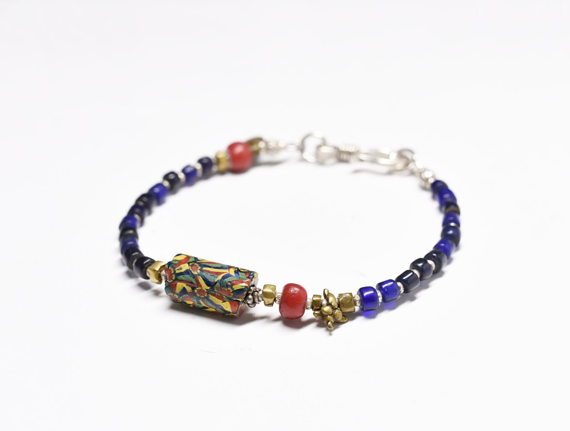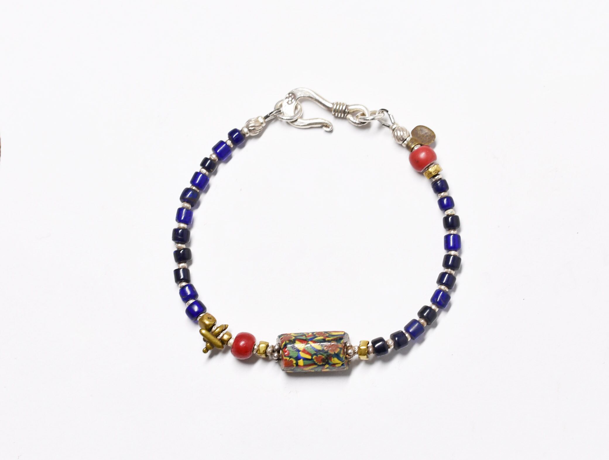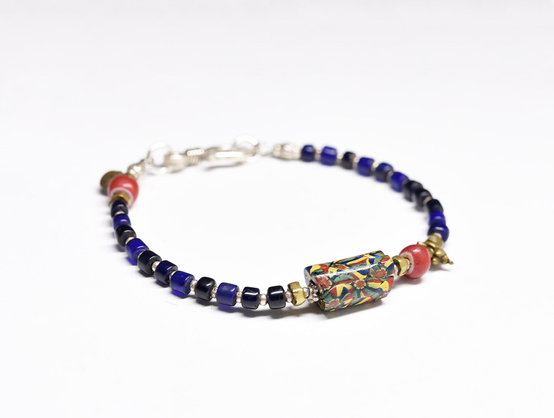 ミルフィオリ(千の華)と呼ばれるアンティークのベネチアビーズ(19~20世紀)と、金赤ホワイトハーツ、oldオリッサブラス、瑠璃色ビーズを繋いだブレスです。