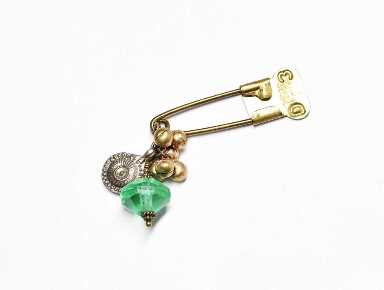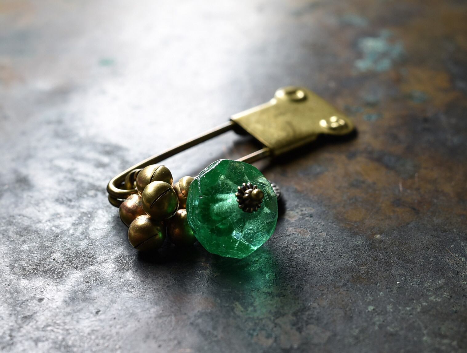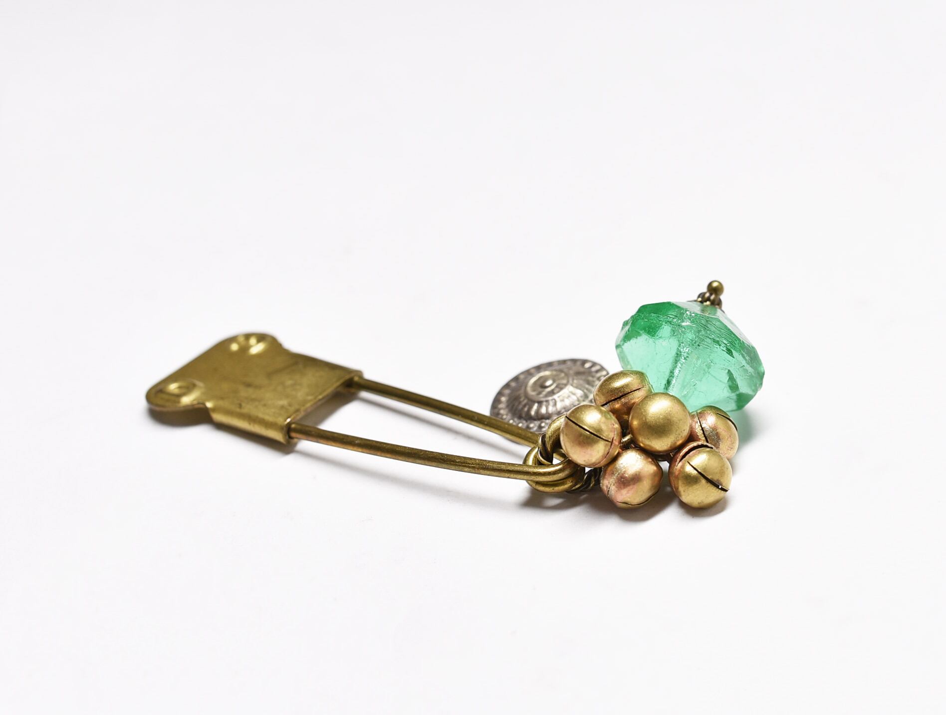 アンティークウランガラス、たわわな鈴、ズアフガニスタンのメタルパーツを繋いだランドリーピンブローチです