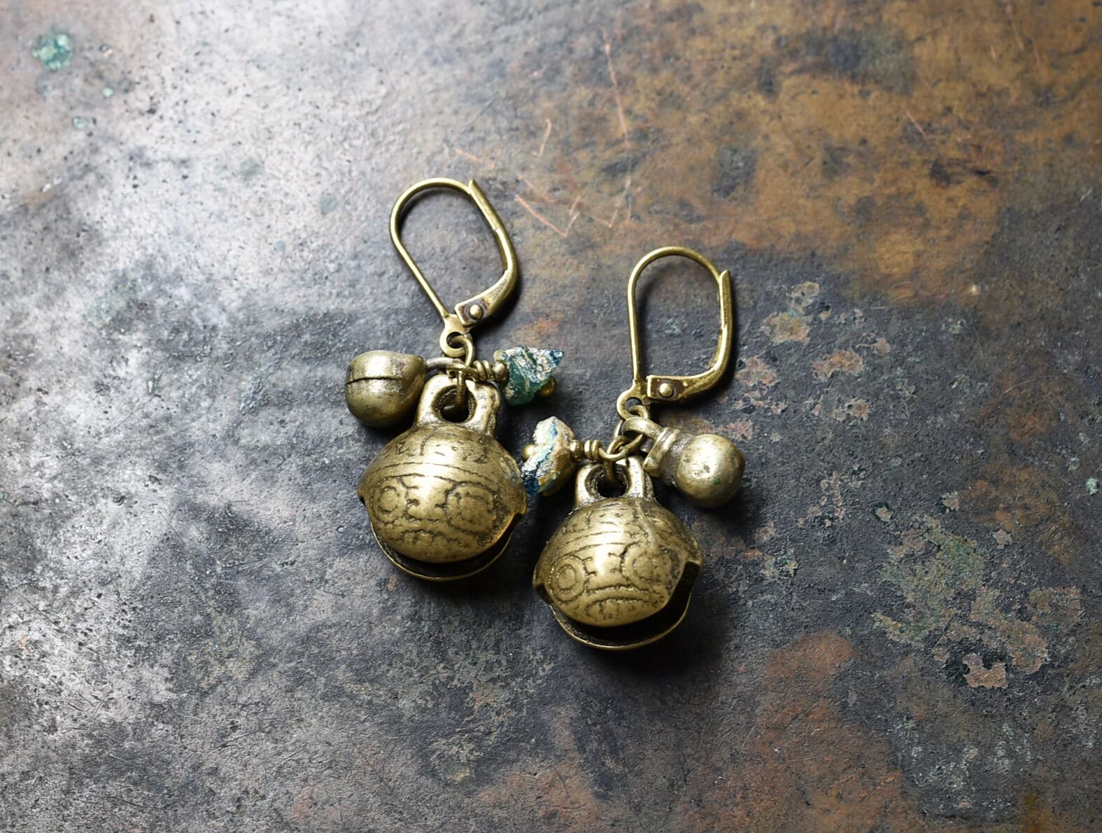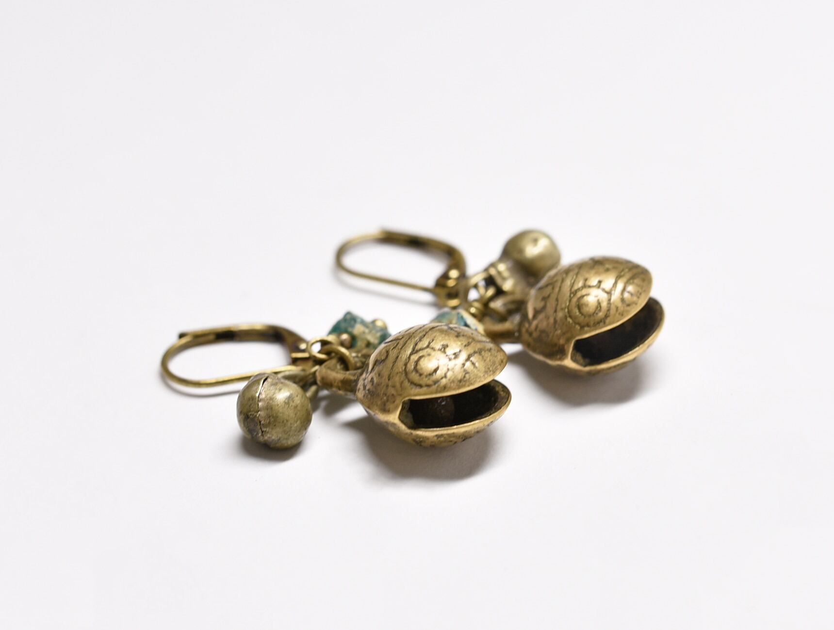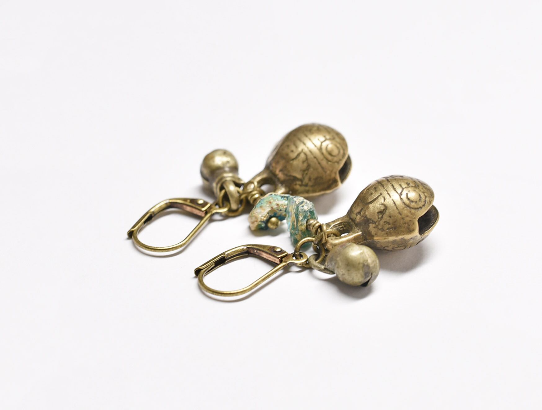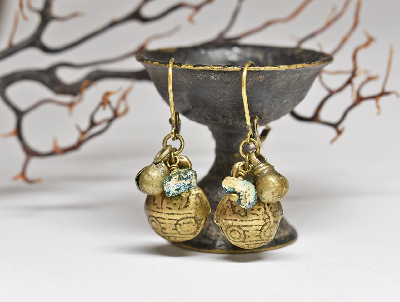 デッドストックベルと民族鈴、銀化したさざれ型のローマングラスを繋いだピアスです。