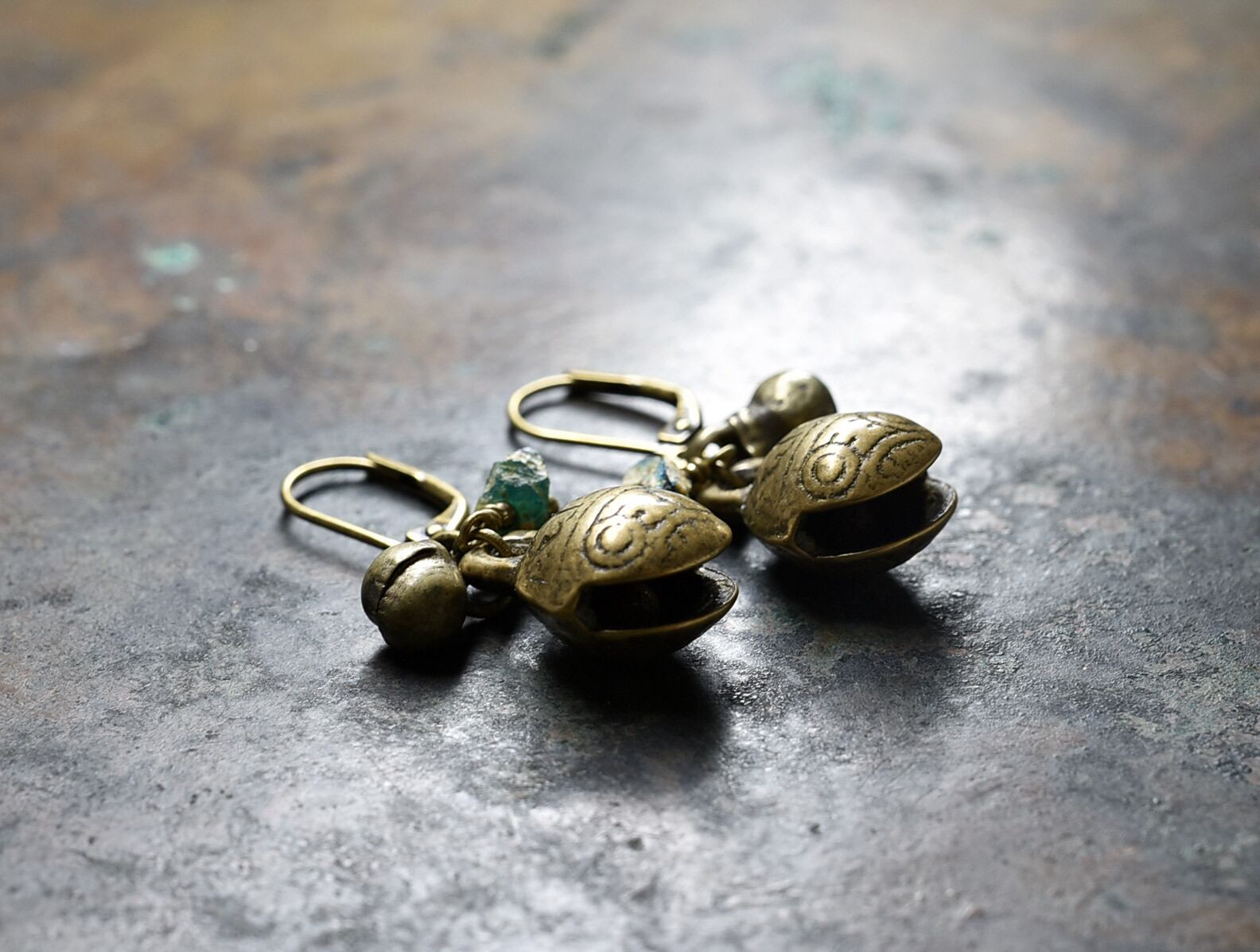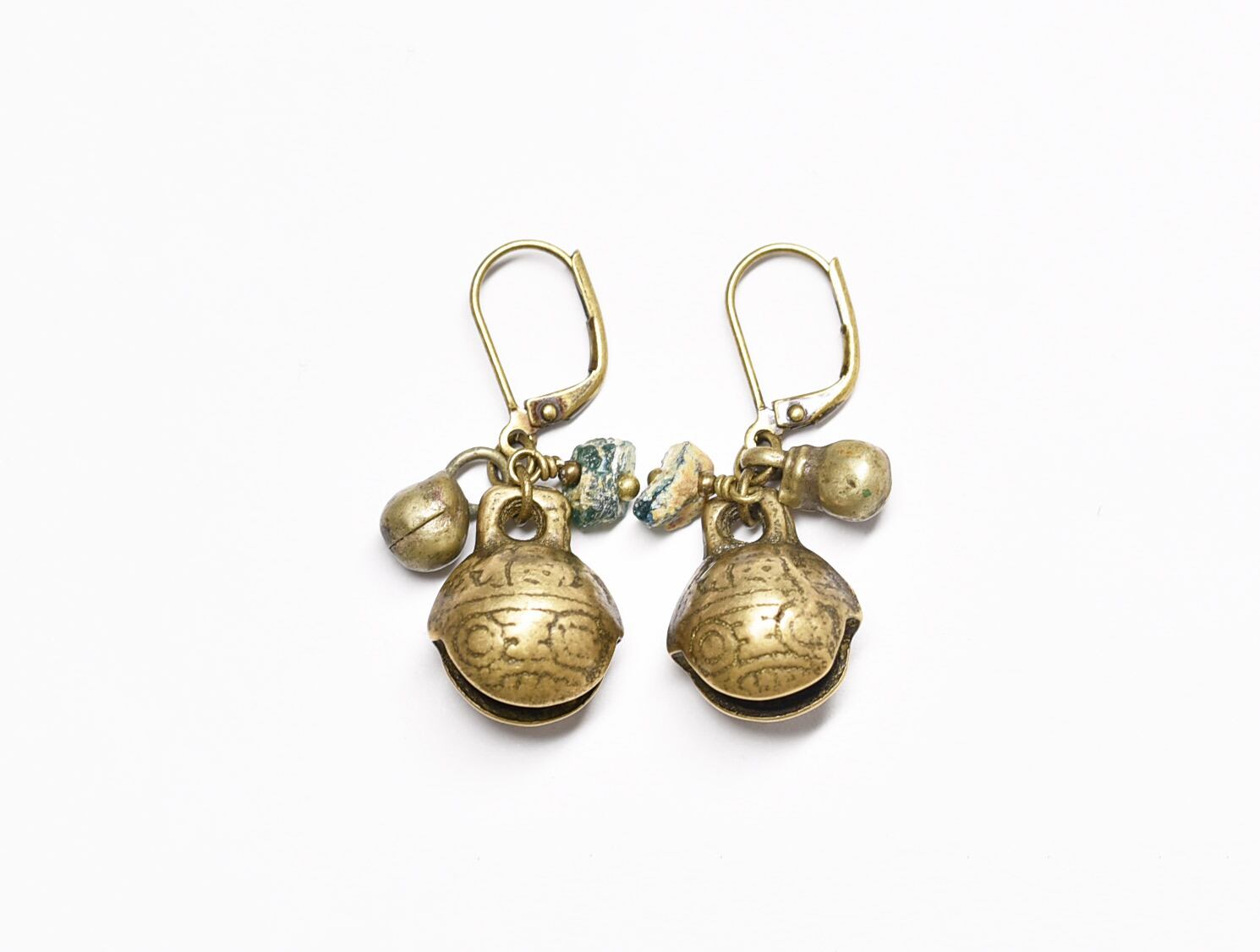 デッドストックベルと民族鈴、銀化ローマングラスのピアス