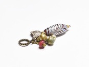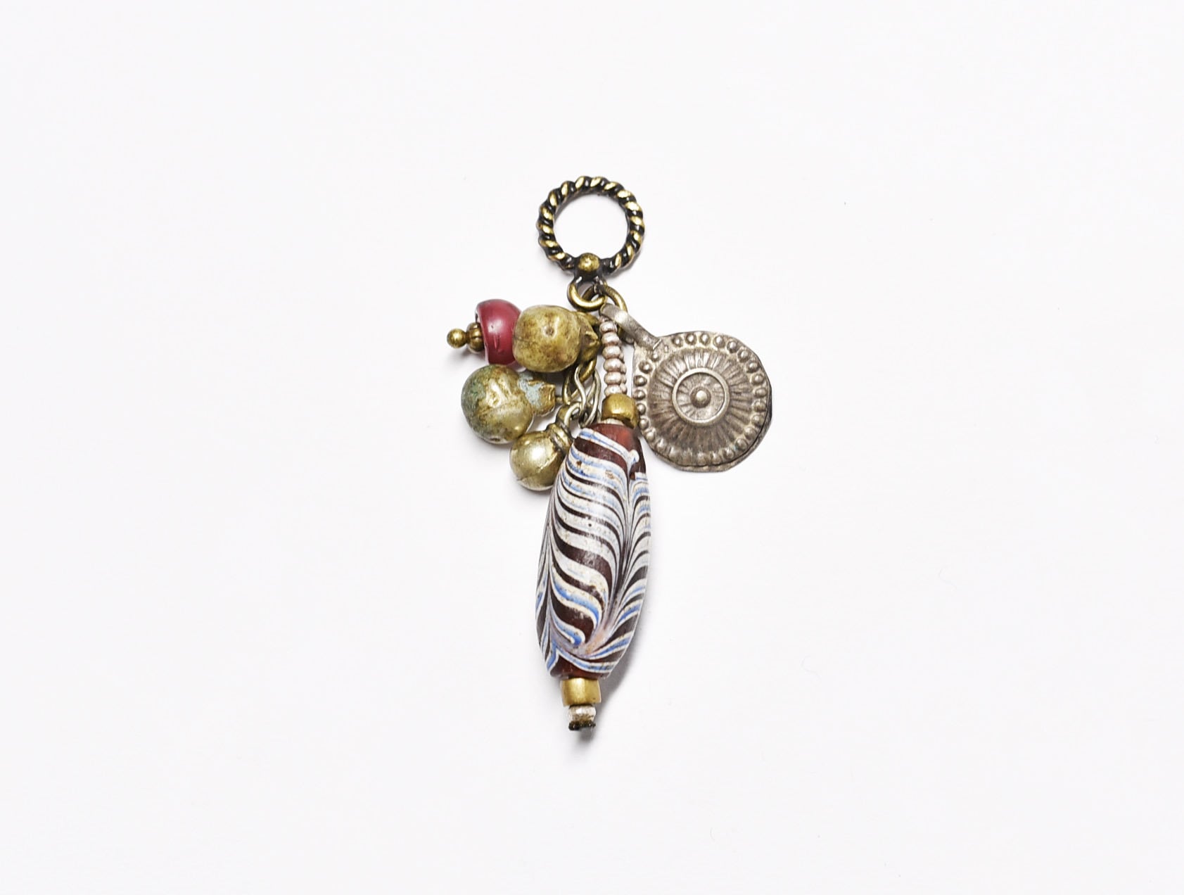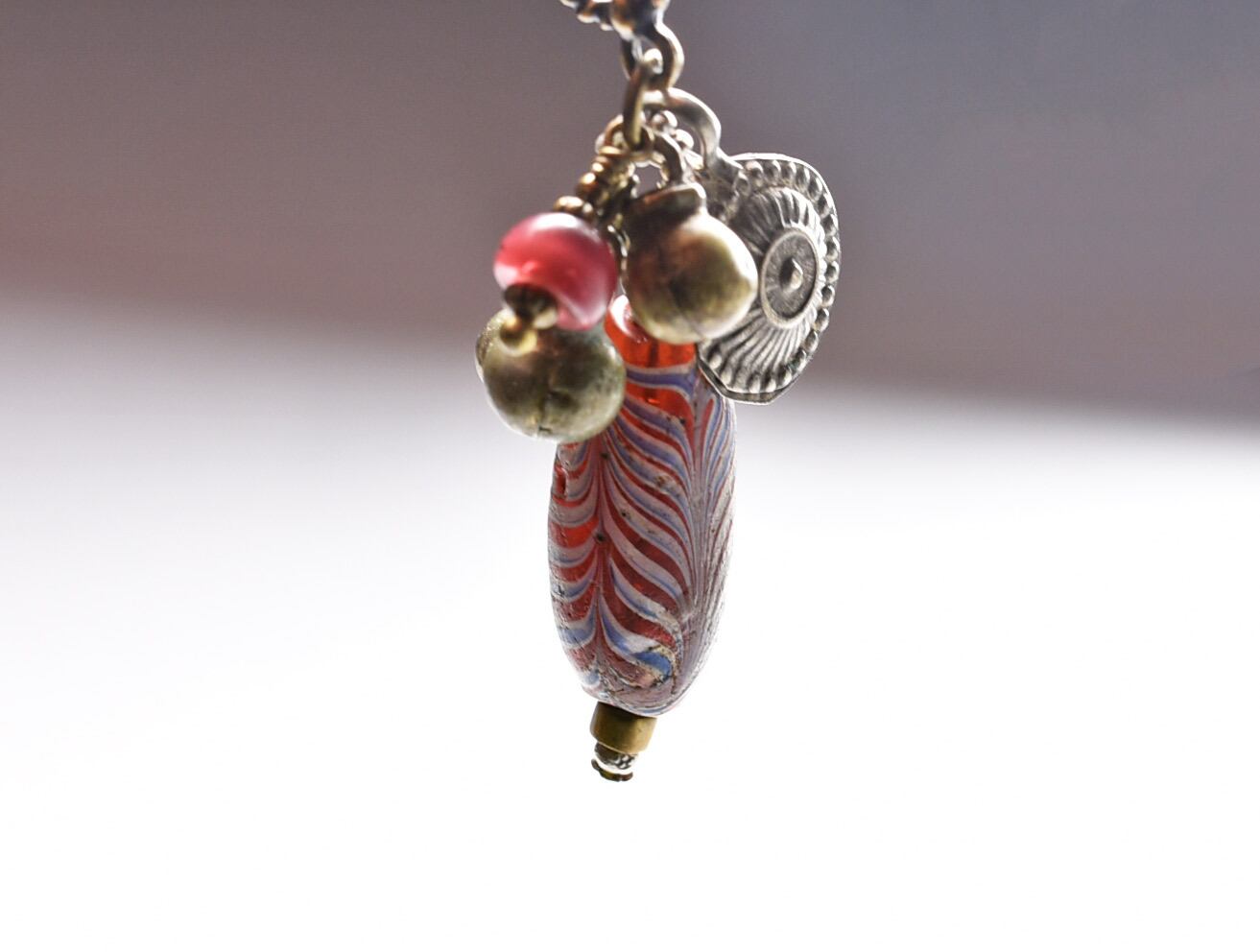 ダークレッドヴェネチアフェザービーズとアフガンメタル、鈴、金赤ホワイトハーツのペンダントトップ